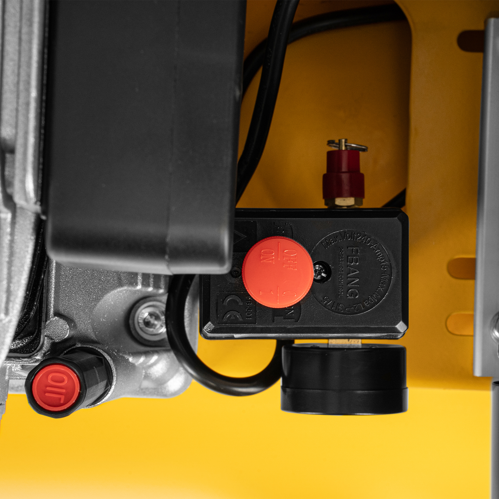 - Автономная работа — прессостат останавливает компрессор по достижении максимального рабочего давления 8 бар и запускает его, если давление падает ниже допустимого уровня.