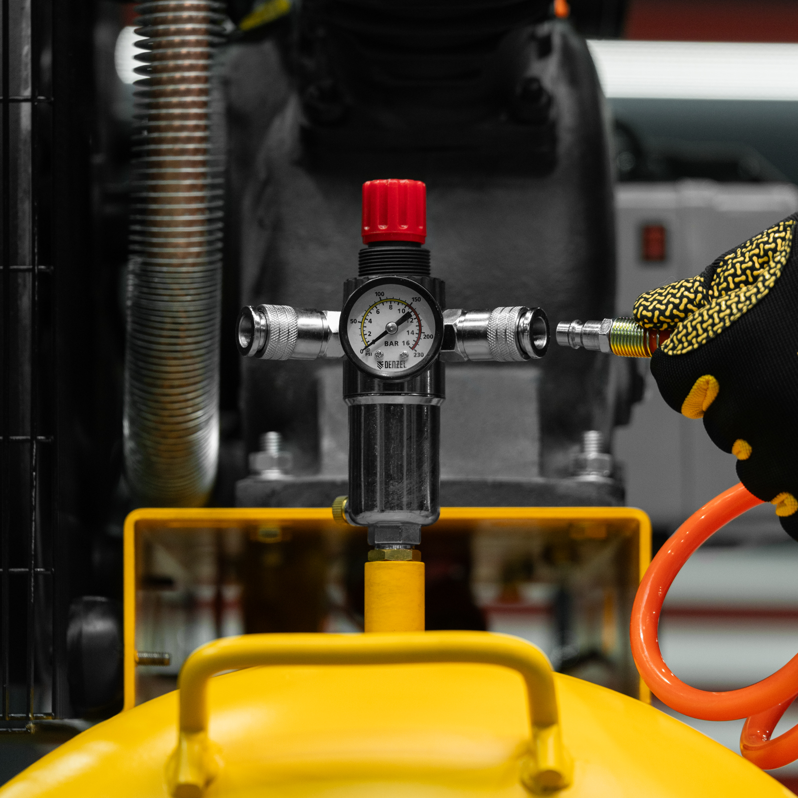 - Удобный контроль давления в ресивере и пневмомагистрали — компрессор оснащен двумя механическими манометрами.