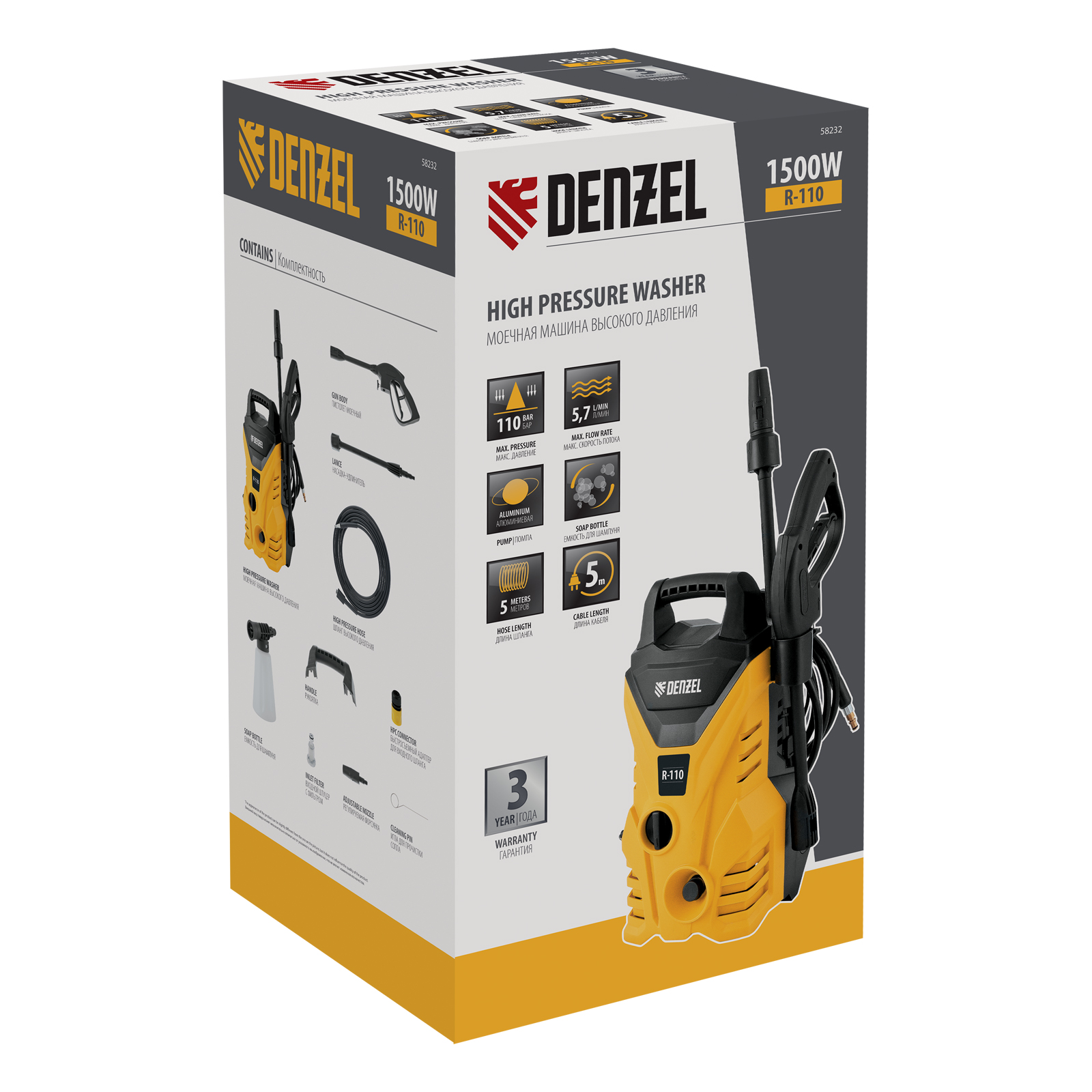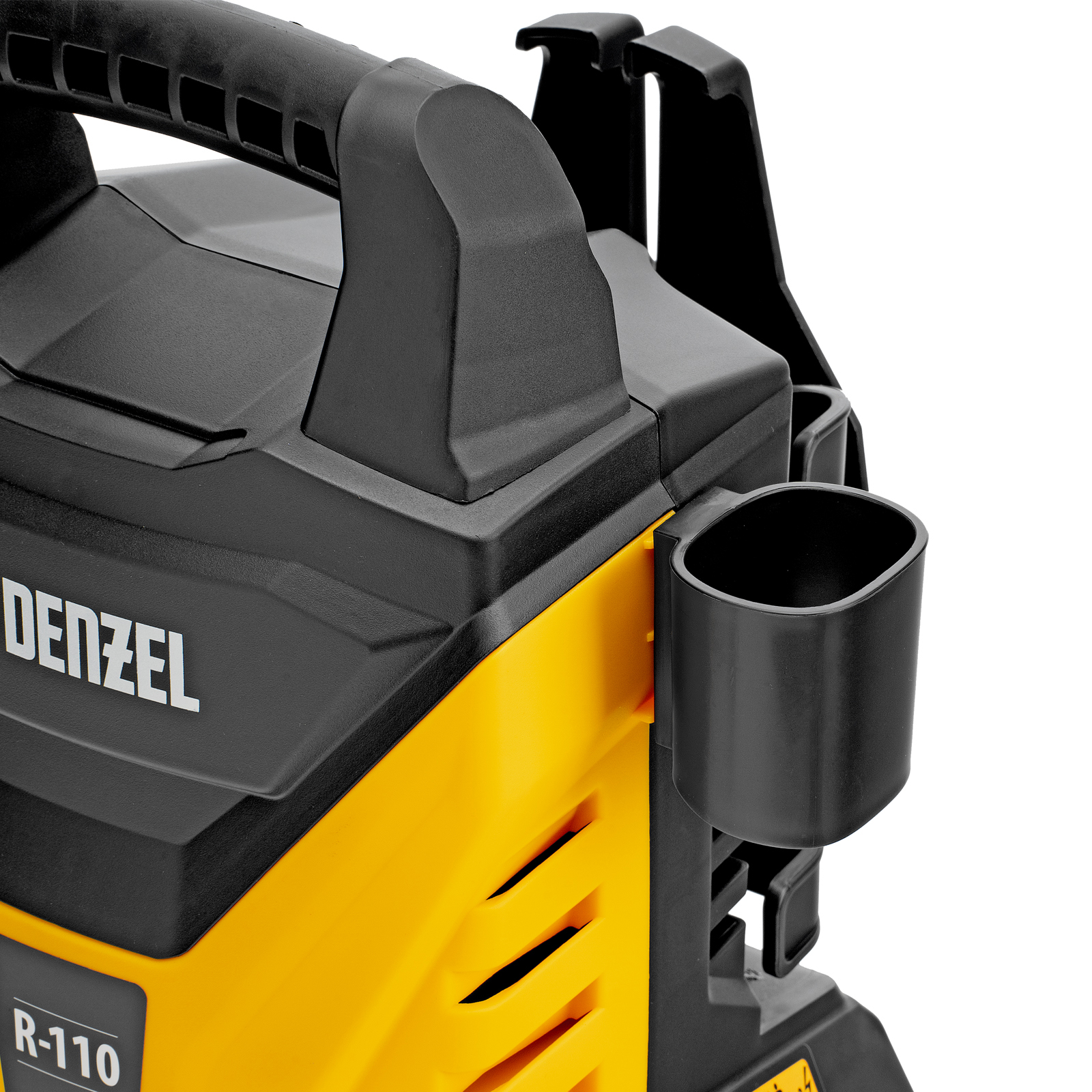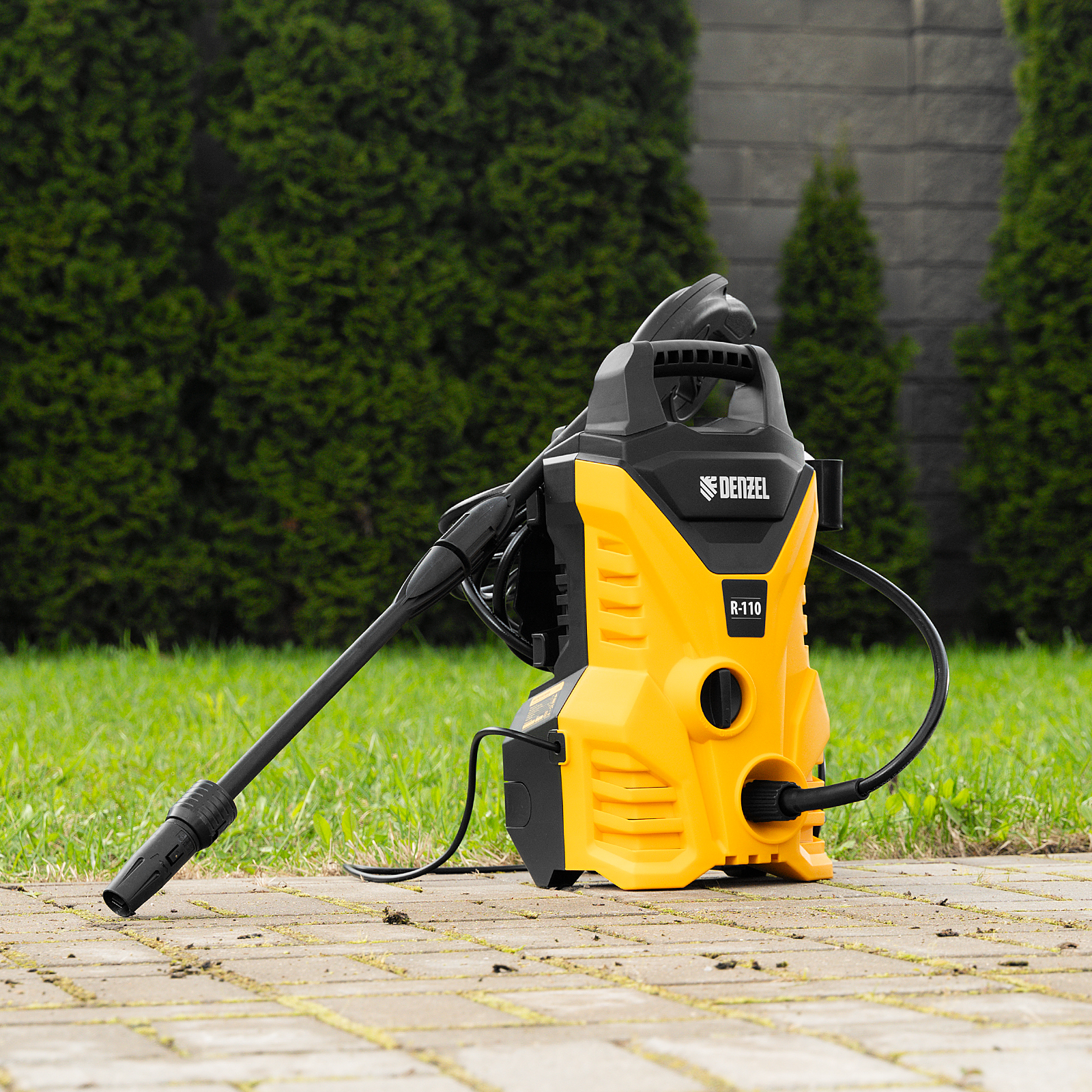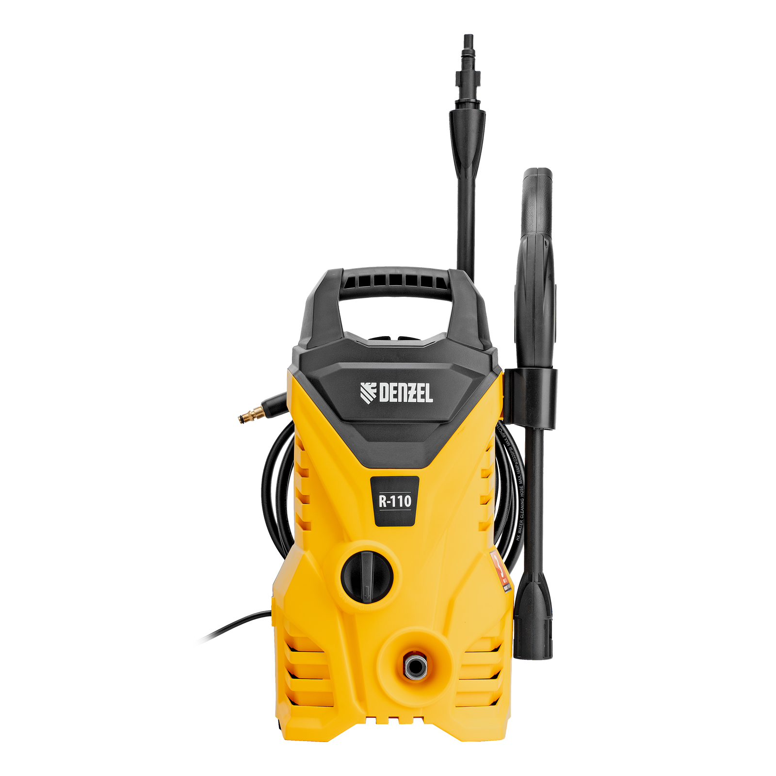 Переносная моечная машина высокого давления Denzel R-110 58232 производительностью 5,7 л/мин, мощностью 1500 Вт, с максимальным давлением 110 бар, используется для мытья автомобилей, садового инвентаря, велосипедов, дорожек и заборов. Мощный мотор и помпа высокой производительности позволяют быстро справляться даже с серьезными загрязнениями. Если нет доступа к водопроводу, мойка может осуществлять забор воды из резервуара в режиме самовсасывания, теряя при этом всего 5% давления.