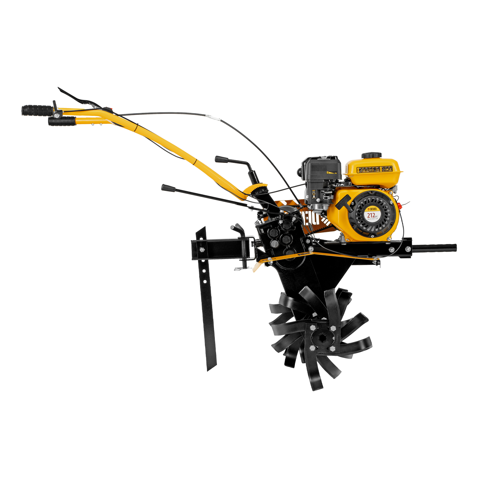 Мотоблок Denzel DPT-370S 56443 мощностью 7 л. с., с 24 фрезами (3 х 4 с каждой стороны), шкивом отбора мощности (ШОМ), количеством передач 3 вперед/1 назад, предназначен для рыхления, боронования, выравнивания почвы, прополки и выполнения других сельскохозяйственных работ на огородных и садовых участках при температуре от -15 до +40 ℃. Максимальная ширина обработки достигает 1000 мм, максимальная глубина — 350 мм.