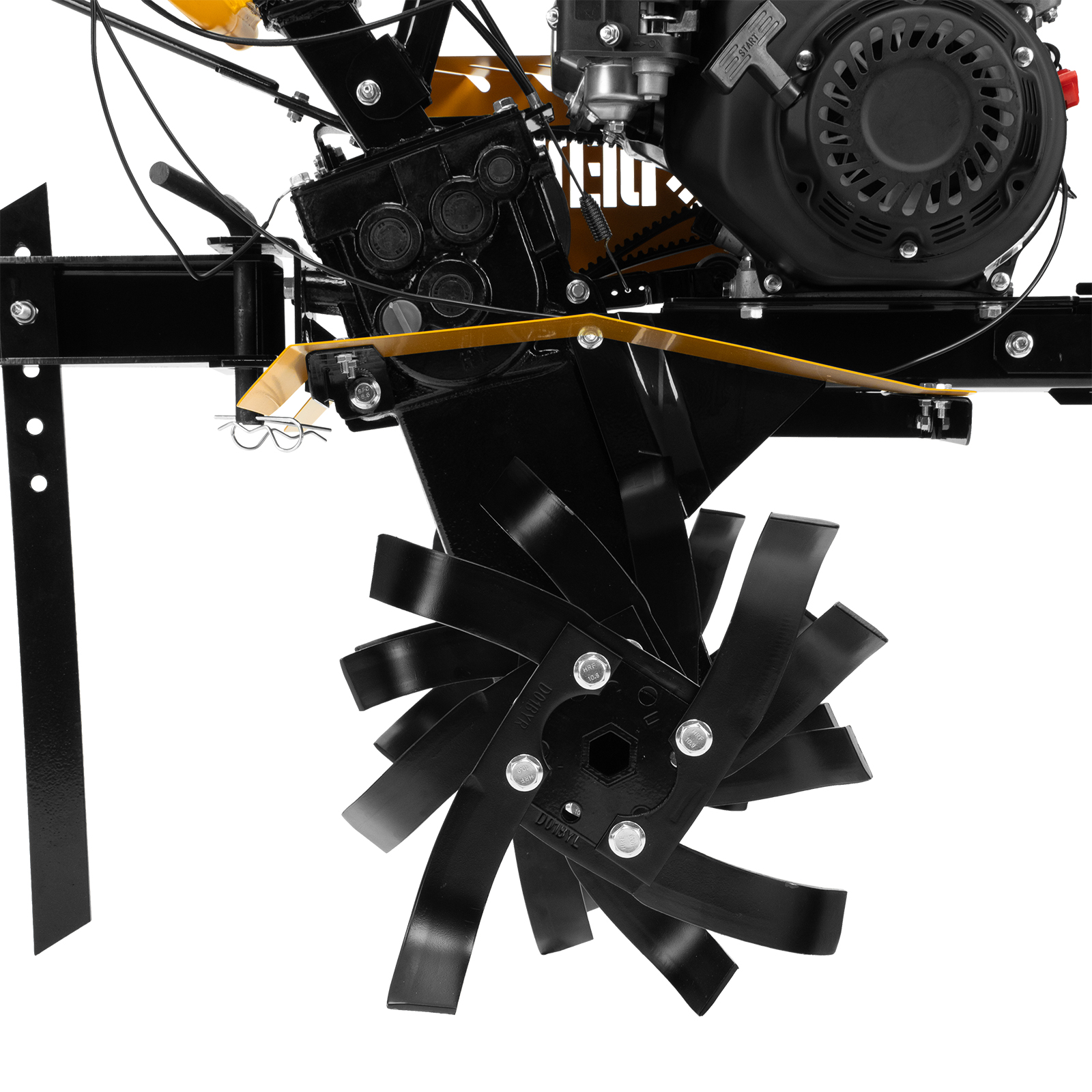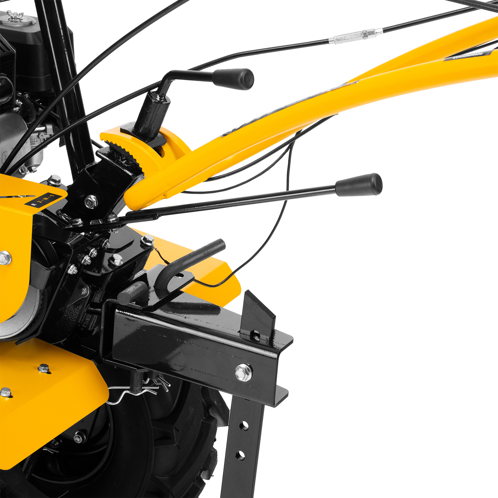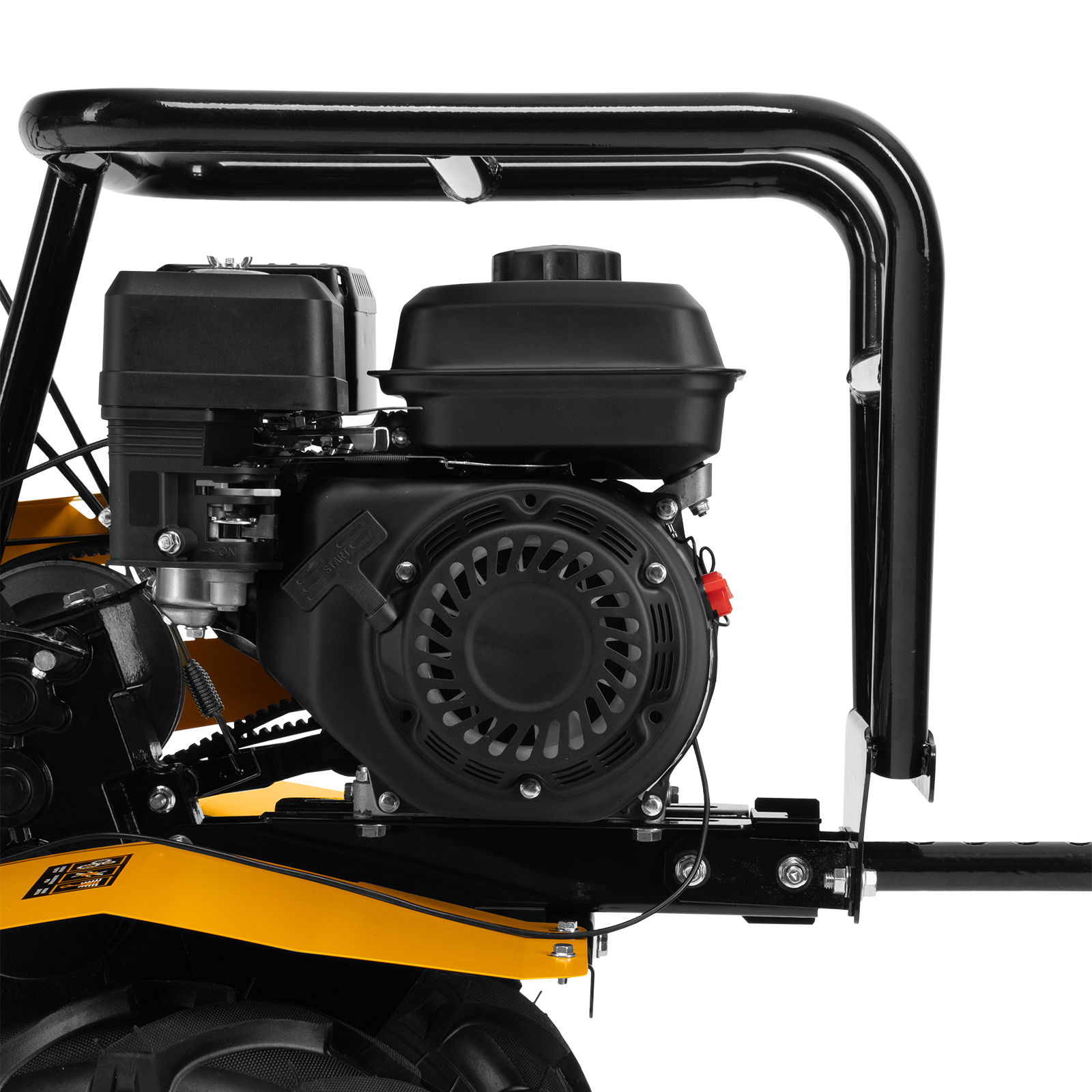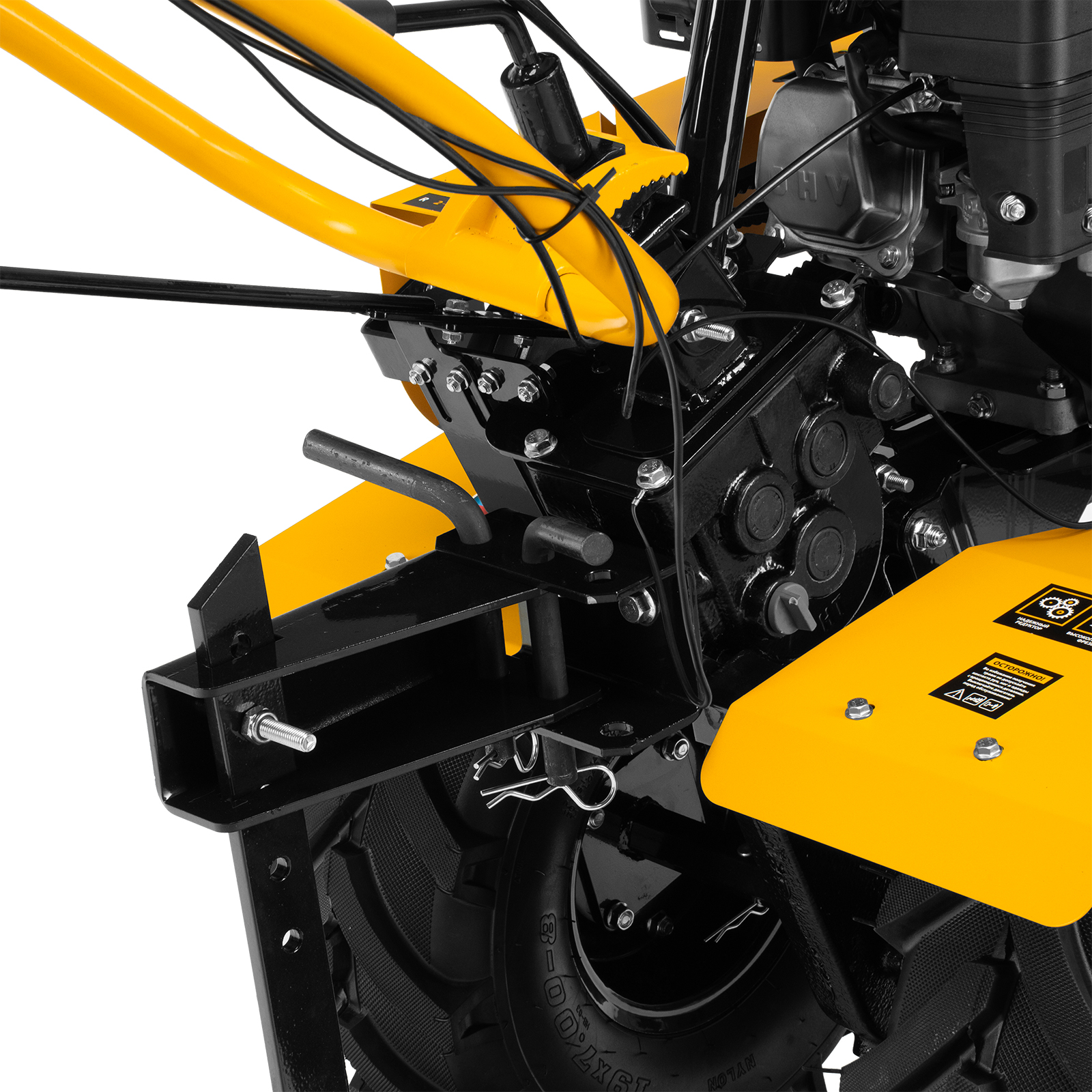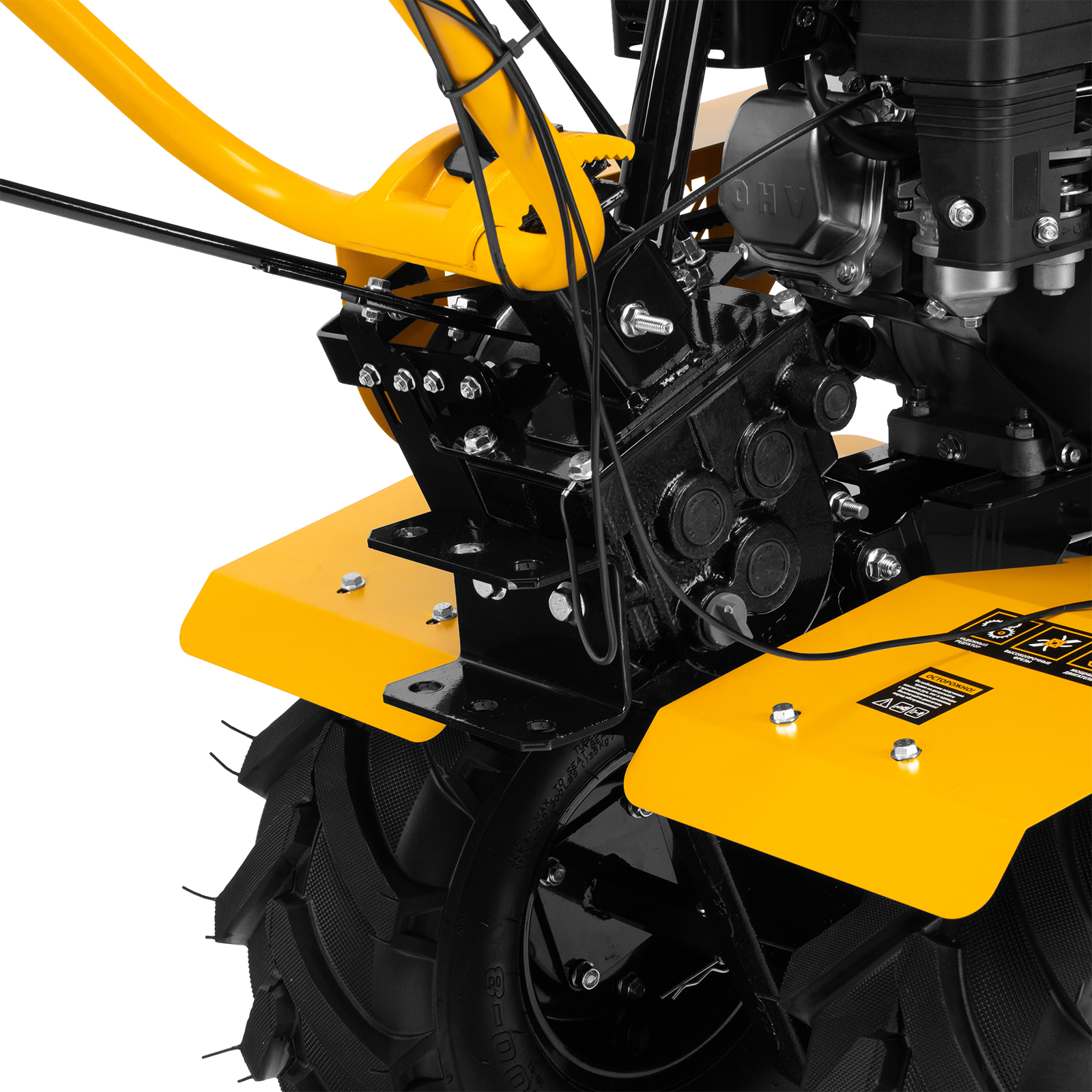 - Усиленная рама — ключевые узлы надежно защищены, мотоблок удобно транспортировать.