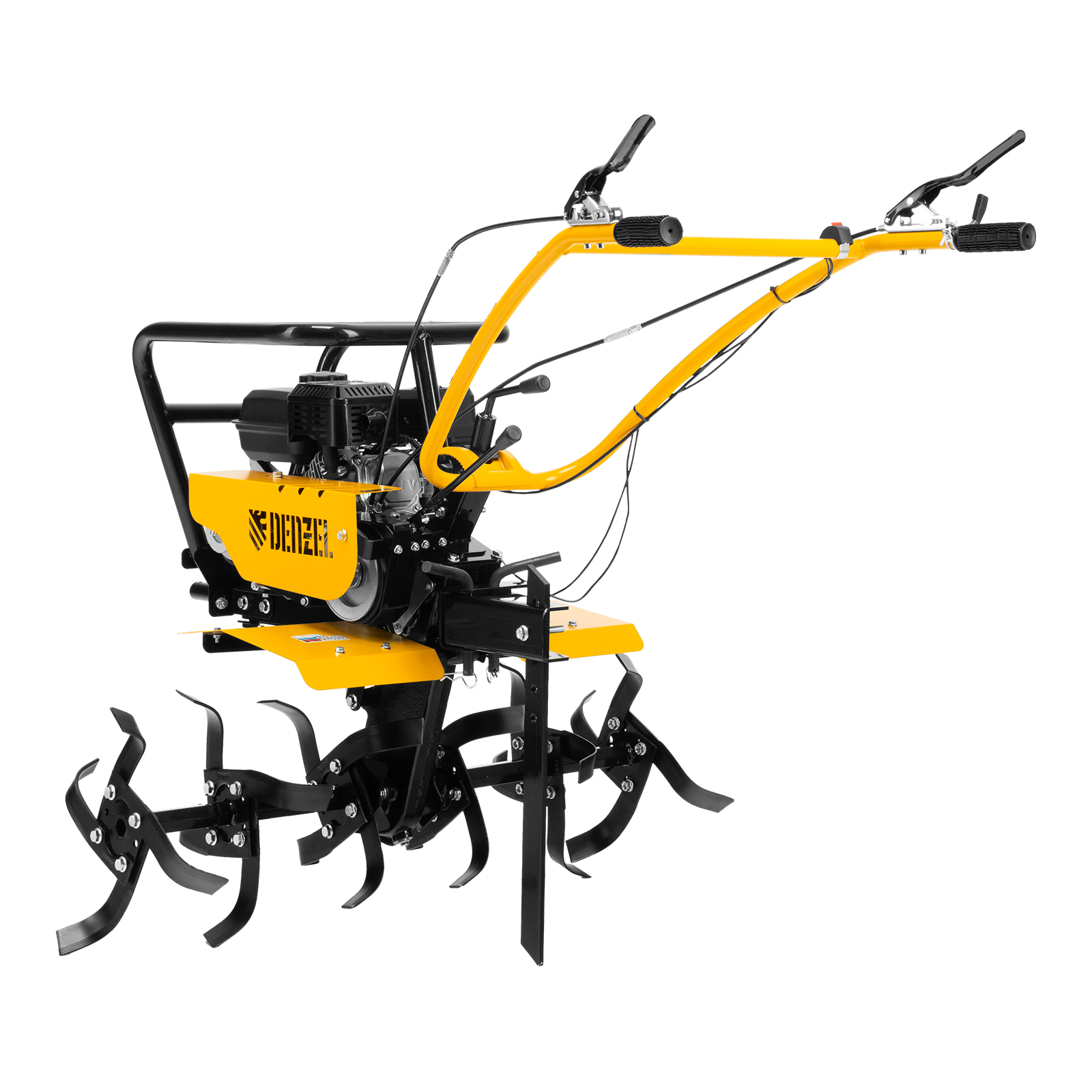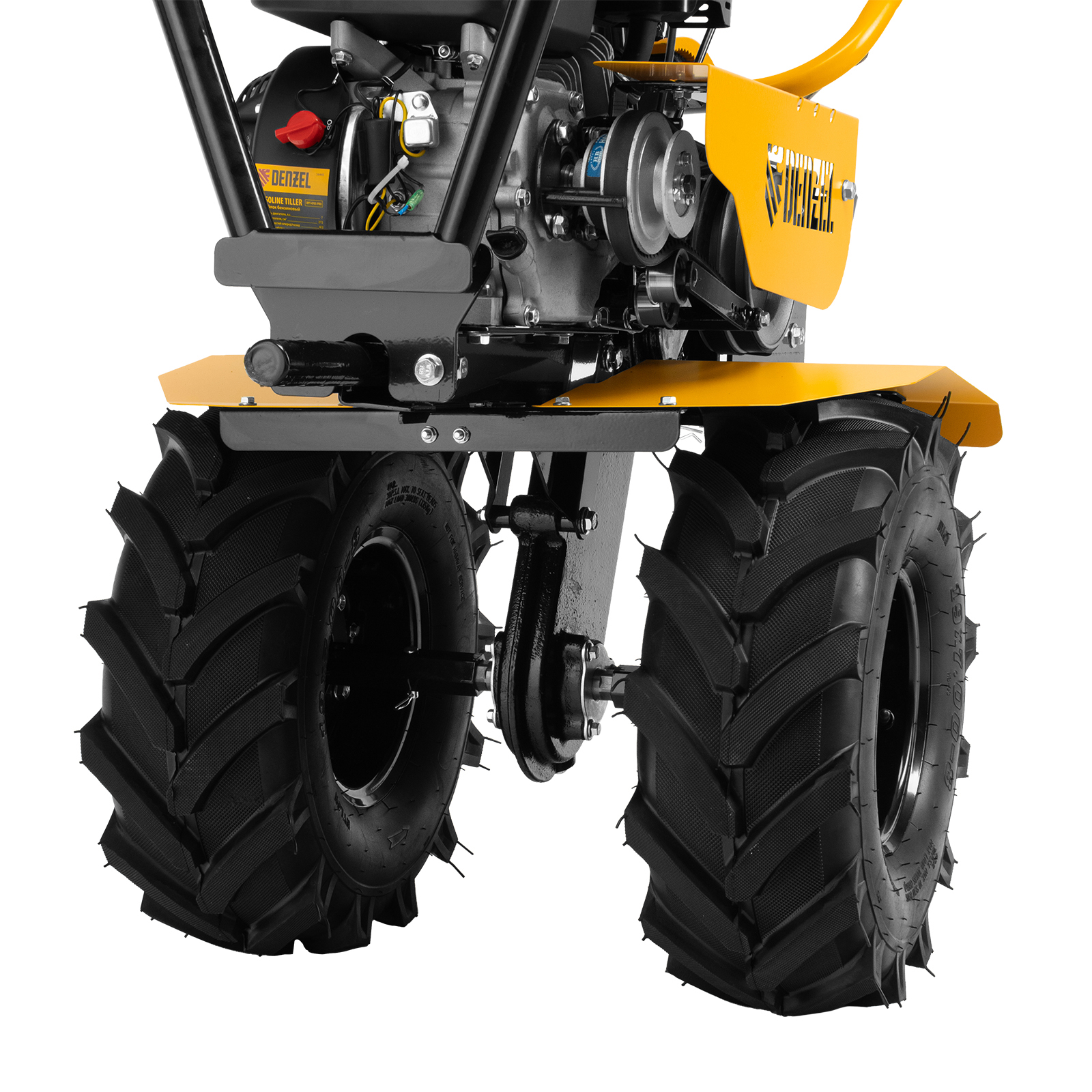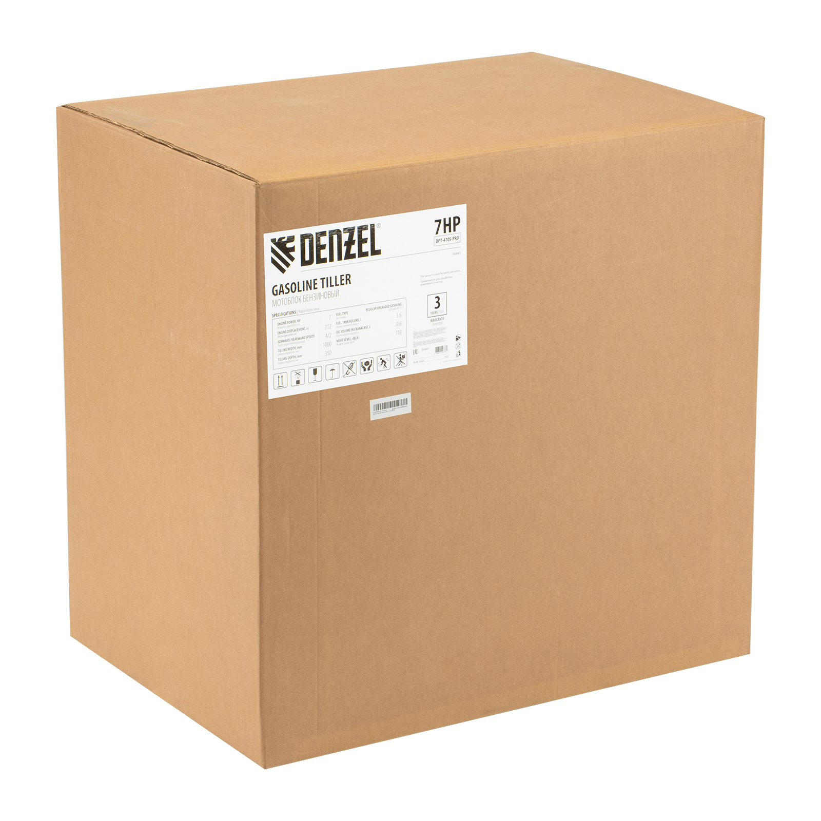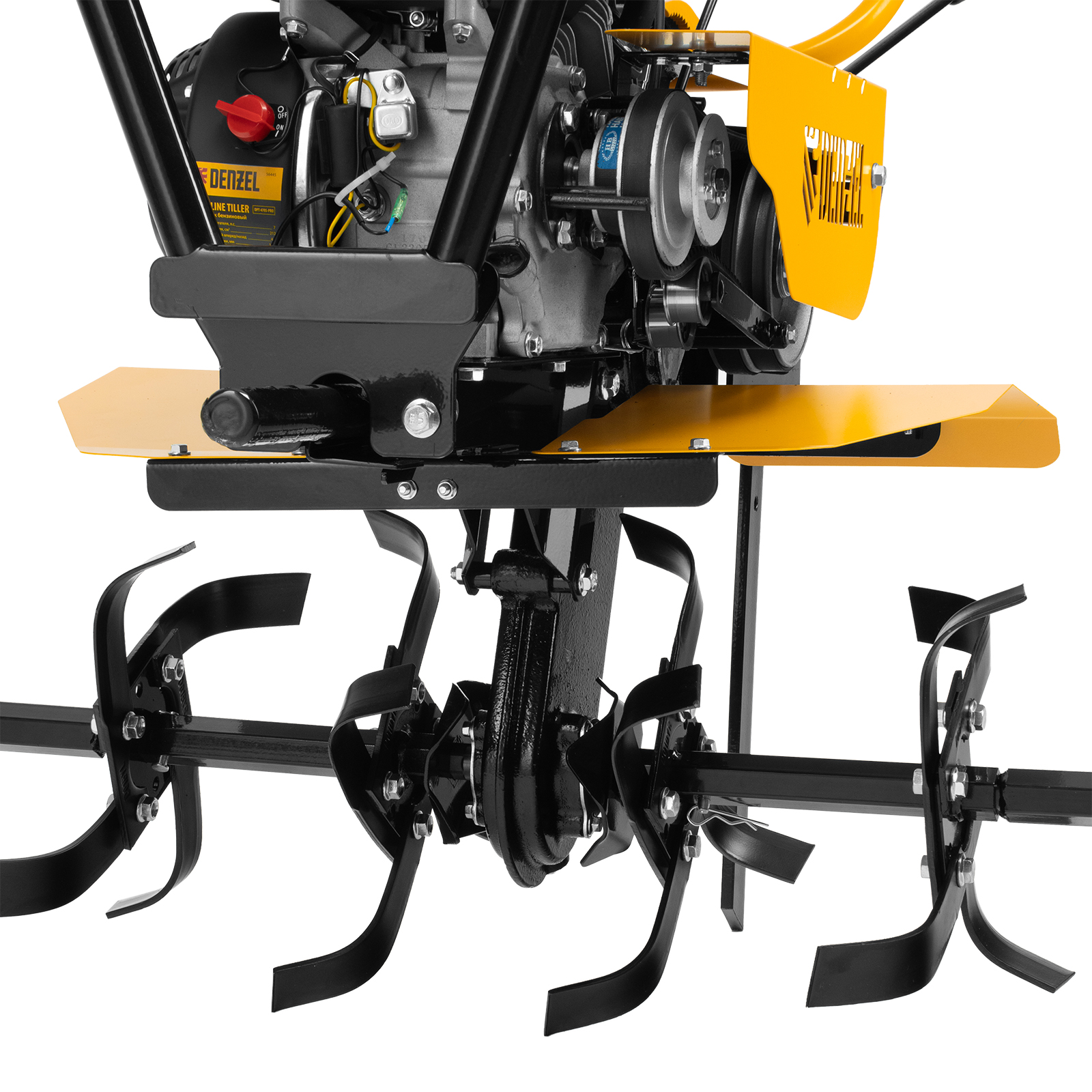 Мотоблок Denzel DPT-470S-PRO 56445 с ременным сцеплением, двигателем объемом 212 см3 и мощностью 7 л.с., с коробкой передач 4 вперед/2 назад и шкивом отбора мощности, комплектуется 24 фрезами (3х4). Предназначен для выполнения земляных работ: прополки, вспахивания, боронования грунта, перевозки грузов и т.д.