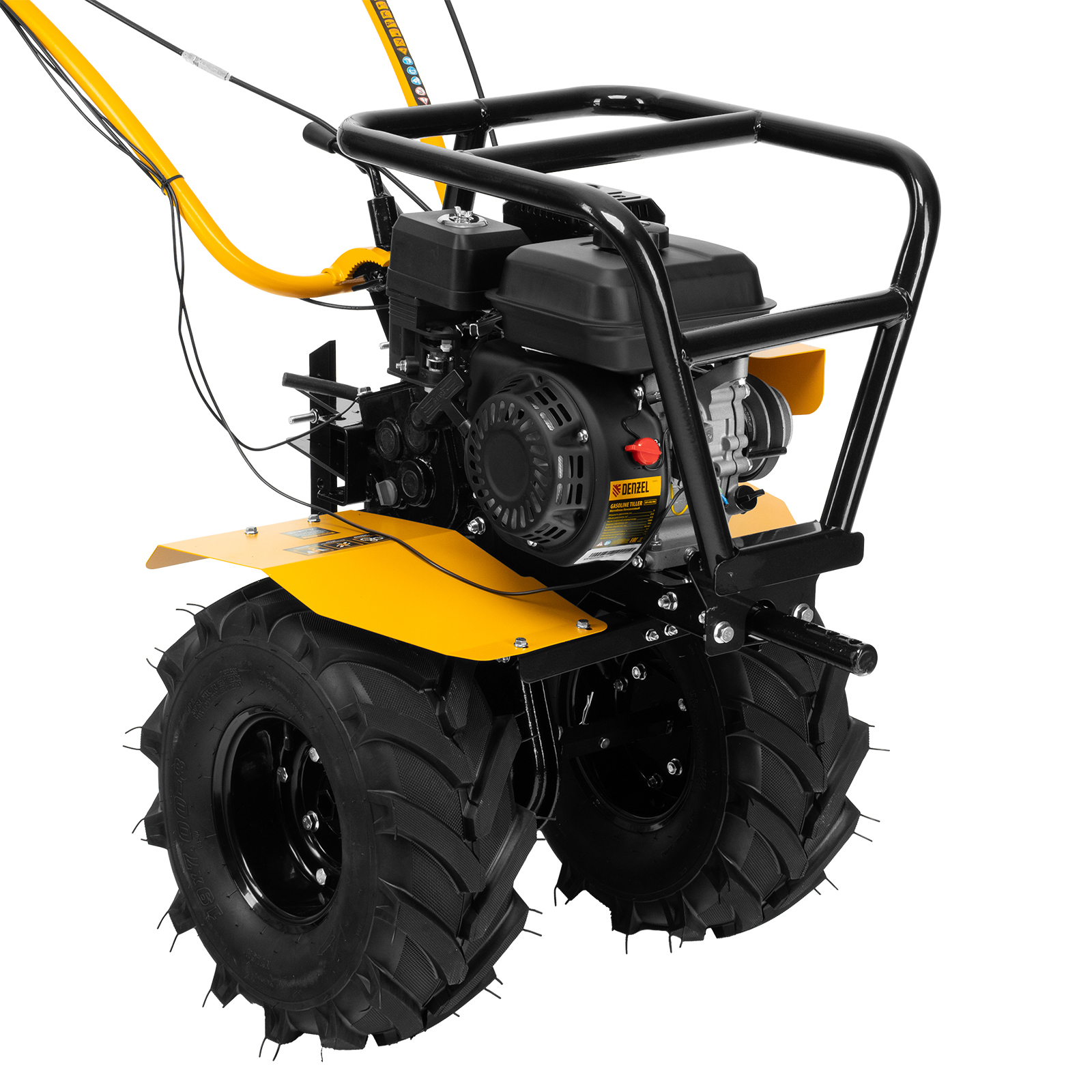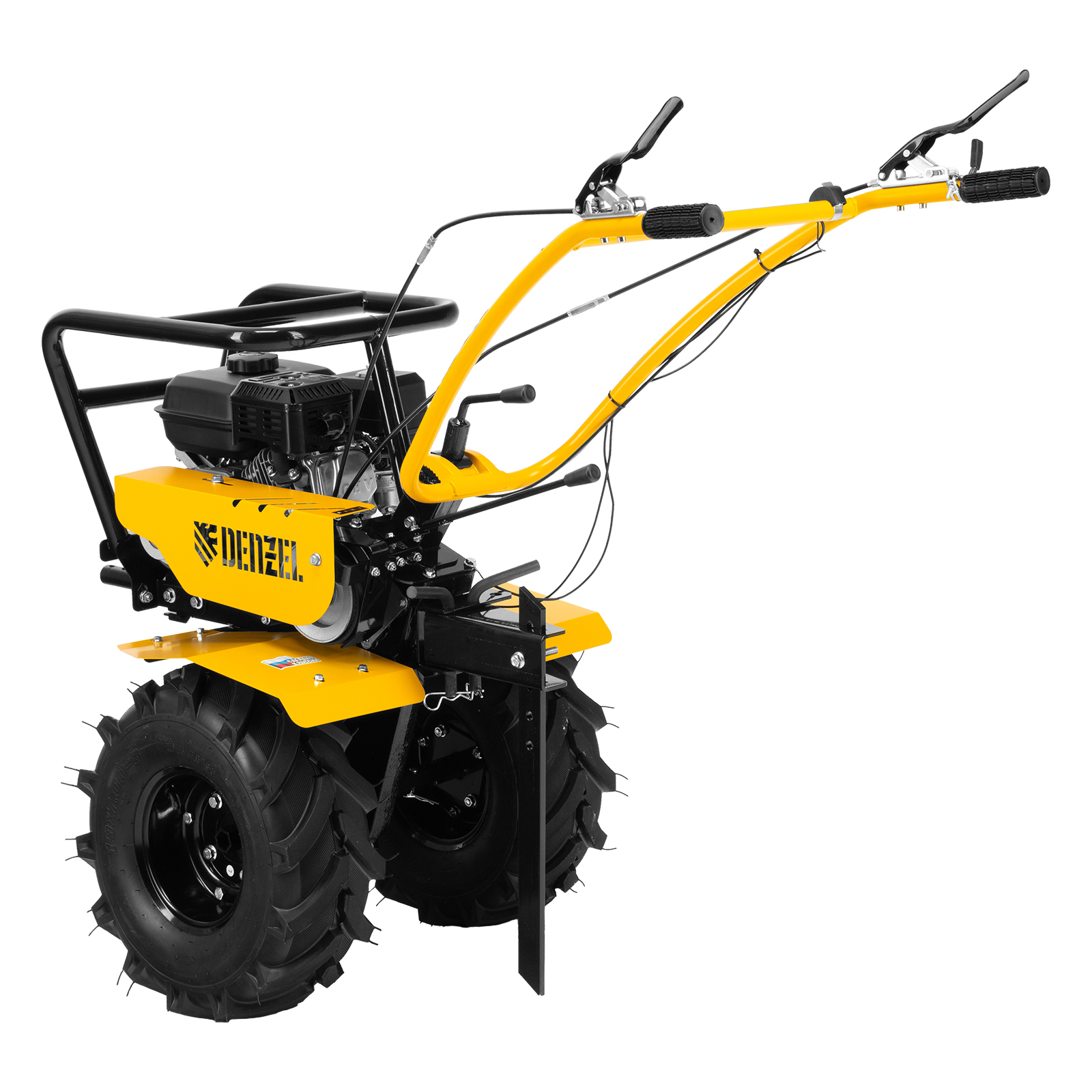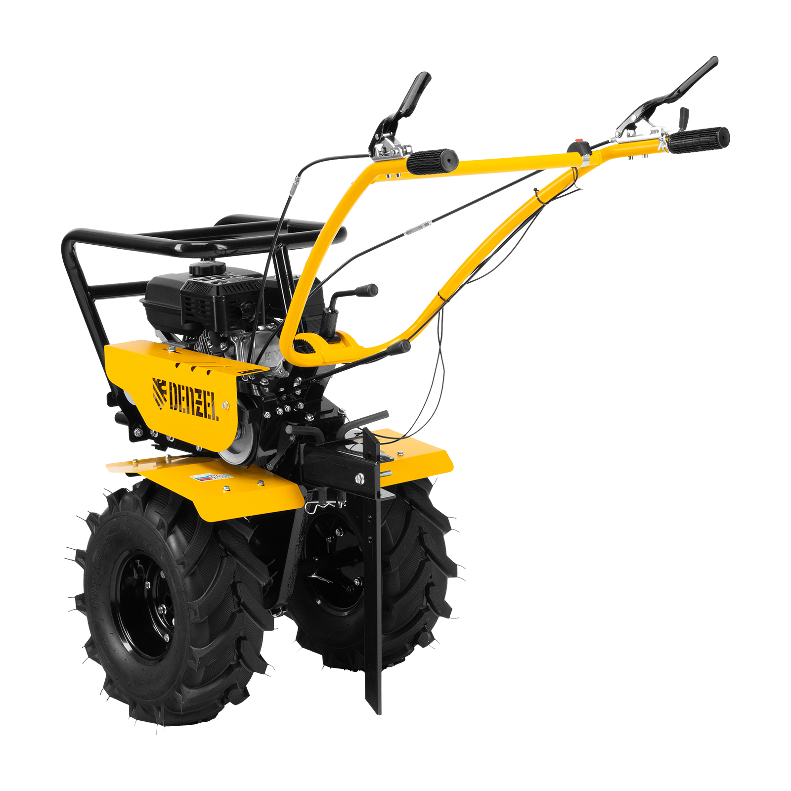 Мотоблок Denzel DPT-470S-PRO 56445 с ременным сцеплением, двигателем объемом 212 см3 и мощностью 7 л.с., с коробкой передач 4 вперед/2 назад и шкивом отбора мощности, комплектуется 24 фрезами (3х4). Предназначен для выполнения земляных работ: прополки, вспахивания, боронования грунта, перевозки грузов и т.д.