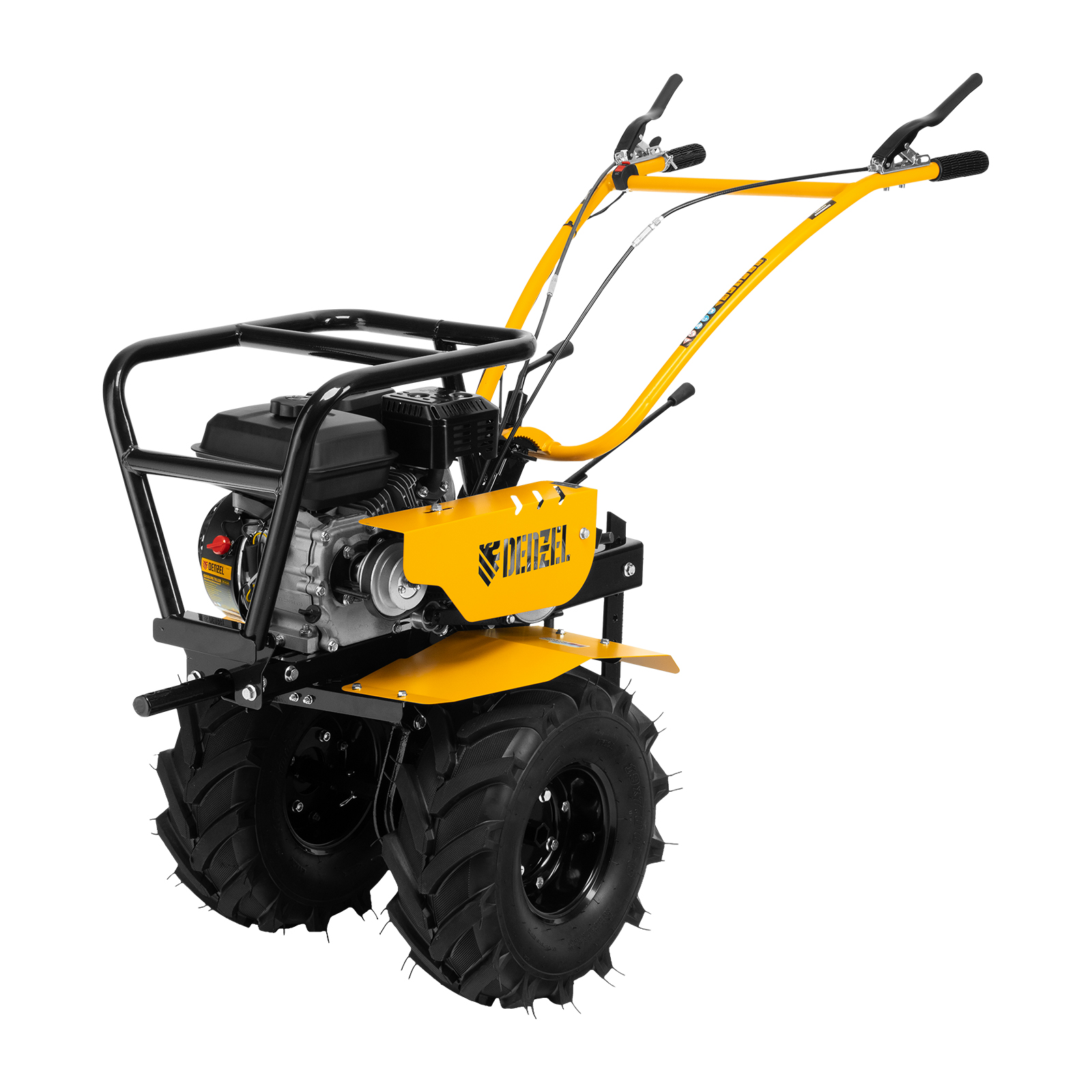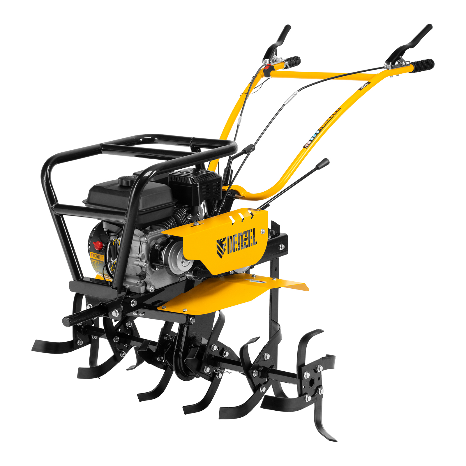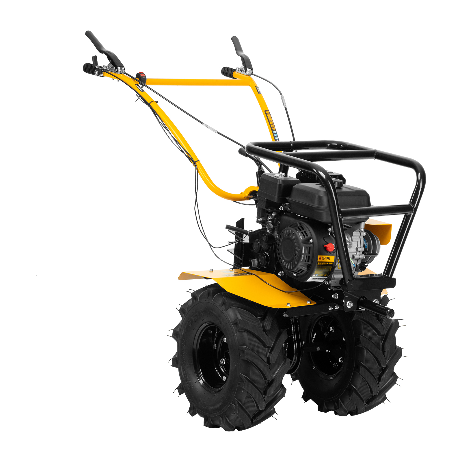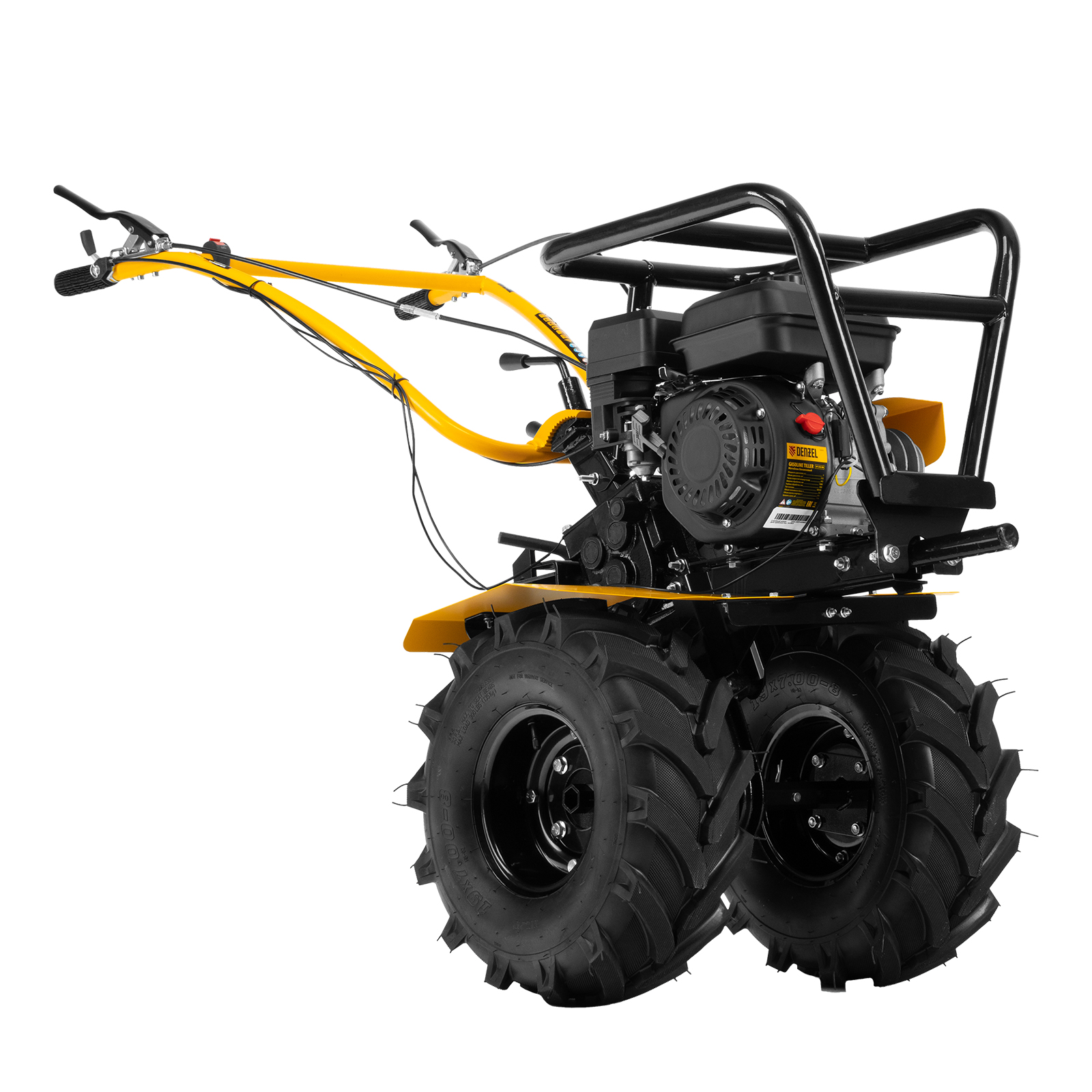 Мотоблок Denzel DPT-470S-PRO 56445 с ременным сцеплением, двигателем объемом 212 см3 и мощностью 7 л.с., с коробкой передач 4 вперед/2 назад и шкивом отбора мощности, комплектуется 24 фрезами (3х4). Предназначен для выполнения земляных работ: прополки, вспахивания, боронования грунта, перевозки грузов и т.д.