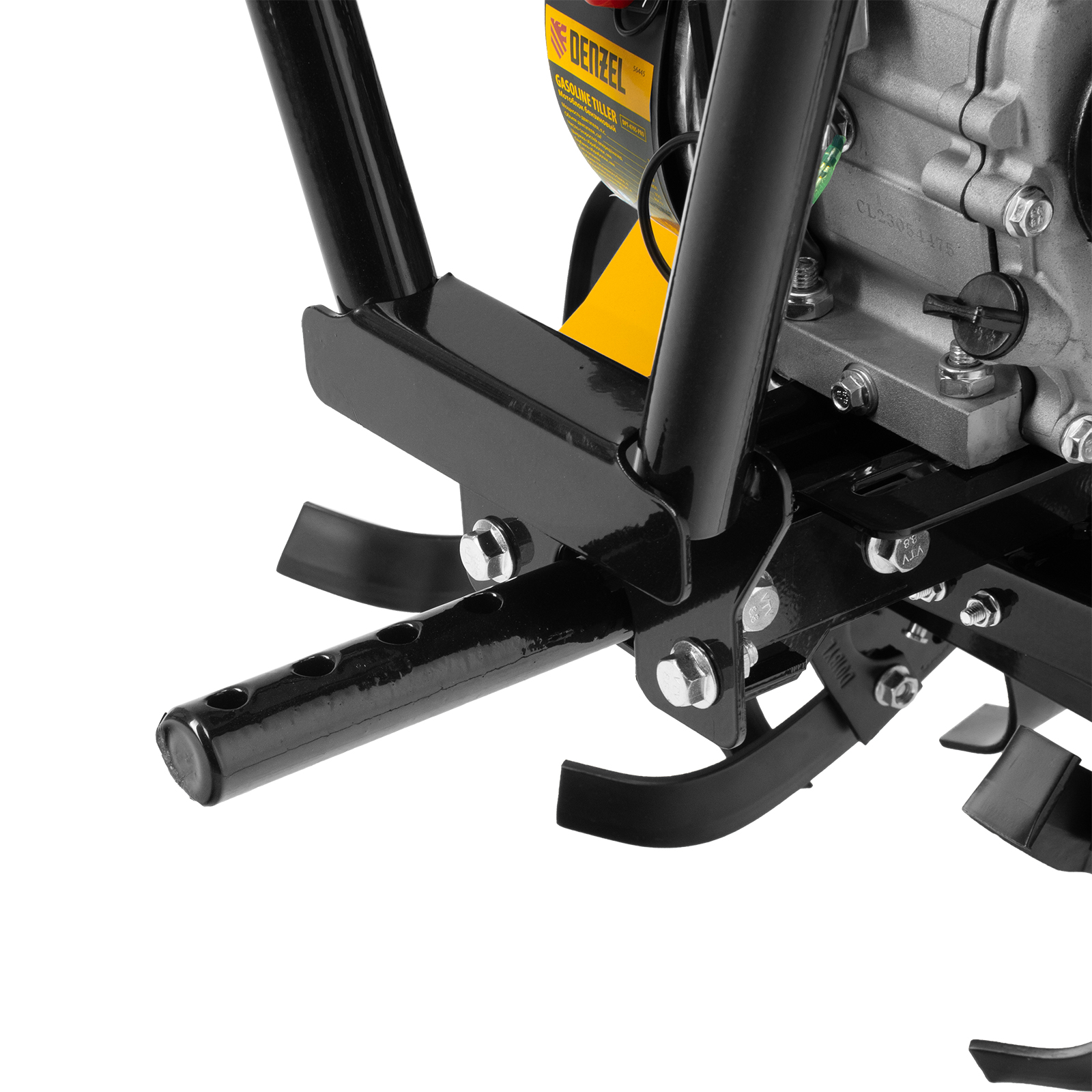 Передний кронштейн диаметром 30 мм позволяет размещать навесное оборудование: грунтозацепы, удлинители осей, картофелевыкапыватель, окучник, плуг или другое. Это позволяет существенно расширить возможности мотоблока и избежать дополнительных расходов на приобретение сельскохозяйственной техники. Мотоблок совместим со всеми моделями навесного оборудования, представленными в ассортименте Denzel (приобретаются отдельно).