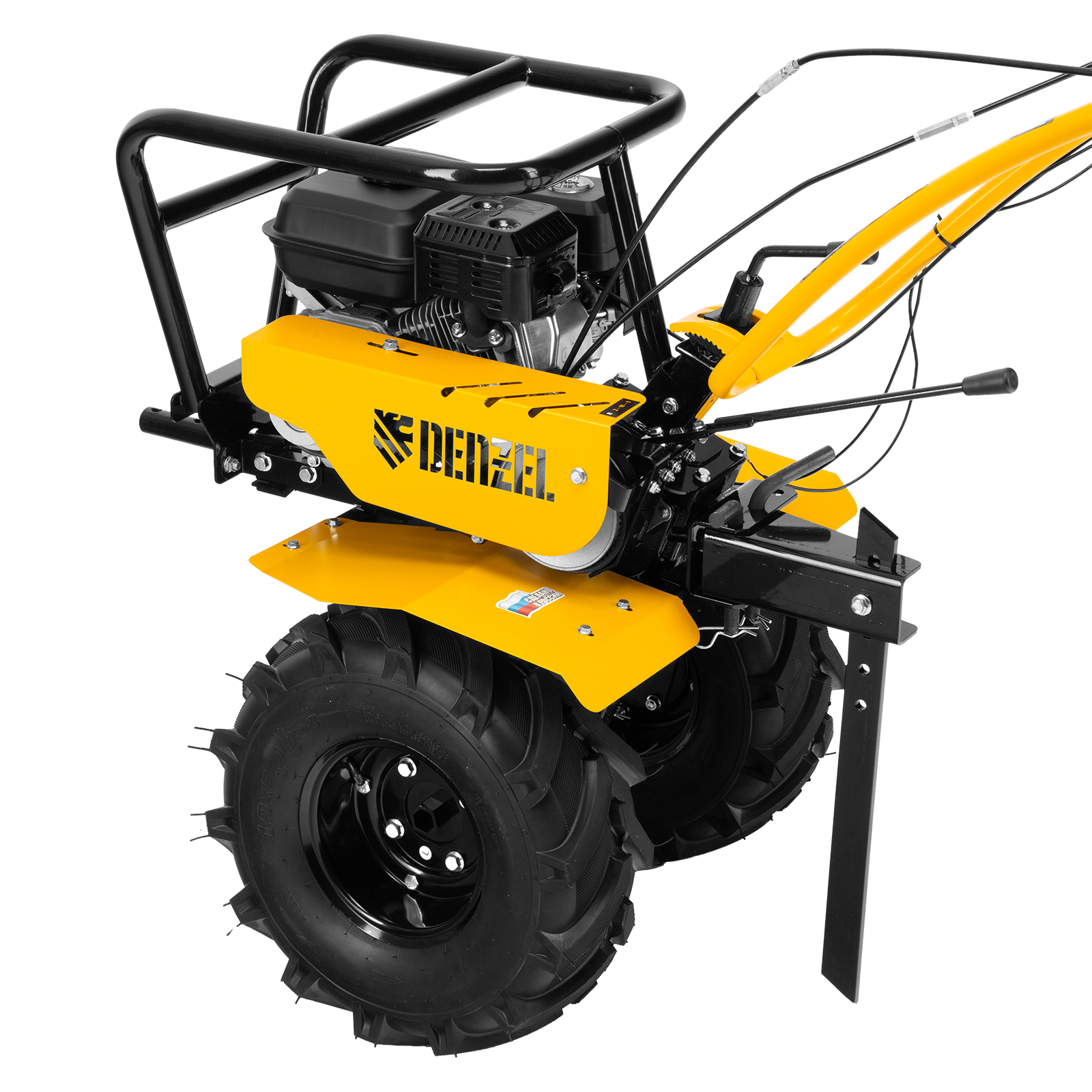 - Возможность использования в качестве транспортного средства — установив прицеп Denzel 59950, можно перемещаться по территории, а также перевозить грузы.