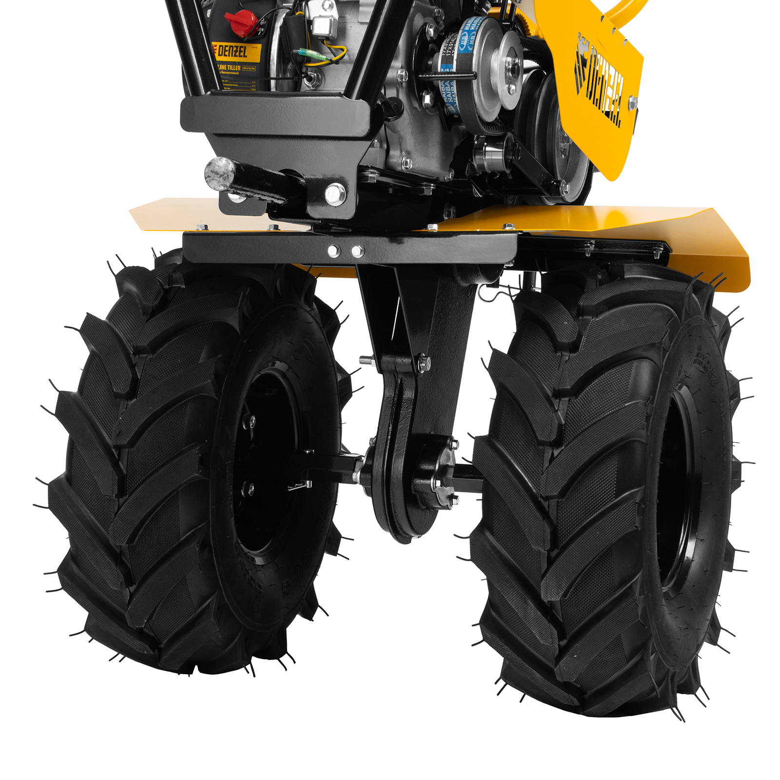 - Возможность использования в качестве транспортного средства — установив прицеп Denzel 59950, можно перемещаться по территории, а также перевозить грузы.