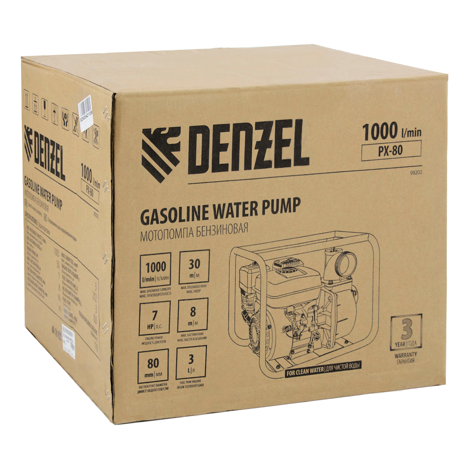 Бензиновая мотопомпа Denzel PX-80 99202 производительностью 1000 л/мин, с двигателем мощностью 7 л. с. и штуцерами диаметром 3 дюйма, осуществляет забор воды с глубины до 8 м, обеспечивает напор до 30 м и используется для подачи чистой воды на дачный участок, стройку, небольшое предприятие или в системы полива. Также легко справляется с осушением водоемов, бассейнов и затопленных помещений. Бензиновая мотопомпа работает автономно, и ее можно использовать для выездных работ.