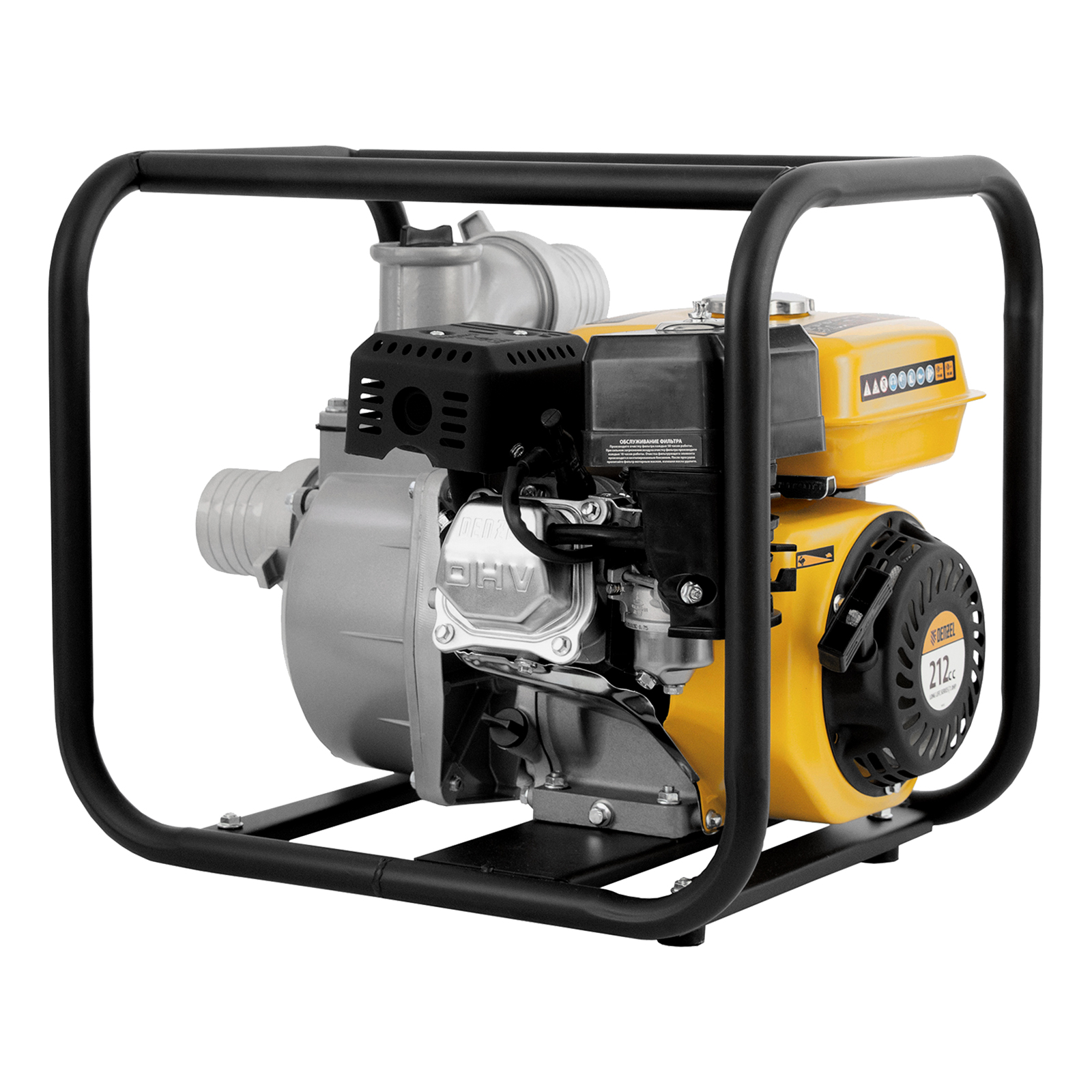 - Надежная конструкция — усиленная стальная рама с широким основанием защищает мотопомпу от повреждений и обеспечивает ее устойчивость во время работы.