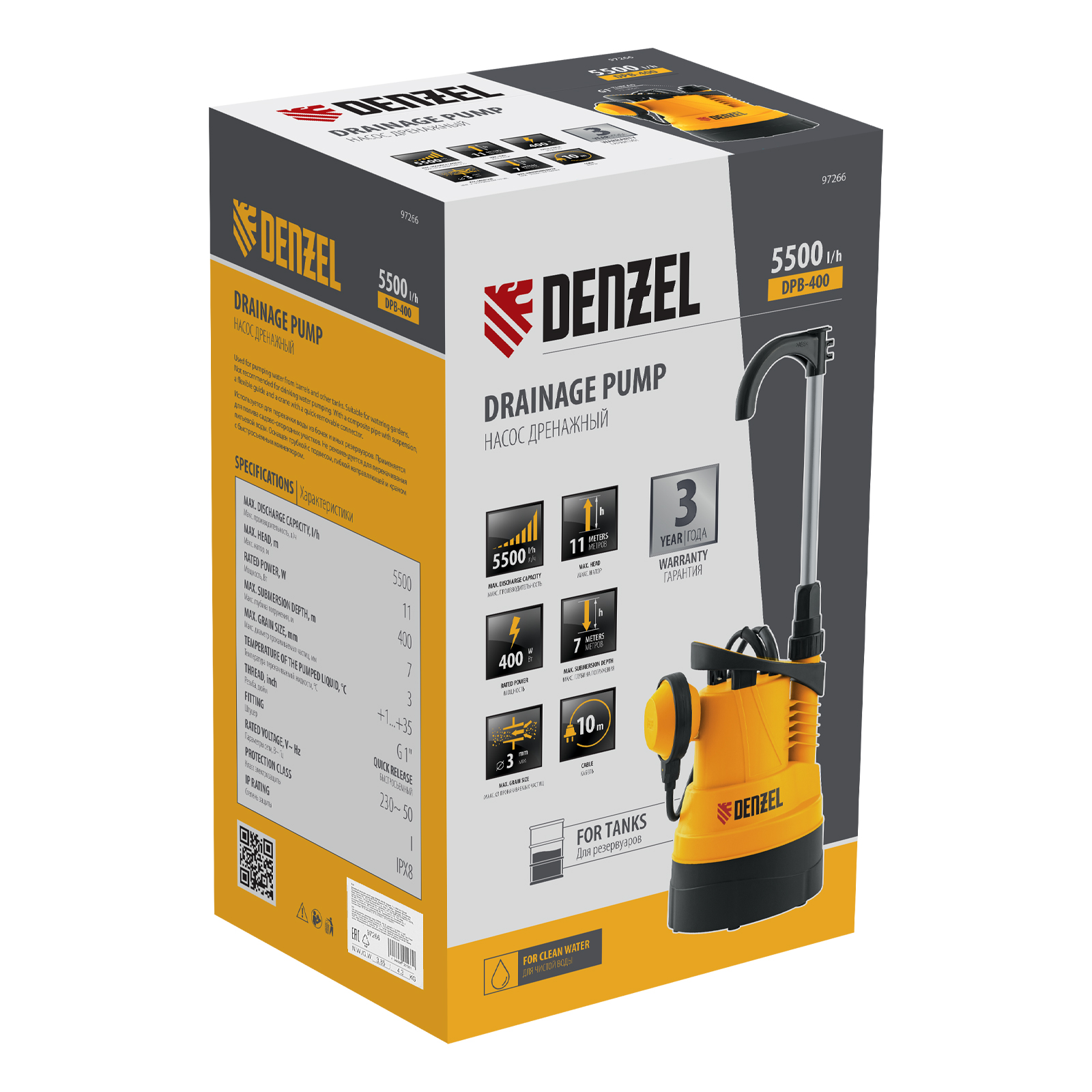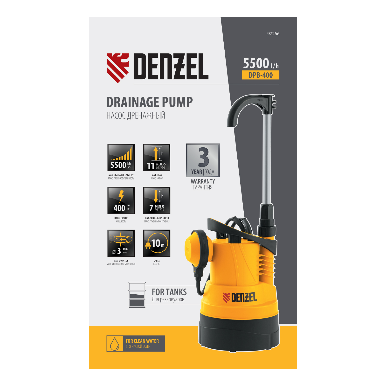 Дренажный насос для чистой воды Denzel 97266 мощностью 400 Вт работает со скоростью 5500 л/ч и обеспечивает подъем перекачиваемой жидкости на высоту до 11 м. Погружается на глубину до 7 м, применяется для организации систем полива и водоснабжения на приусадебном участке, подходит также для выполнения осушительных работ. Забор воды происходит из колодцев, водоемов, бассейнов, различных резервуаров, бочек и других накопителей. Максимальный диаметр перекачиваемых частиц составляет 3 мм.