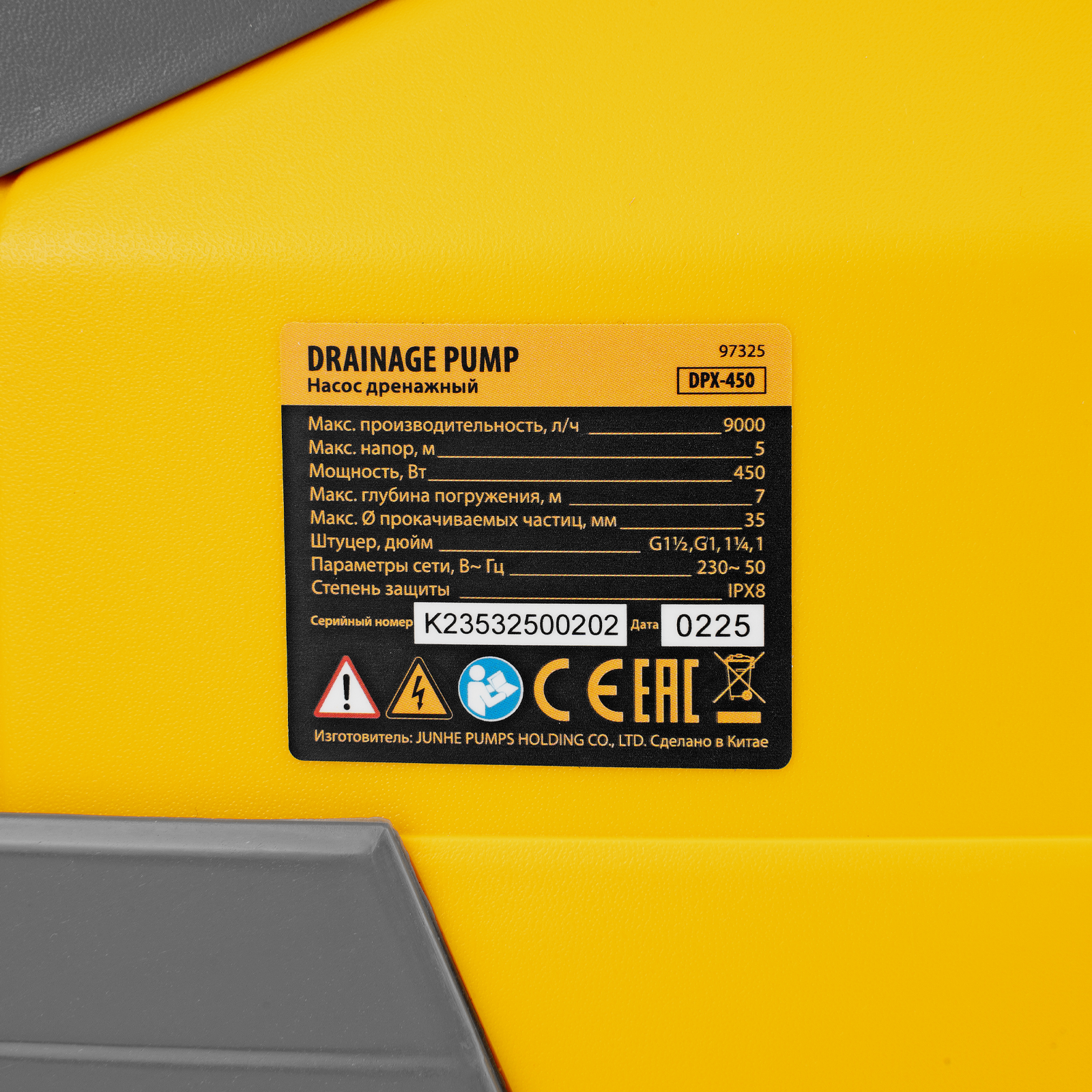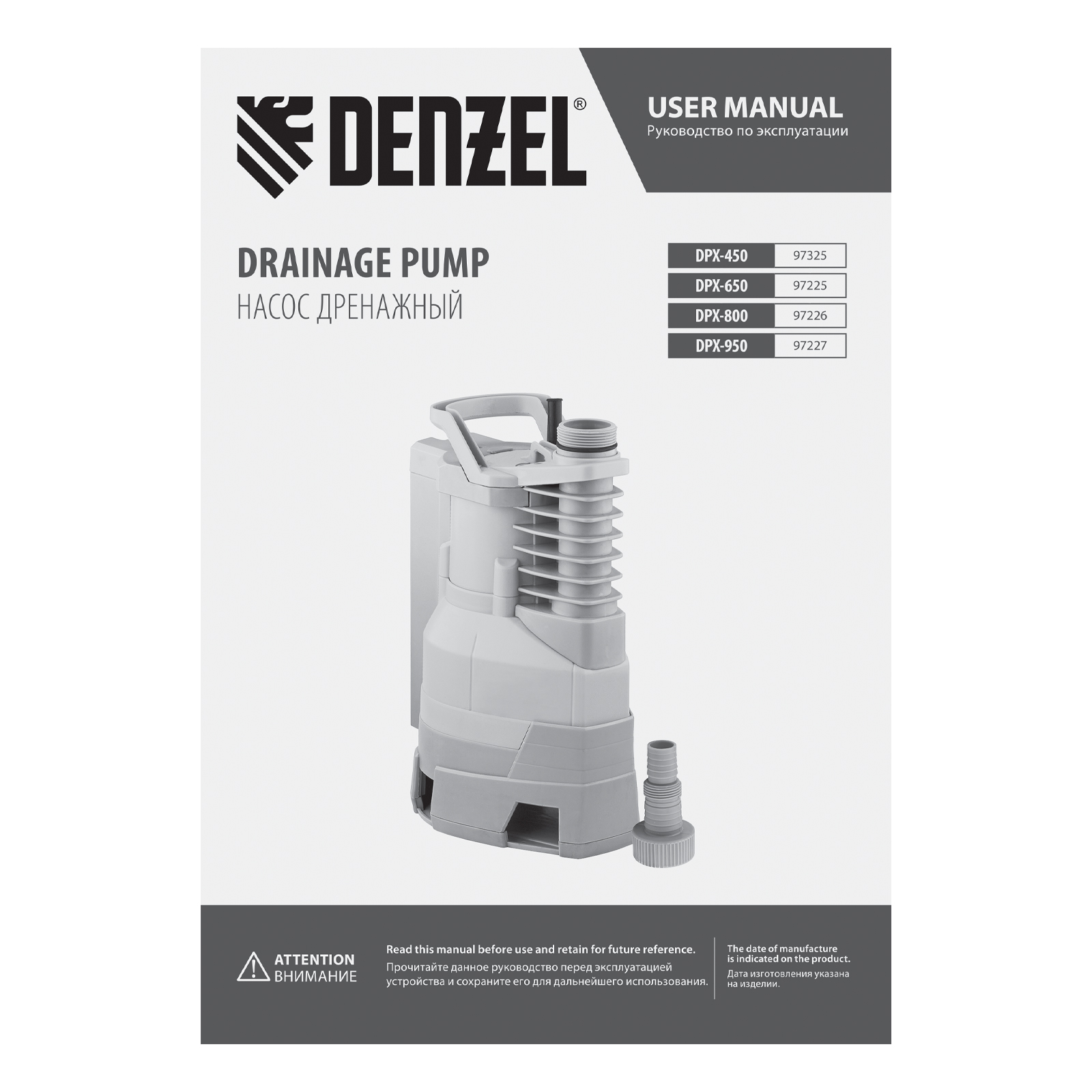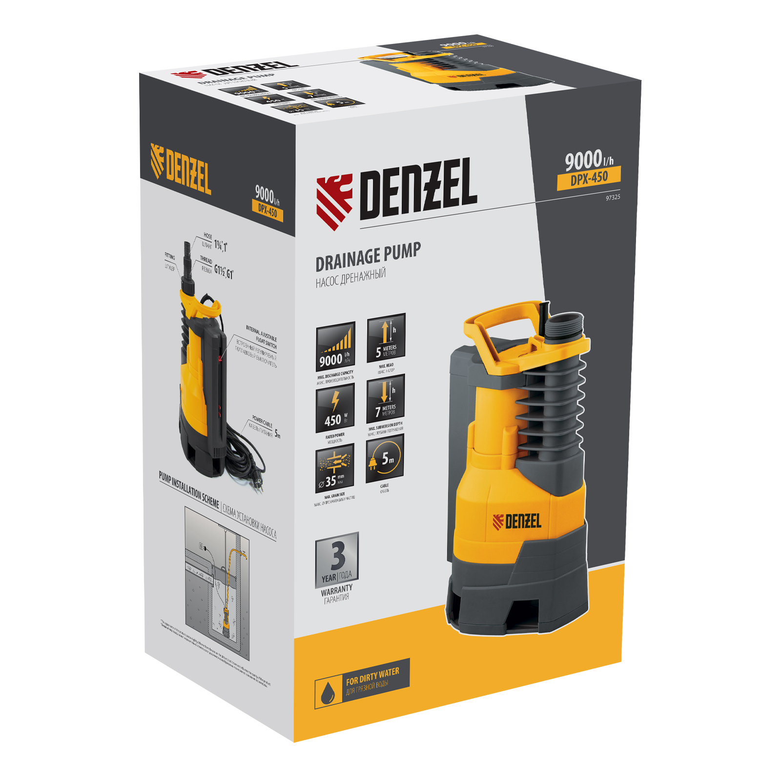 Дренажный насос Denzel DPХ450 97325 мощностью 450 Вт способен перекачивать до 9000 л воды в час и поднимать ее на высоту до 5 м. Используется для подачи чистой воды из резервуаров и организации систем орошения. Также подходит для откачивания грязной воды с частицами диаметром до 35 мм из канав и подвалов. Для предотвращения работы на сухом ходу предусмотрен поплавковый механизм.