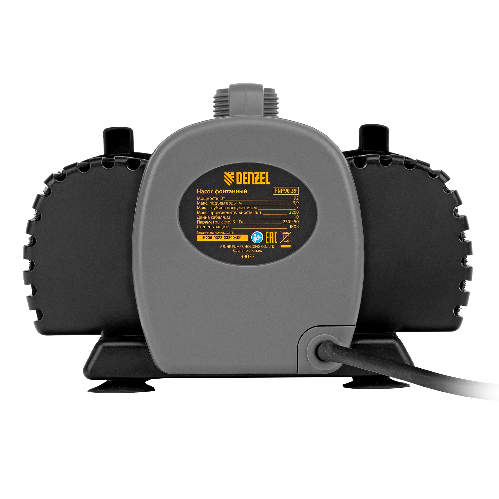Фонтанный насос Denzel FNP90-39 99033 мощностью 92 Вт, с насадками колокольчик/каскад/гейзер, перекачивает 3200 л воды в час и обеспечивает максимальную высоту подъема 3,9 м. Позволяет создать декоративный фонтан, украсив водоем и оживив ландшафт дачного участка. Установив одну из входящих в комплект насадок, можно получить наиболее подходящий тип струи: в виде колокольчика, каскада или гейзера. Также в конструкции насоса предусмотрен специальный патрубок для создания водопада.