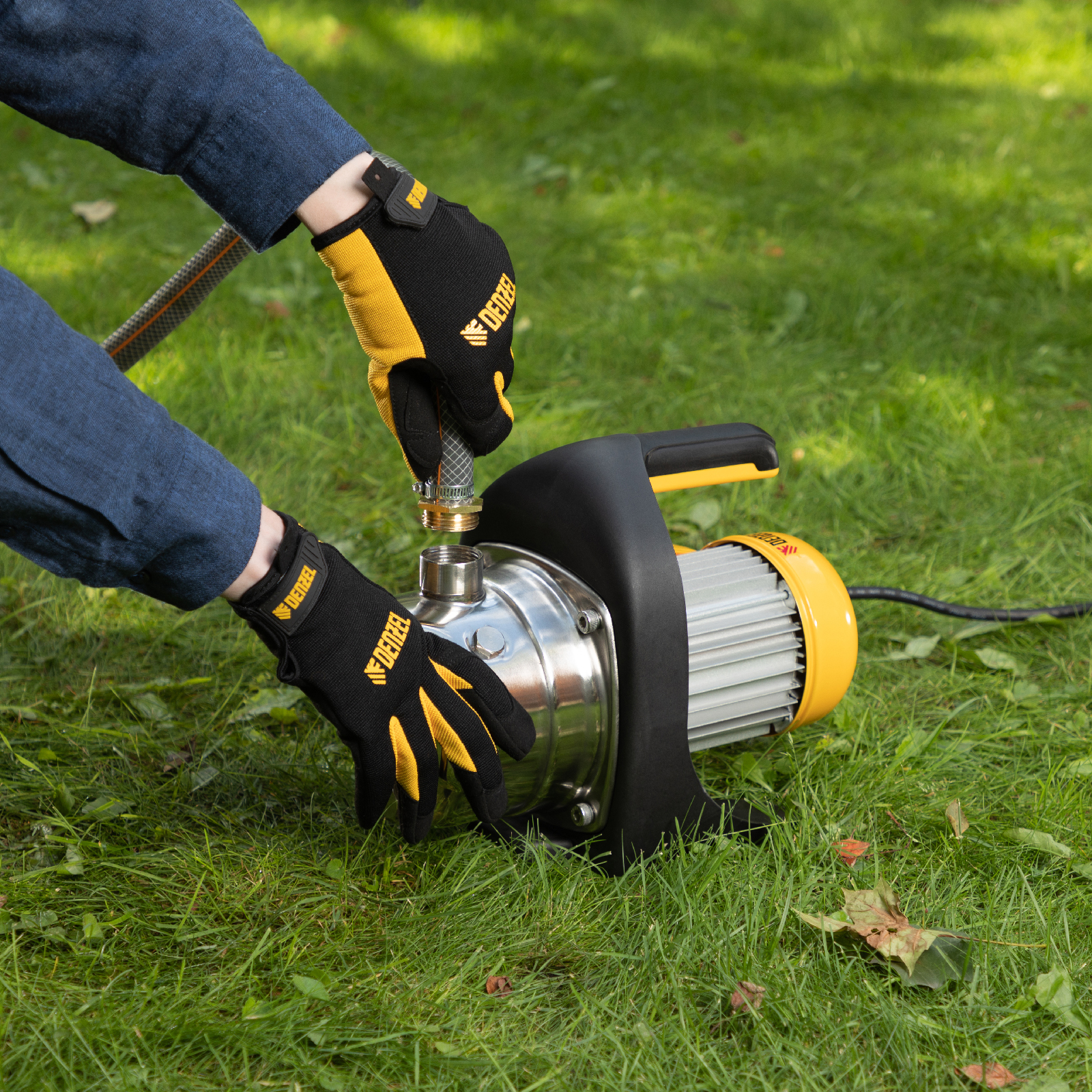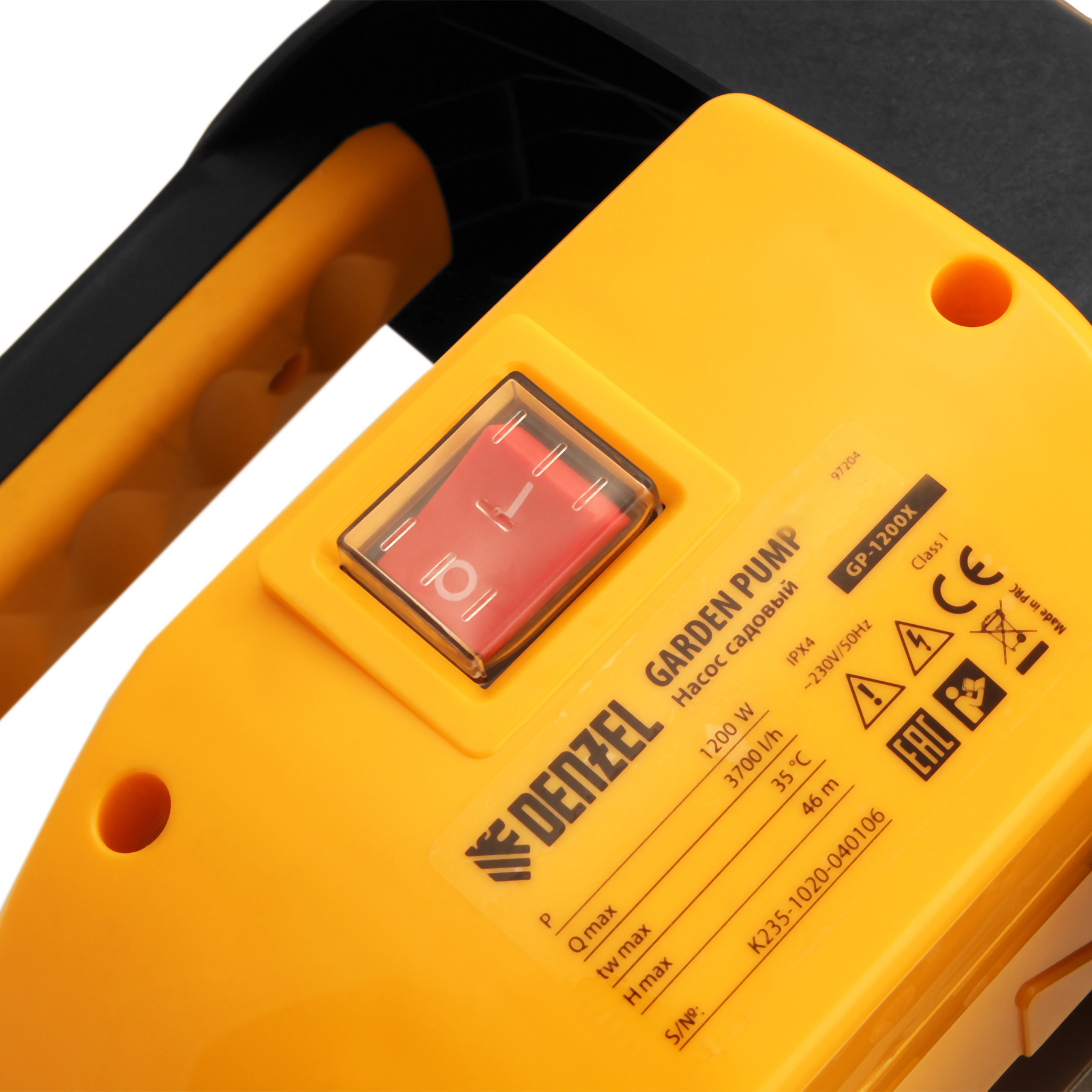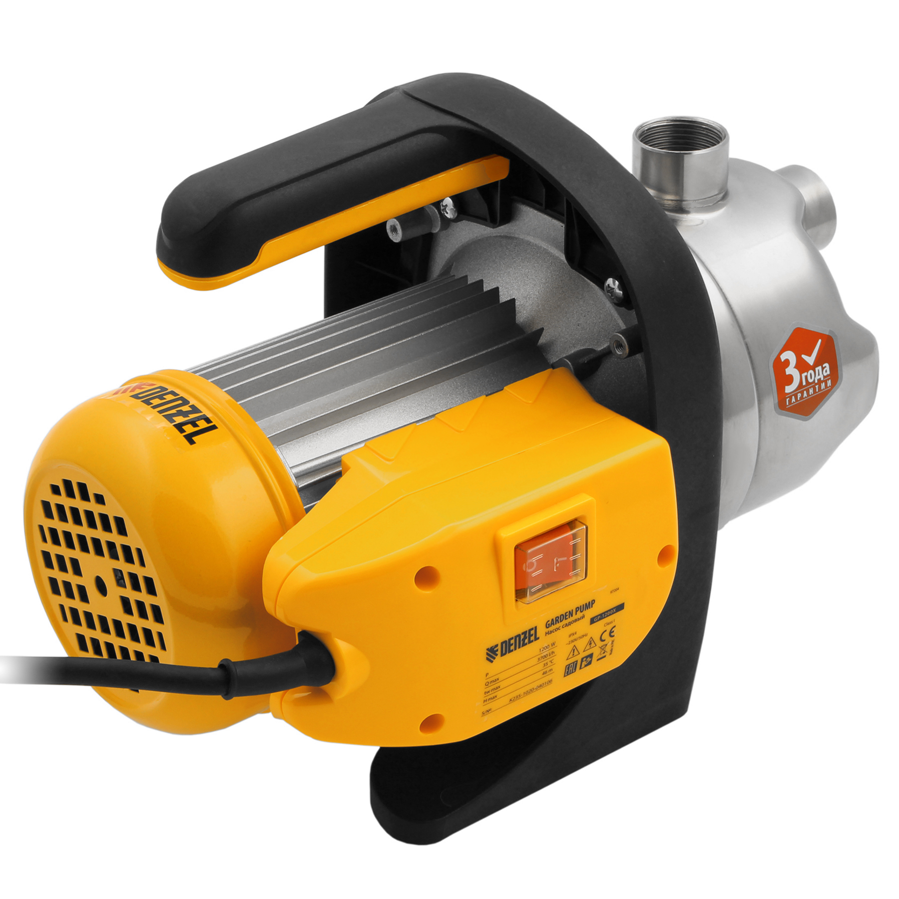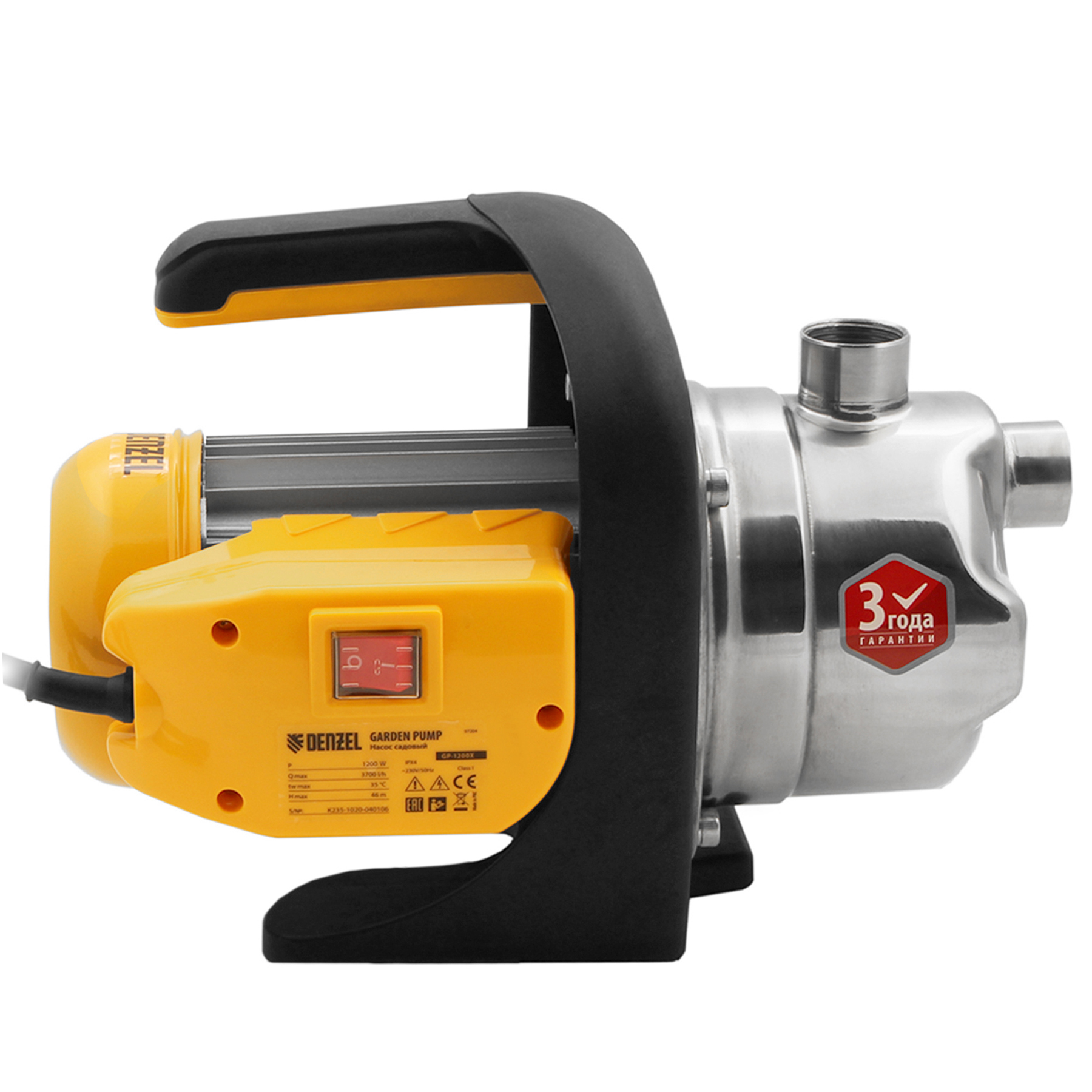 Садовый поверхностный насос Denzel GP1200X 97204 с корпусом насосной части из «нержавейки», мощностью 1200 Вт и производительностью 3700 л/ч, способен забирать чистую воду с глубины до 8 м из колодцев, емкостей и водоемов и подавать ее на высоту до 46 м. Обеспечивает стабильный напор и используется для организации системы полива и водоснабжения на даче. Производительности хватает для одновременного снабжения нескольких водоразборных точек.