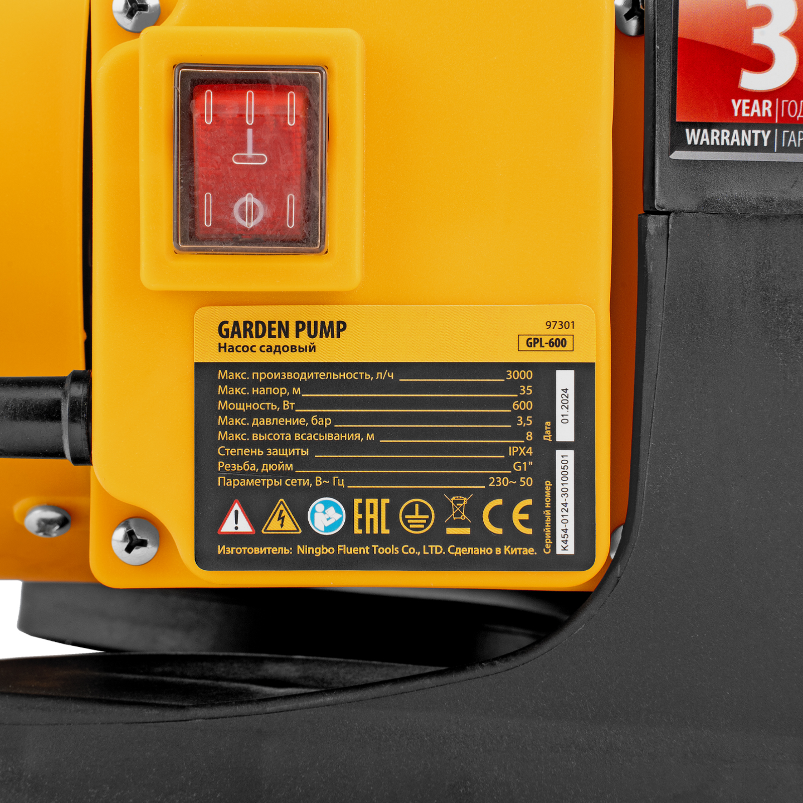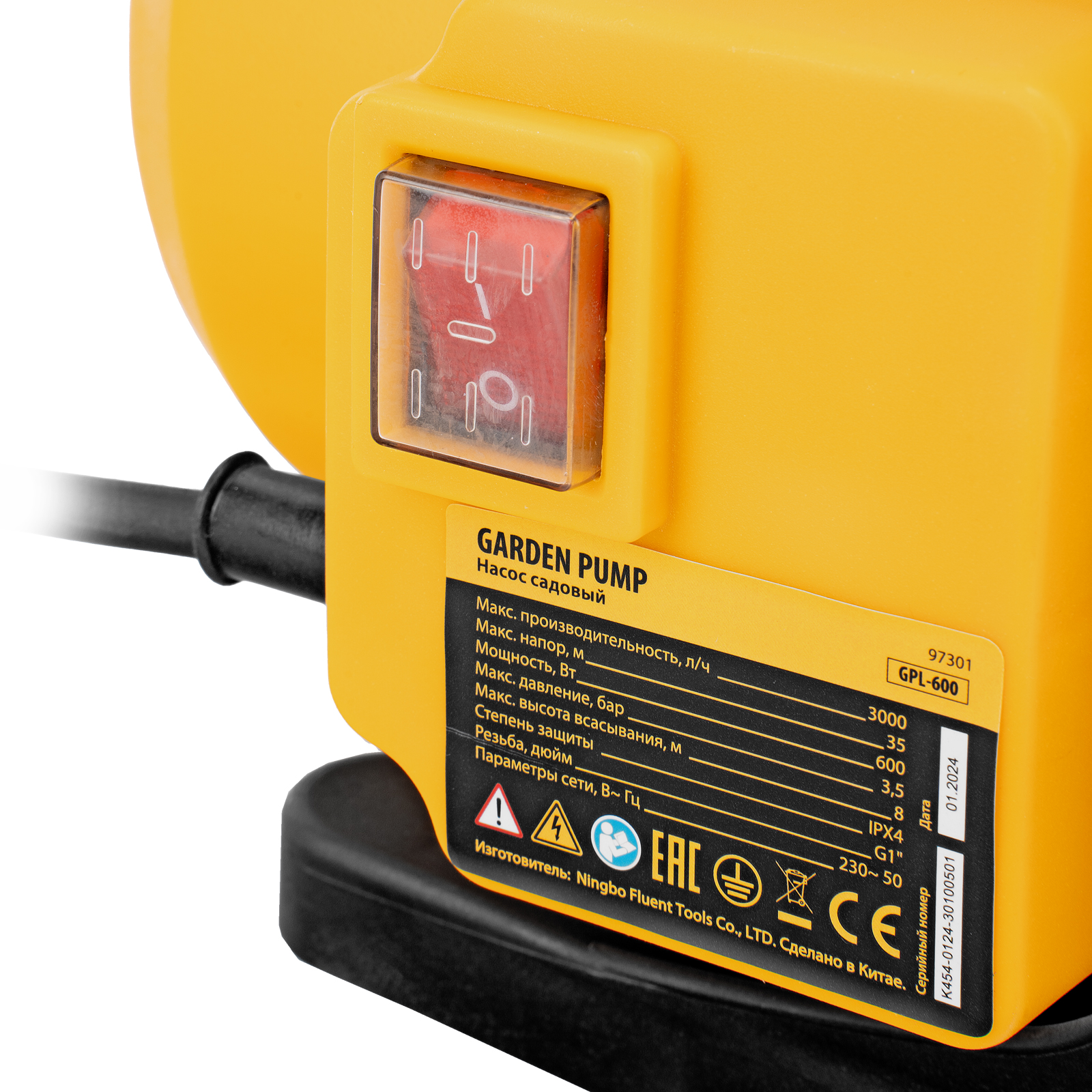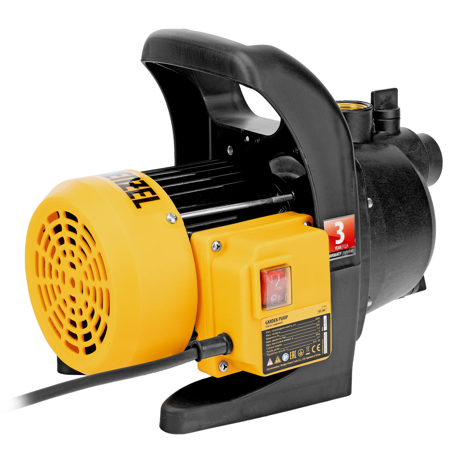 Садовый поверхностный насос Denzel GPL600 97301 мощностью 600 Вт и производительностью 3000 л/ч, с корпусом из пластика, предназначен для забора чистой воды из колодцев, водоемов, различных резервуаров, и подъема ее на высоту до 35 м. Используется для проведения поливочных работ или организации системы водоснабжения в загородном доме. Способен обеспечить водой несколько точек водоразбора.