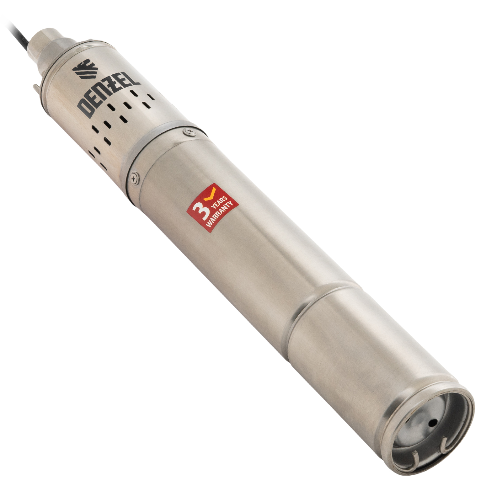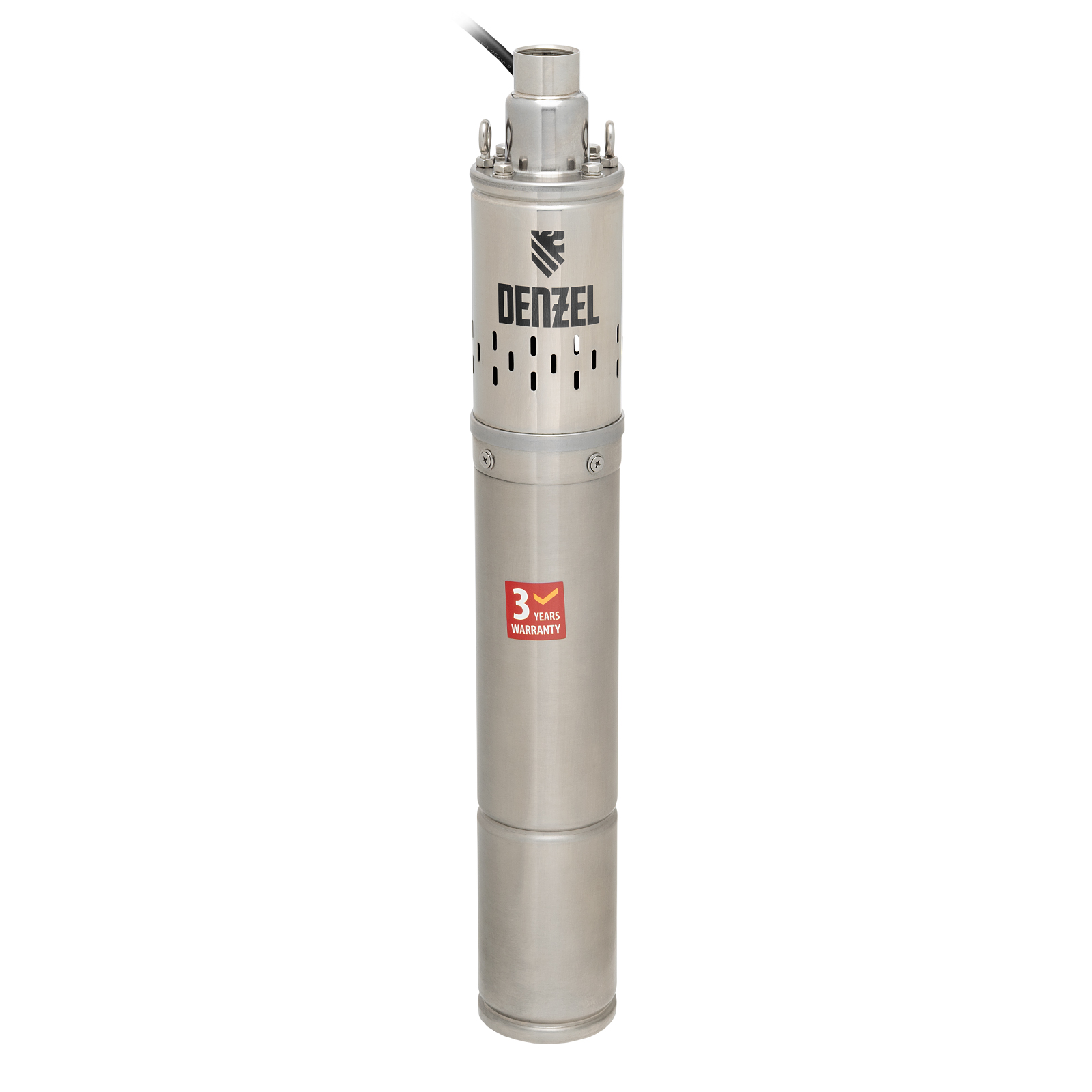 Винтовой скважинный насос Denzel DWS-3,5-100 97251 диаметром 3,5" потребляет мощность 800 Вт, перекачивает воду объемом 1700 л/ч и обеспечивает напор до 100 м при рабочем давлении 10 бар. Предназначен для подъема чистой воды с глубины до 80 м из скважин и колодцев, различных резервуаров и водоемов. Используется для организации систем водоснабжения и орошения на даче, садовом участке или в загородном доме.