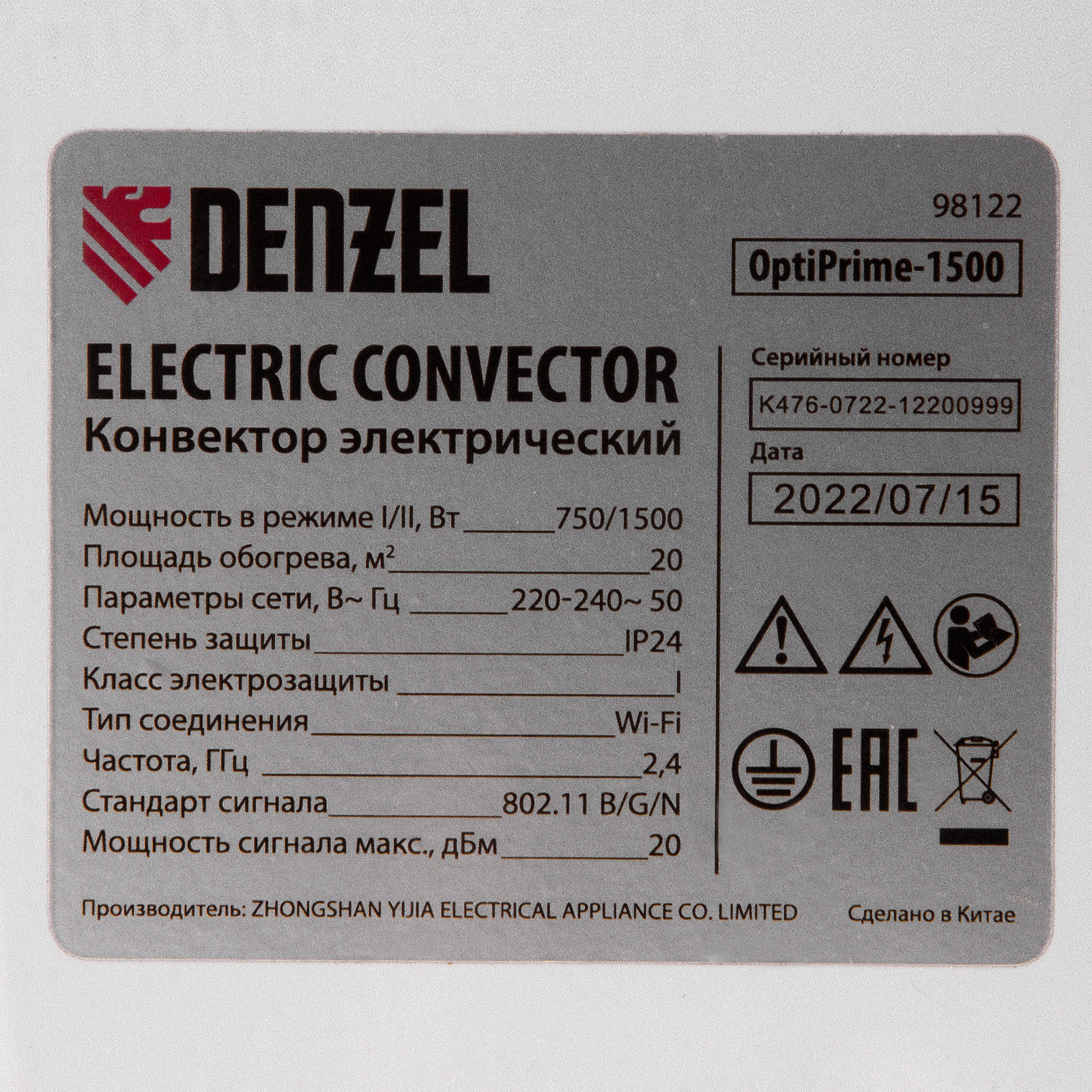 Электрический конвектор Denzel OptiPrime-1500 98122 максимальной мощностью 1500 Вт, с тачскрином, цифровым термостатом и функцией подключения к Wi-Fi, рассчитан на обогрев квартиры, дачи, загородного дома, офиса, а также пригодится в производственных, бытовых и общественных помещениях. Рекомендуемая площадь обогрева — 20 кв.м. Две мощности обогрева 750 и 1500 Вт позволяют поддерживать температуру в отапливаемой комнате и полностью прогревать холодные помещения.,Устройство оснащено Х-образным нагревательным элементом — самым долговечным среди аналогов, обеспечивающим максимально равномерный прогрев помещения. Конвектор не сушит воздух, не сжигает пыль и исключает появление неприятного запаха.