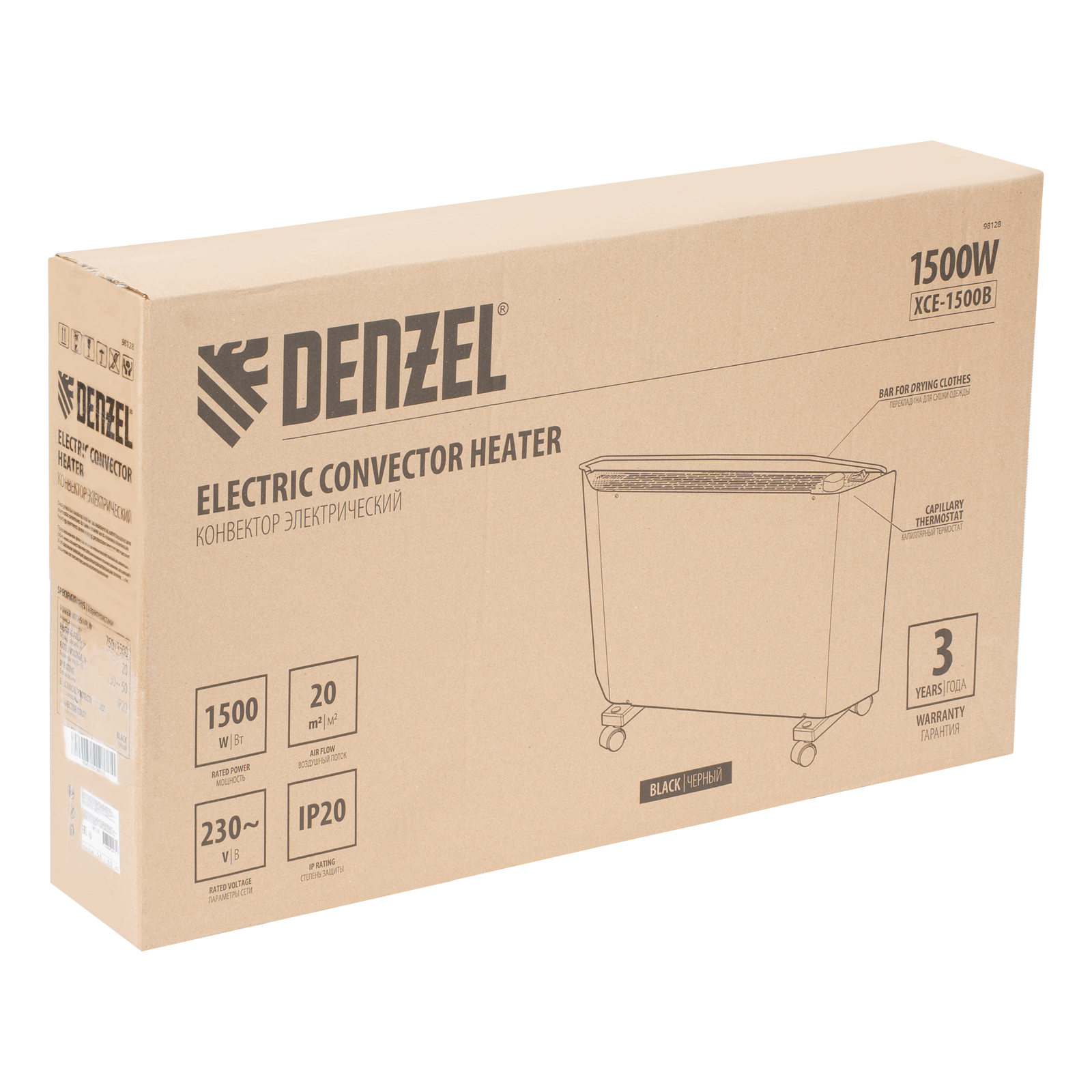 Электрический конвектор Denzel XCE-1500B 98128 черного цвета, максимальной мощностью 1500 Вт, с сушилкой для одежды, колесами и X-образным нагревательным элементом, работает от сети 230 В и предназначен для обогрева закрытых помещений площадью до 20 м2. Надежный и долговечный X-образный нагревательный элемент обеспечивает быстрый нагрев до необходимой температуры.