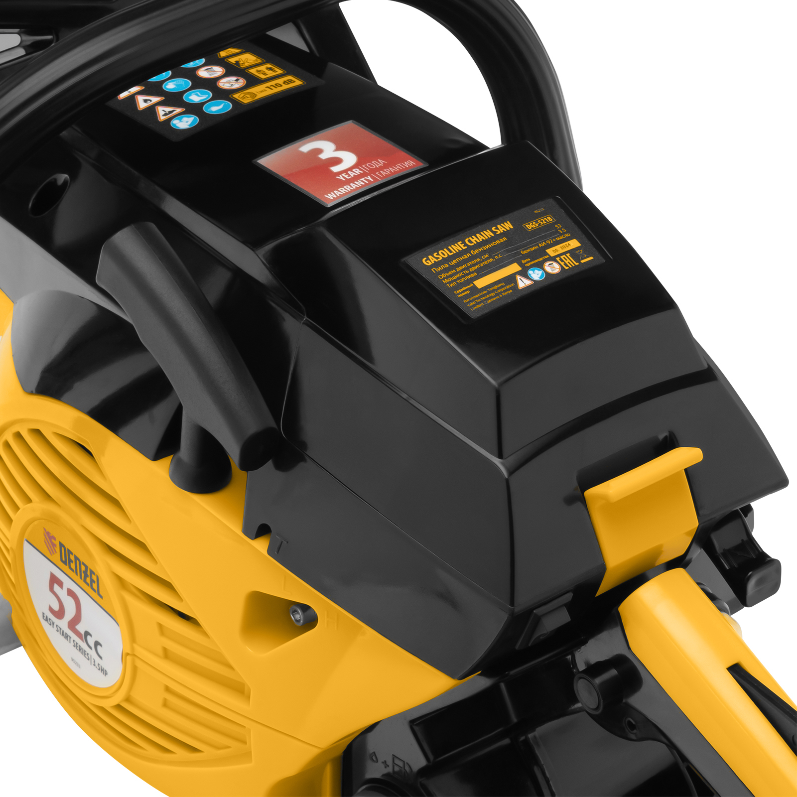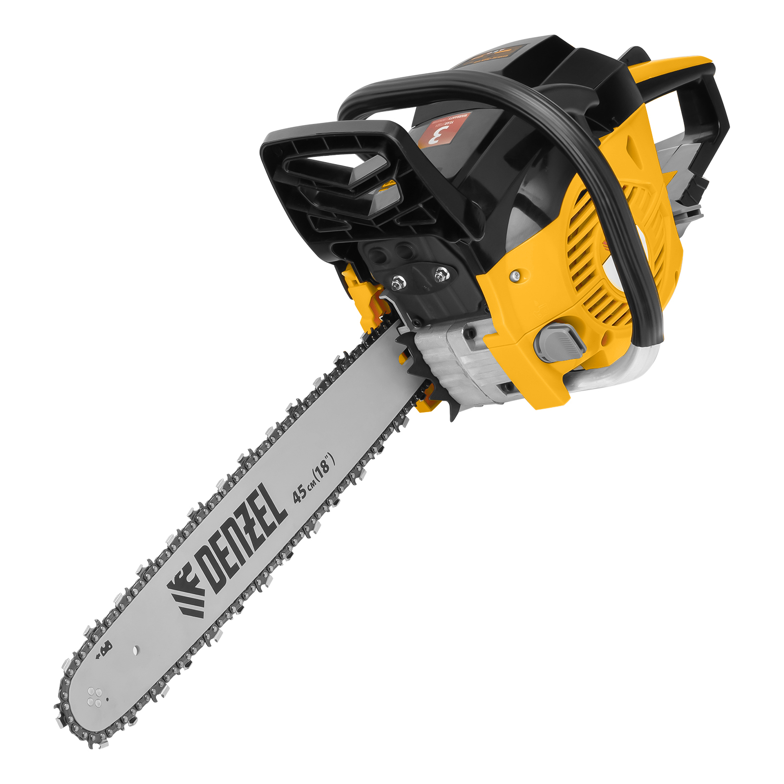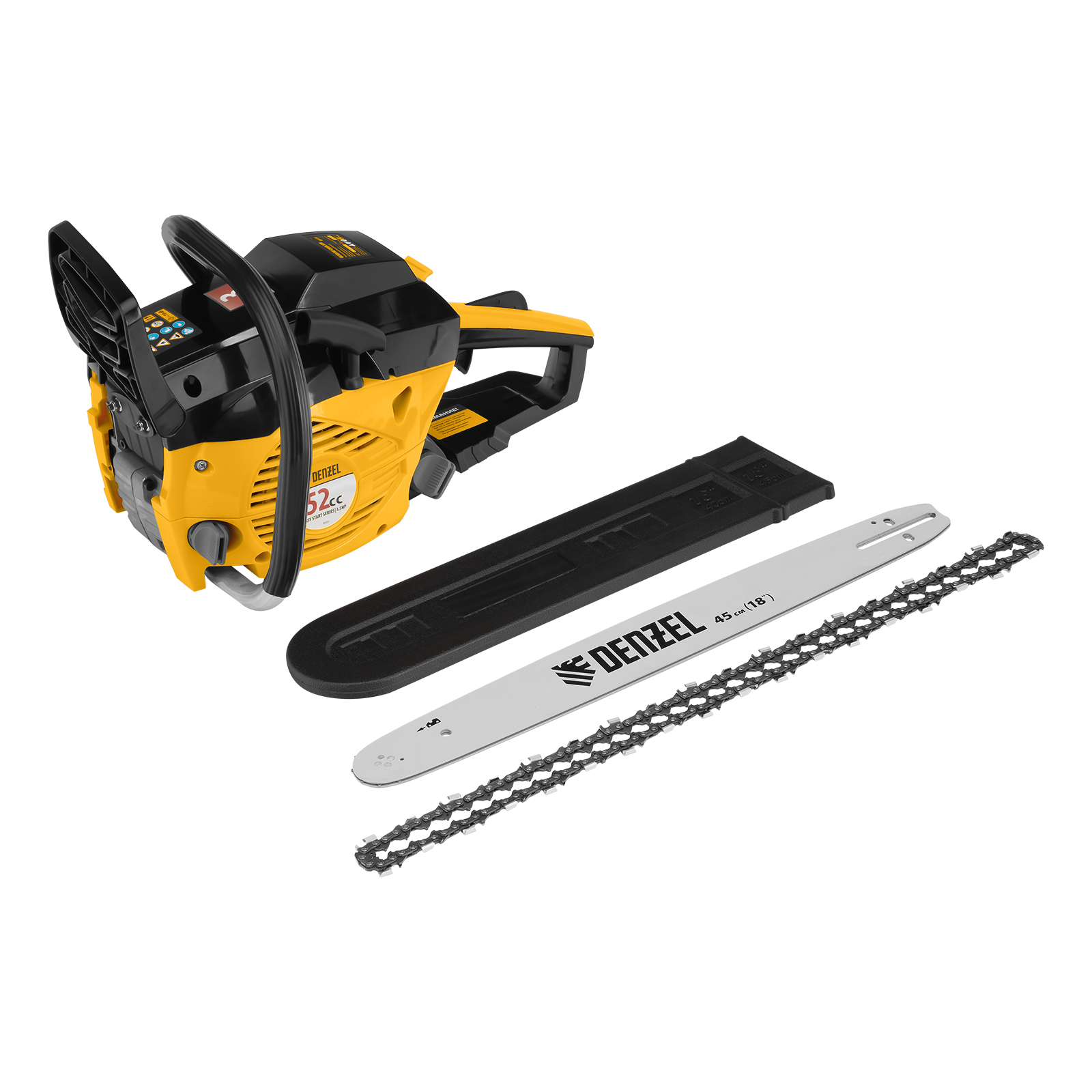 Пила цепная бензиновая Denzel DGS-5218 95233 с двигателем объемом 52 см3 и мощностью 3,5 л.с. поставляется с шиной длиной 45 см и цепью с 72 звеньями (шаг 0,325″, паз 1,5 мм). Инструмент предназначен для заготовки дров, обрезки ветвей и сучьев в саду, распила древесины твердых и мягких пород. Пила выдерживает интенсивные нагрузки, используется во время строительных и ремонтных работ, будет полезна на дачном участке.