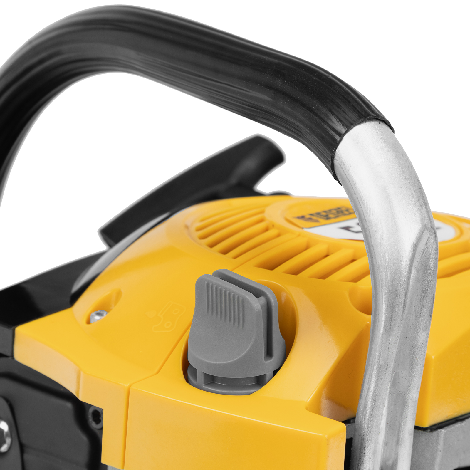 - Безопасность пользователя — усиленный щиток и автоматический тормоз цепи уменьшают риск получения травм при отскоке пилы, также предусмотрена защита от случайного пуска.