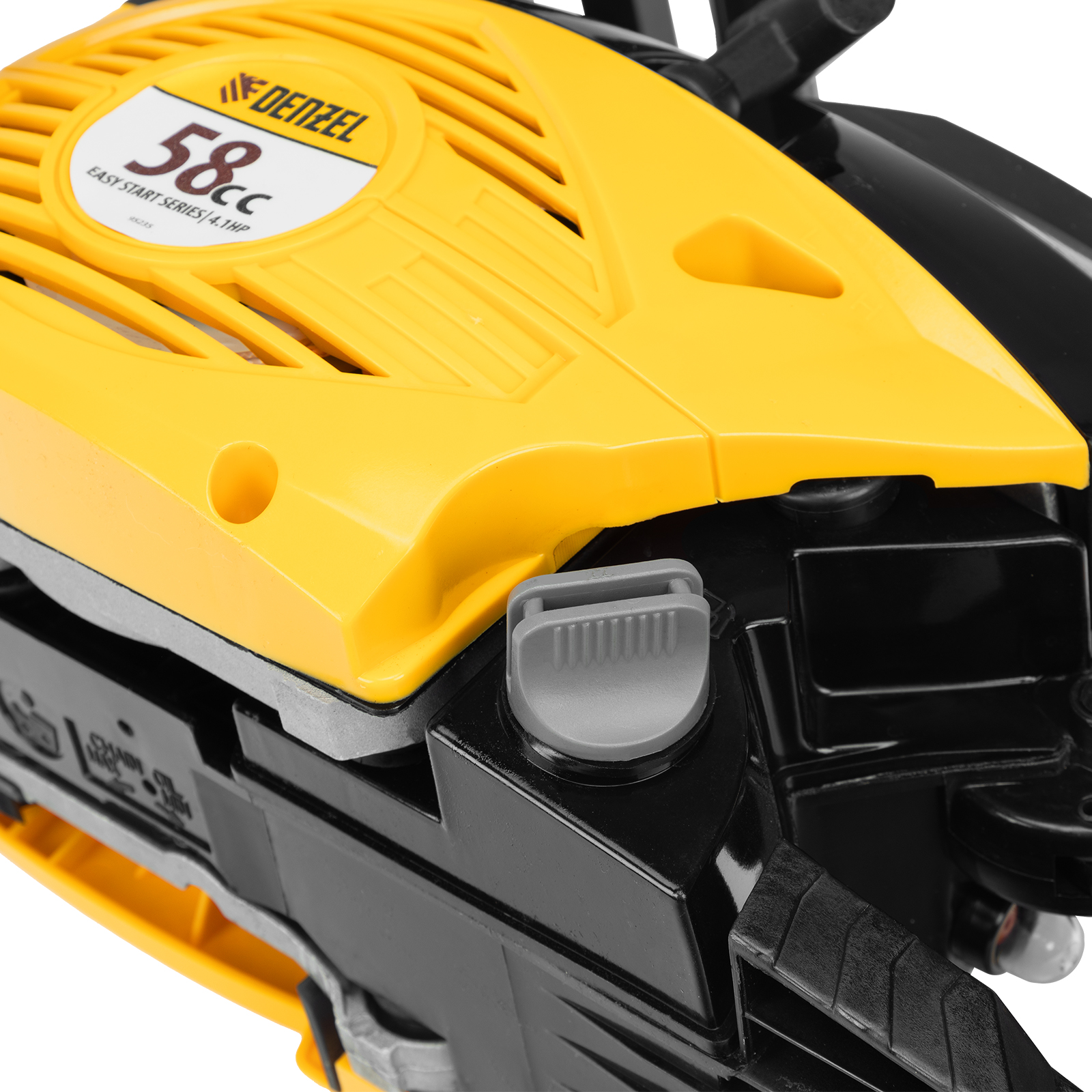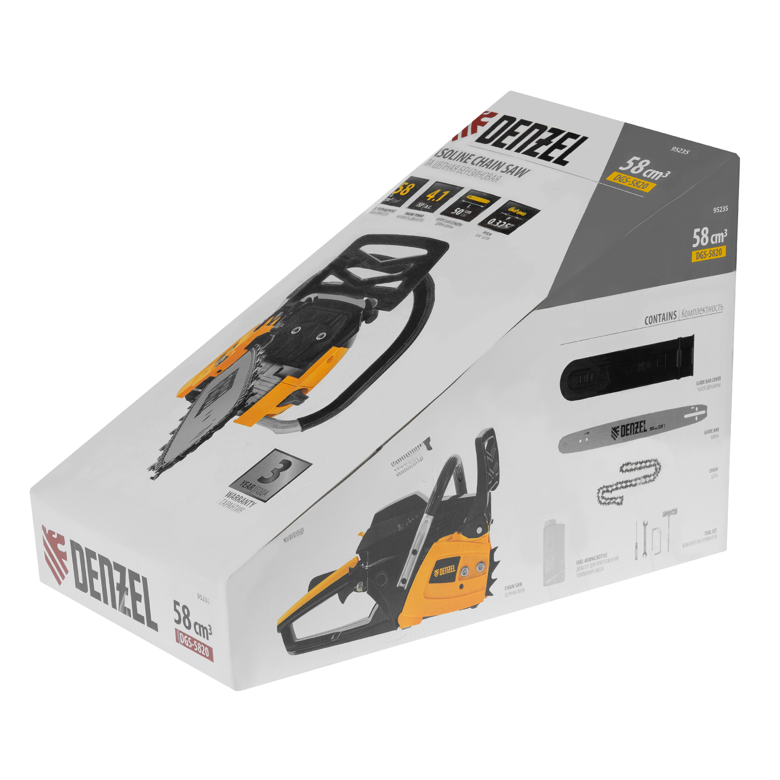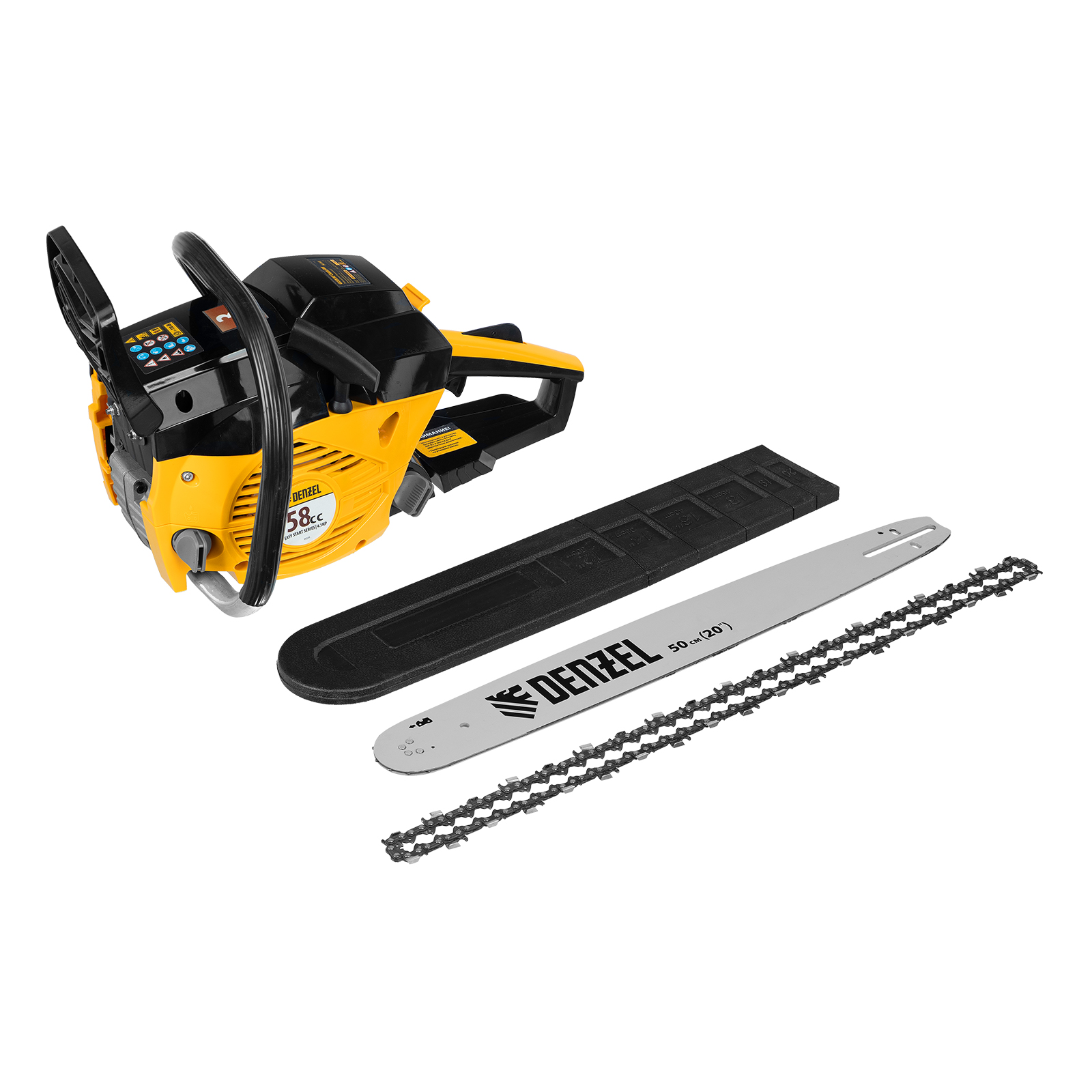 Пила цепная бензиновая Denzel DGS-5820 95235 с двигателем объемом 58 см3 и мощностью 4,1 л.с. поставляется с шиной длиной 50 см и цепью с 76 звеньями (шаг 0,325″, паз 1,5 мм). Это полупрофессиональный инструмент для заготовки дров, обрезки ветвей и сучьев в саду, распила древесины твердых и мягких пород. Пила выдерживает интенсивные нагрузки, используется во время строительных и ремонтных работ, будет полезна на дачном участке.