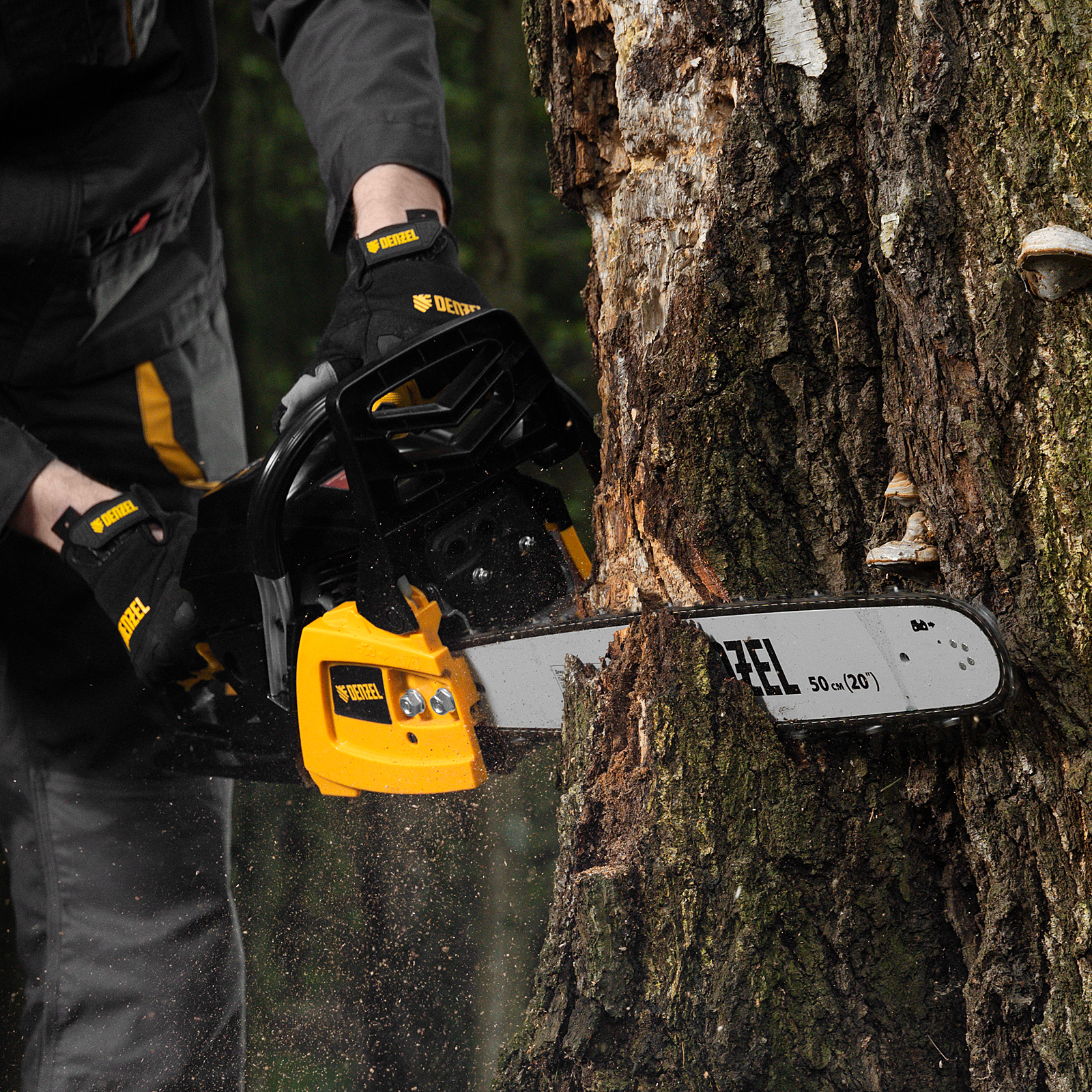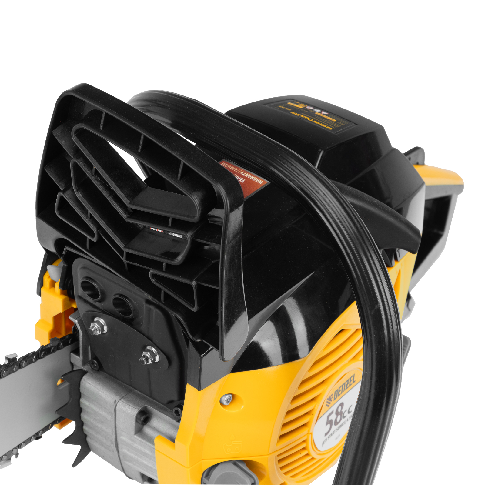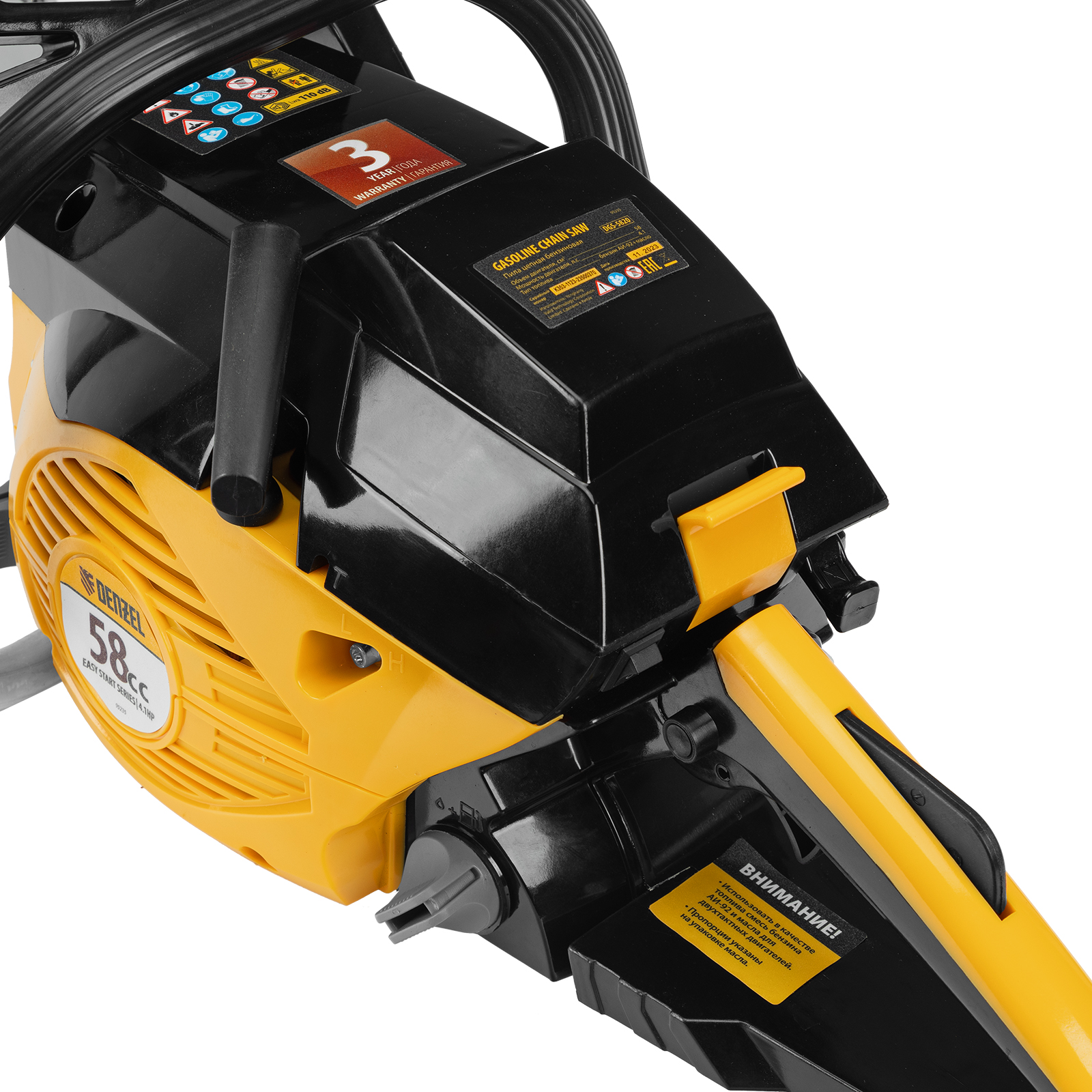 Пила цепная бензиновая Denzel DGS-5820 95235 с двигателем объемом 58 см3 и мощностью 4,1 л.с. поставляется с шиной длиной 50 см и цепью с 76 звеньями (шаг 0,325″, паз 1,5 мм). Это полупрофессиональный инструмент для заготовки дров, обрезки ветвей и сучьев в саду, распила древесины твердых и мягких пород. Пила выдерживает интенсивные нагрузки, используется во время строительных и ремонтных работ, будет полезна на дачном участке.
