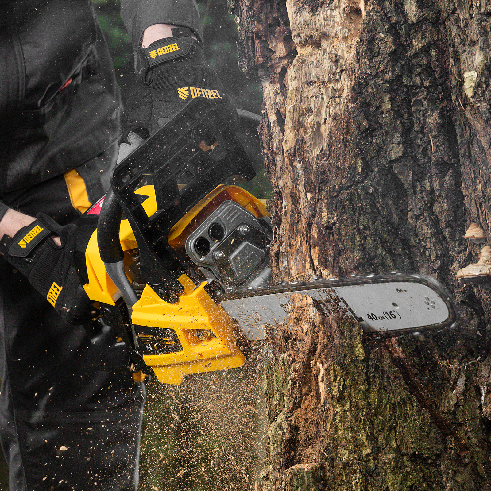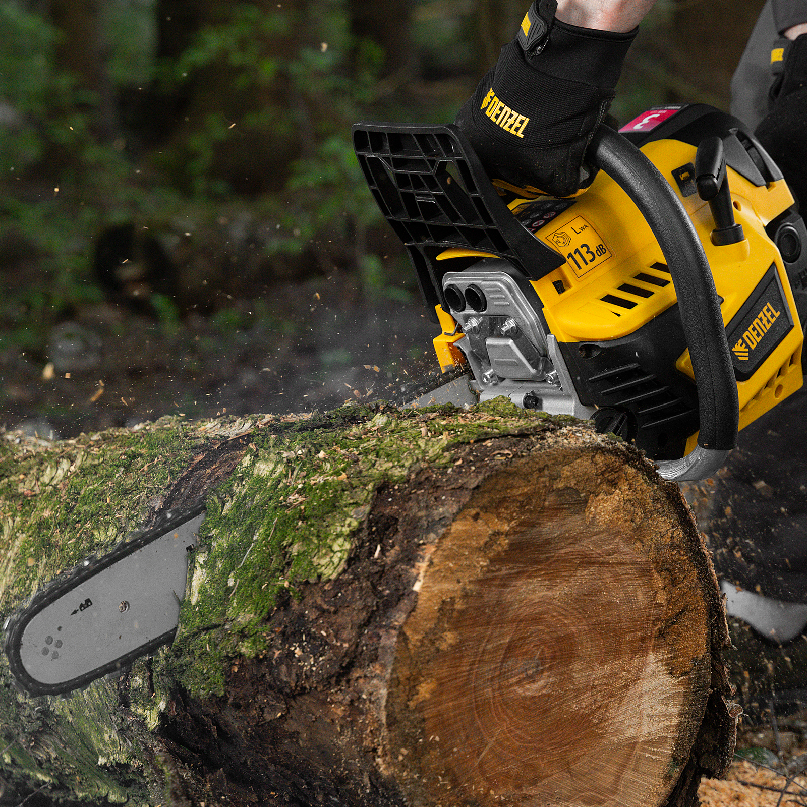 - Безопасная работа — блокировка от случайного запуска и моментальное срабатывание тормоза цепи при отскоке пилы снижают вероятность получения травм.