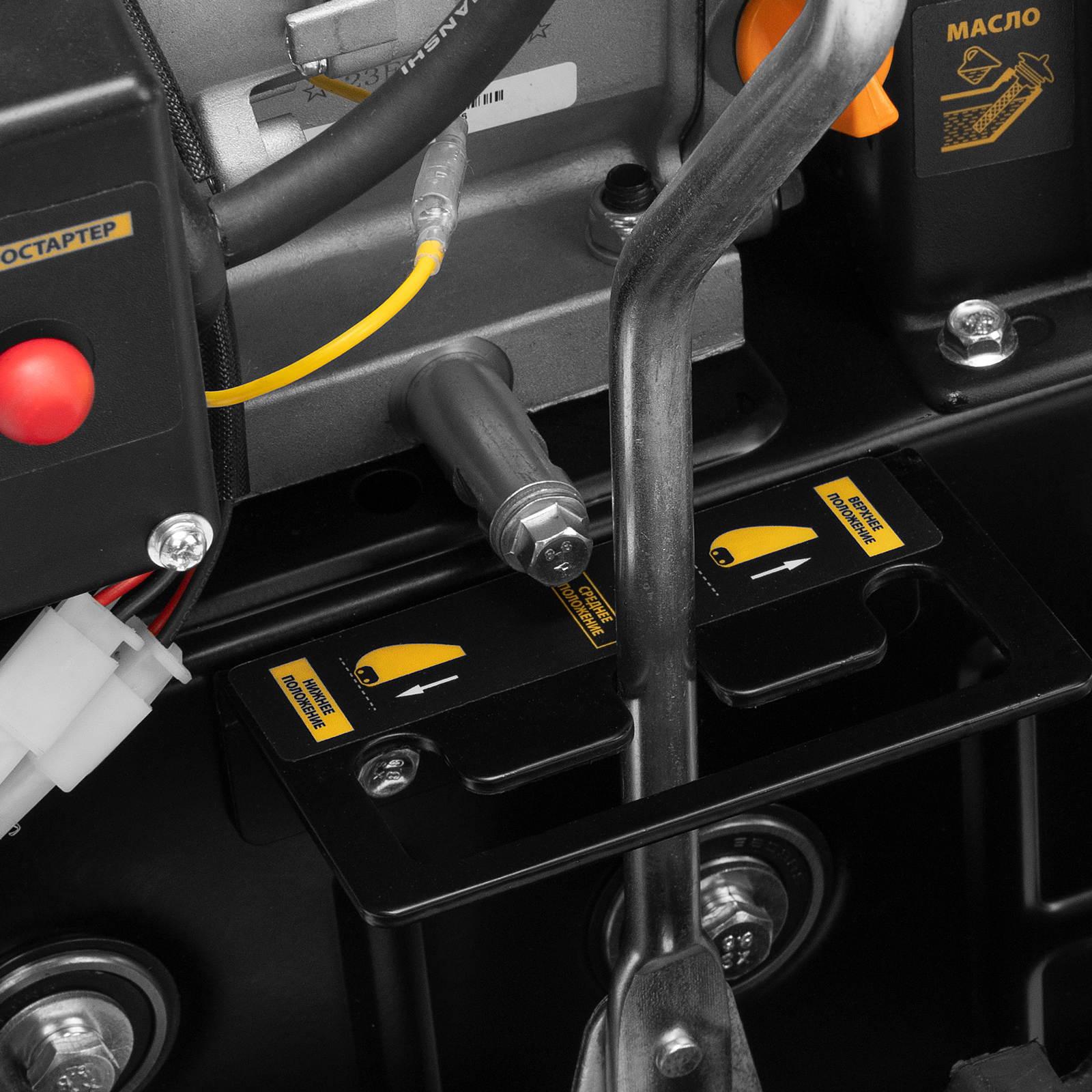 - Управление одной рукой — специальная система позволяет зафиксировать рычаг запуска шнека, пока нажат рычаг привода колес.