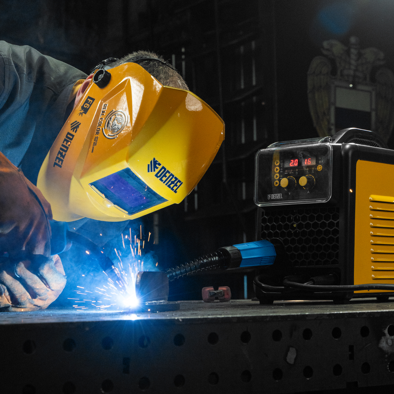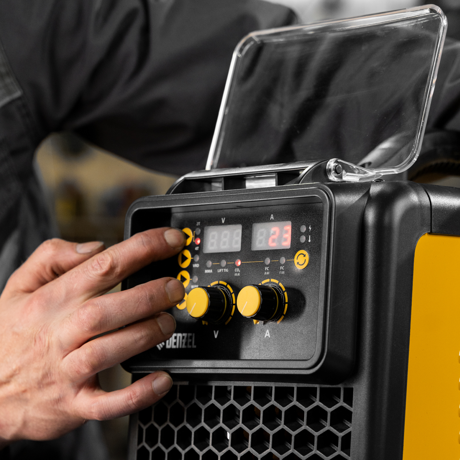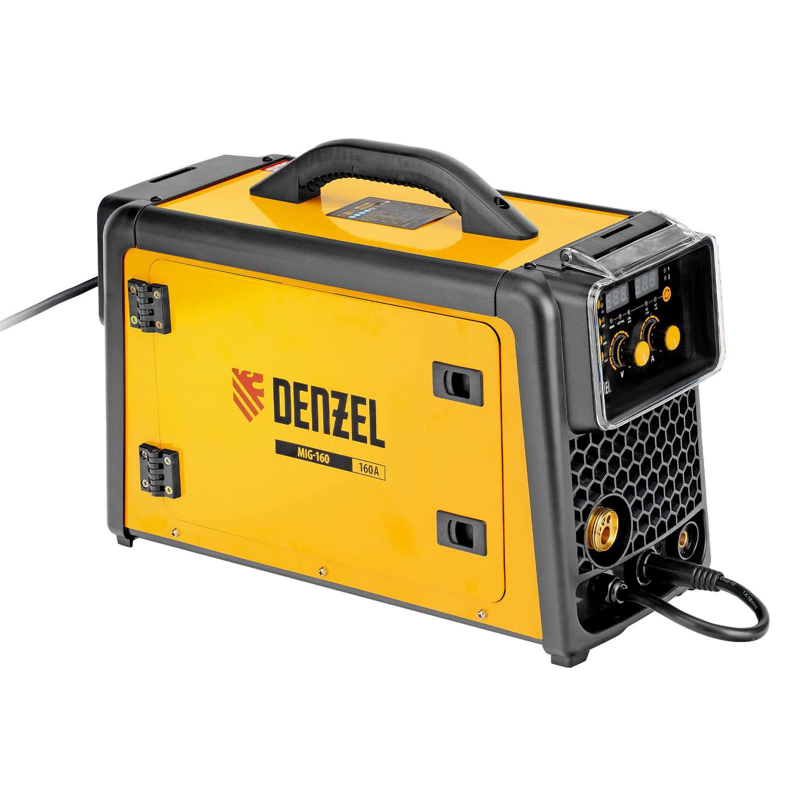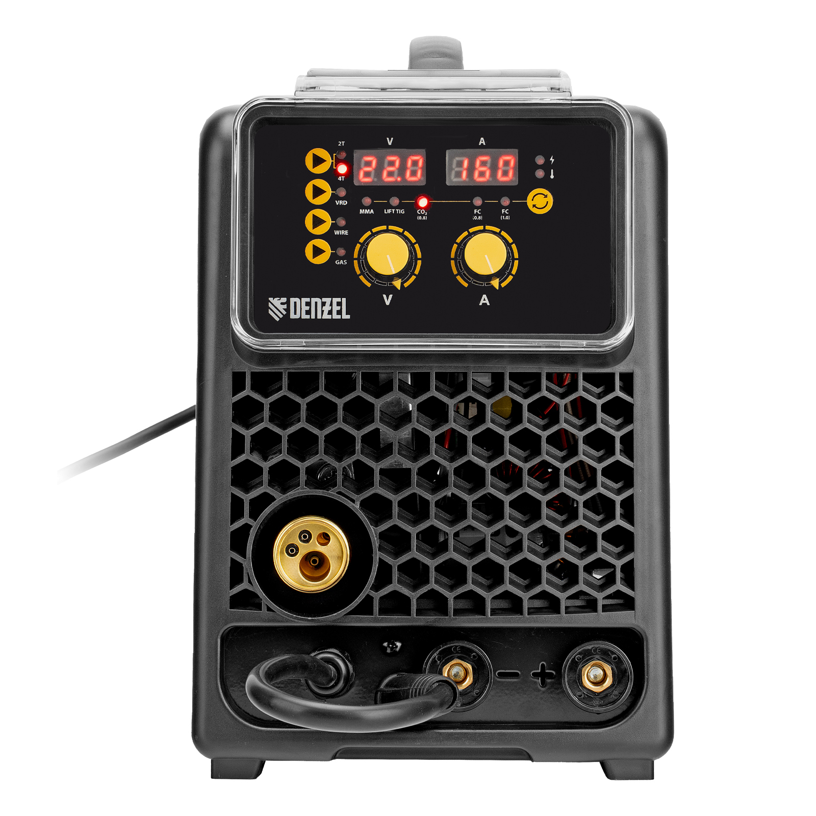 - Удобный контроль рабочих параметров — на двух дисплеях отображаются значения заданного и текущего напряжения, а также установленного и сварочного тока.