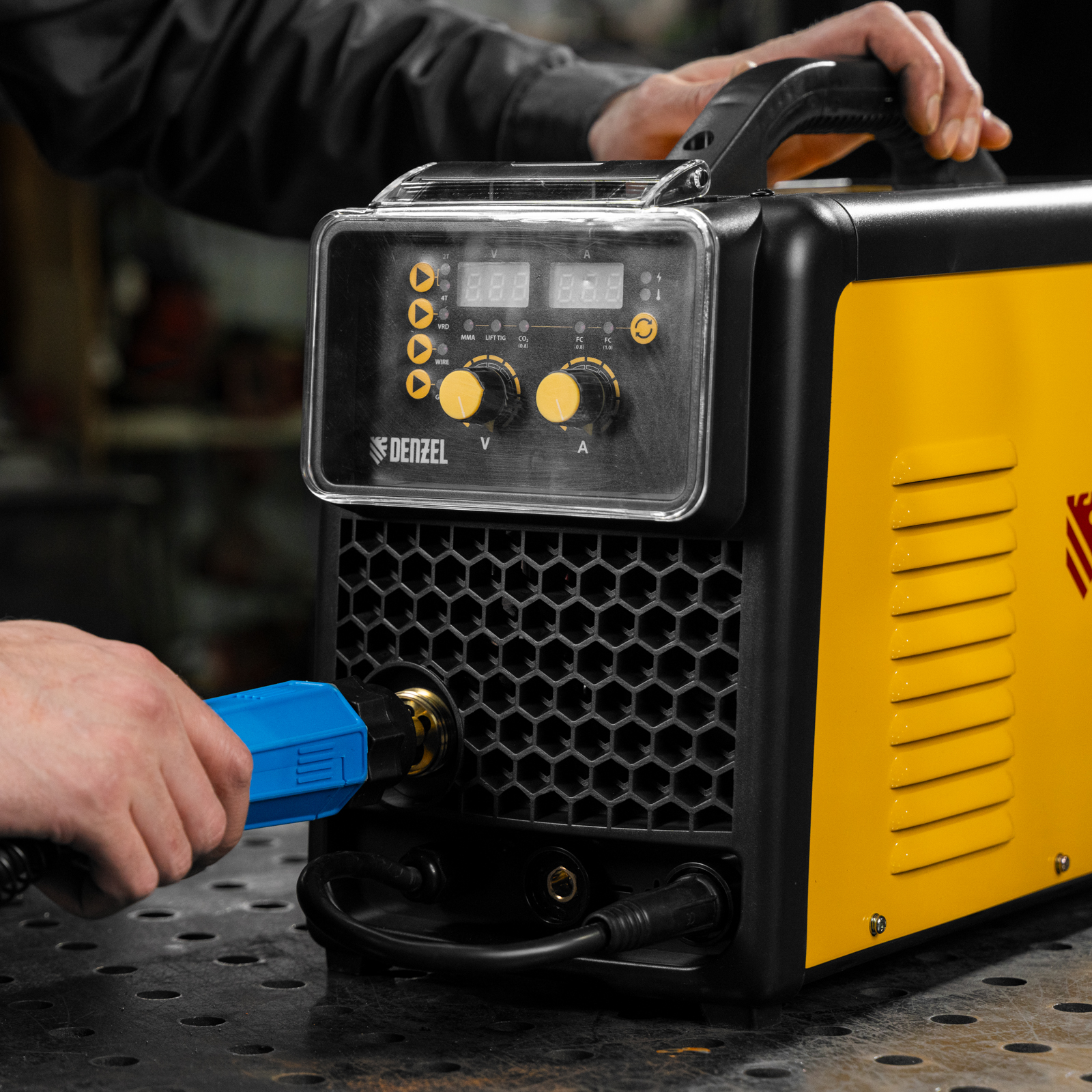 - Режим VRD для сварки MMA — работа с пониженным напряжением холостого хода обеспечивает безопасность пользователя во время перерыва или при замене электрода.