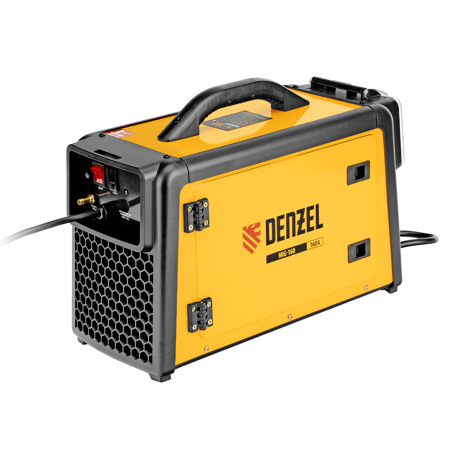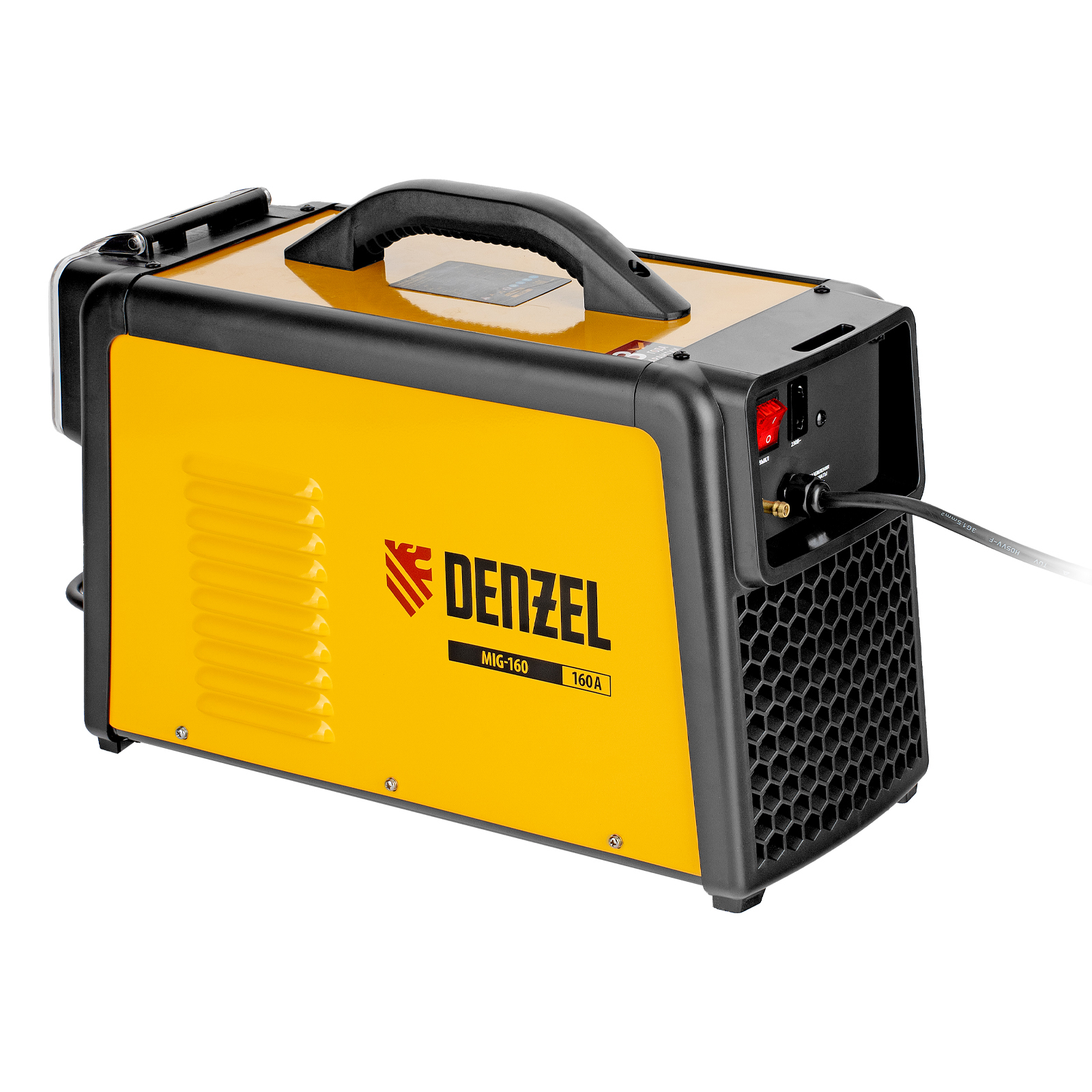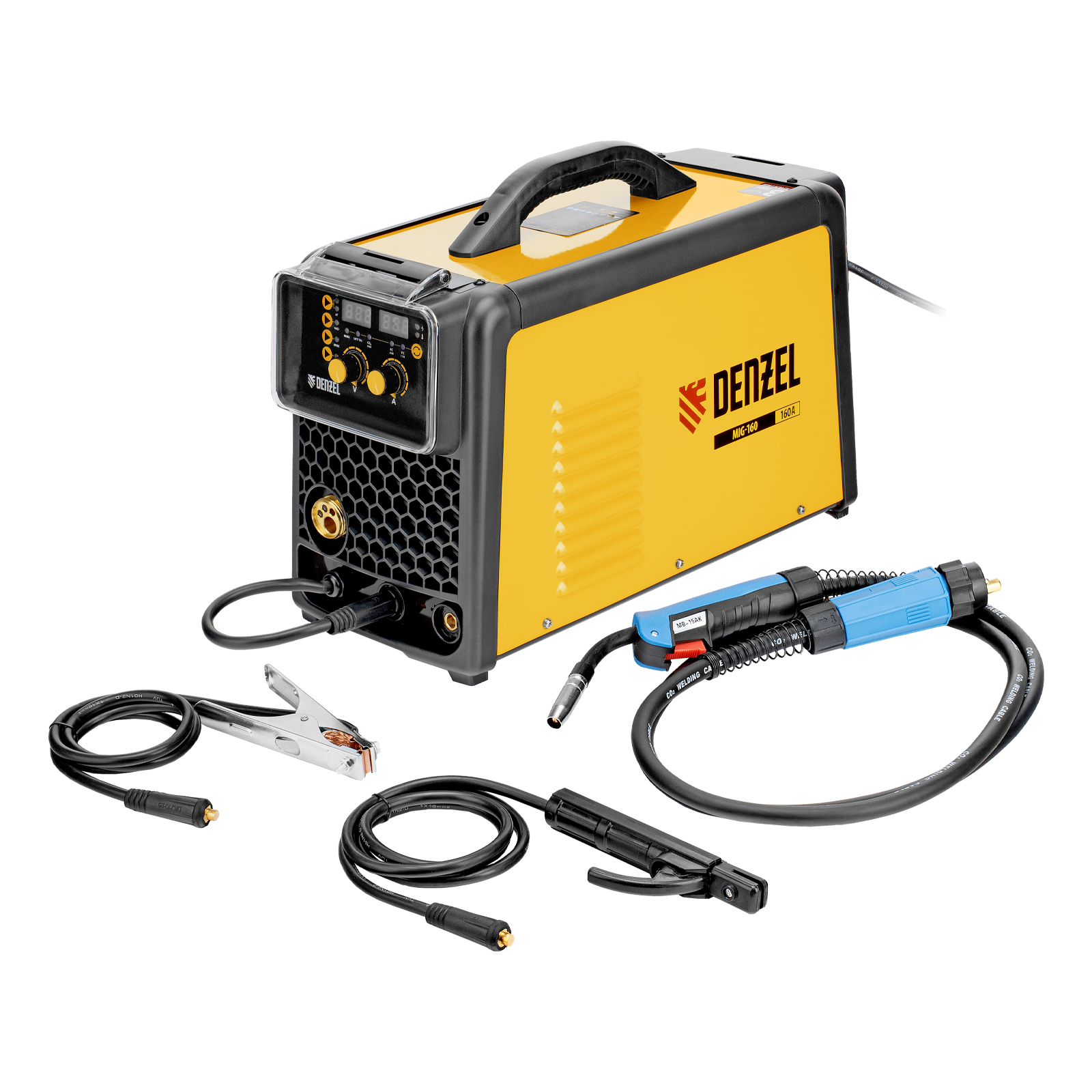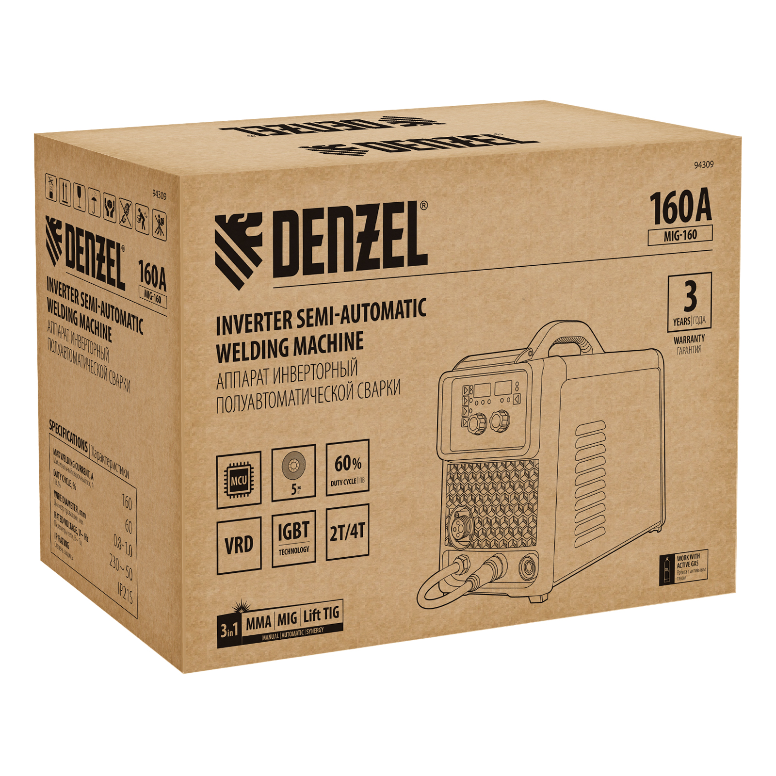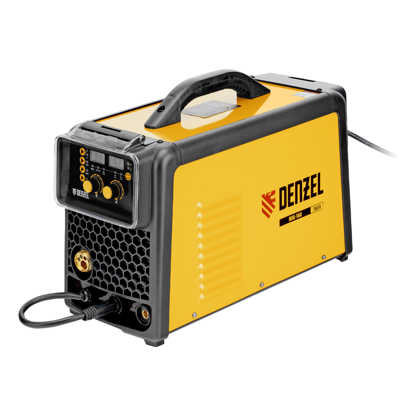 Инверторный аппарат полуавтоматической сварки Denzel MIG-160 94309 совместим с катушками массой до 5 кг, работает со максимальным сварочным током 160 A, продолжительность включения составляет 60%. Возможна сварка в среде защитного газа (MIG), порошковой проволокой (FCAW), аргонодуговая сварка неплавящимся электродом (Lift TIG, горелка приобретается отдельно), а также ручная дуговая сварка покрытым электродом (MMA).