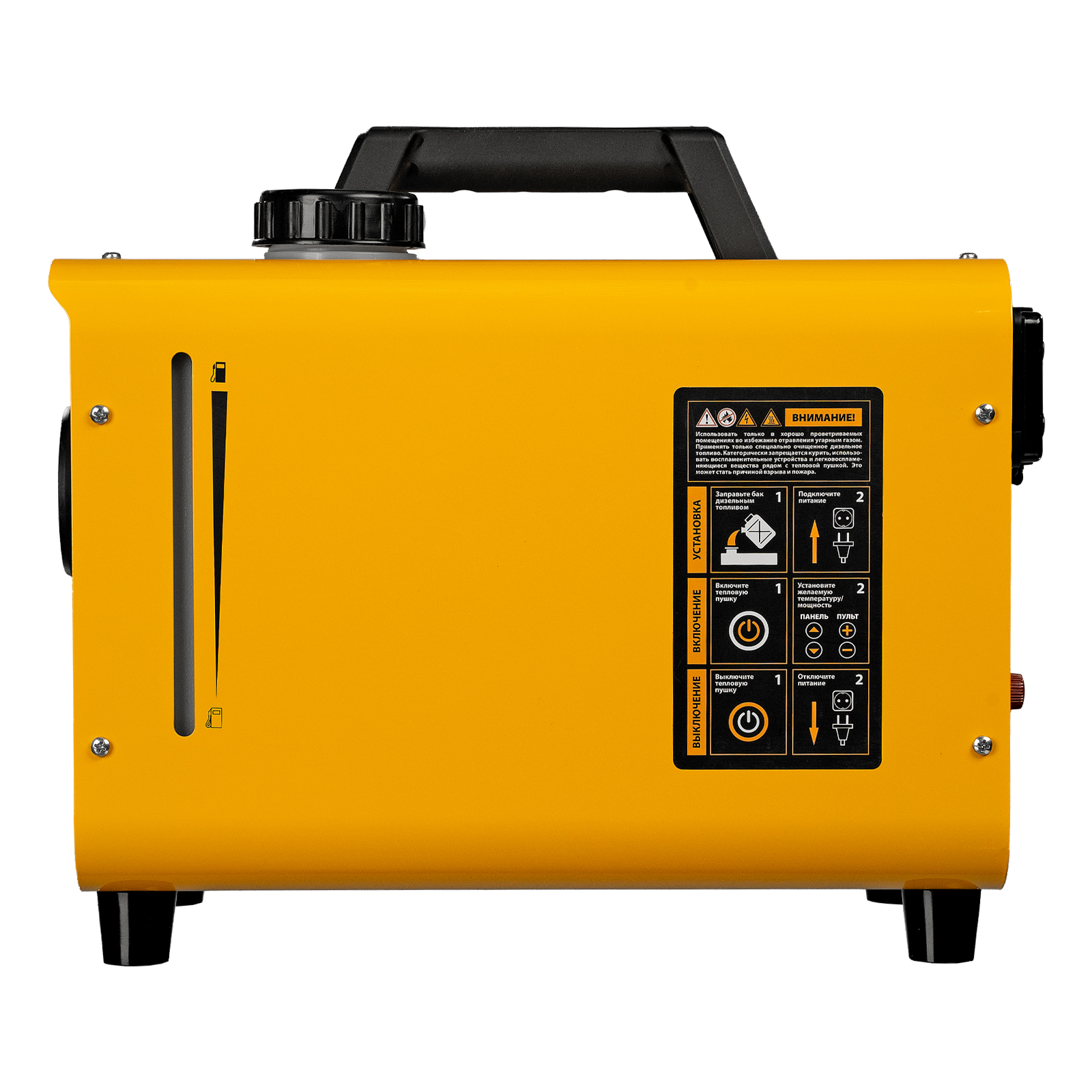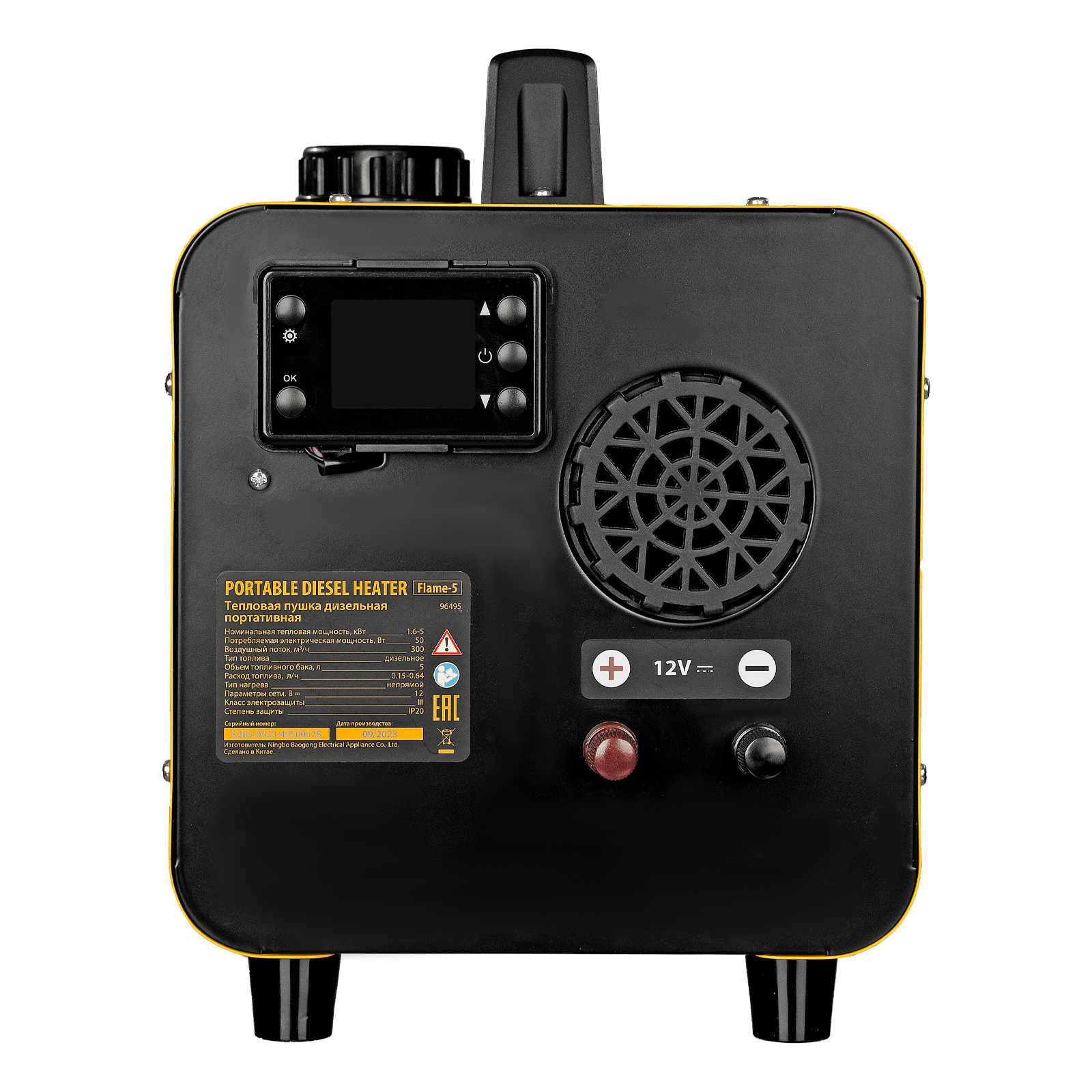 Дизельная тепловая портативная пушка Denzel Flame-5 96495 представляет собой автономный отопитель с максимальной мощностью 5 кВт, с цифровым термостатом. Работает по принципу непрямого нагрева, то есть выхлопные газы выводятся отдельно, не смешиваясь с потоком теплого воздуха. Предназначена для обогрева жилых, бытовых, подсобных и строительных помещений площадью до 50 м2. Портативную пушку размером 412 х 250 х 340 мм удобно перемещать и можно использовать в местах, удаленных от электричества, например, в поездке, походах, на рыбалке и для обогрева автомобиля.