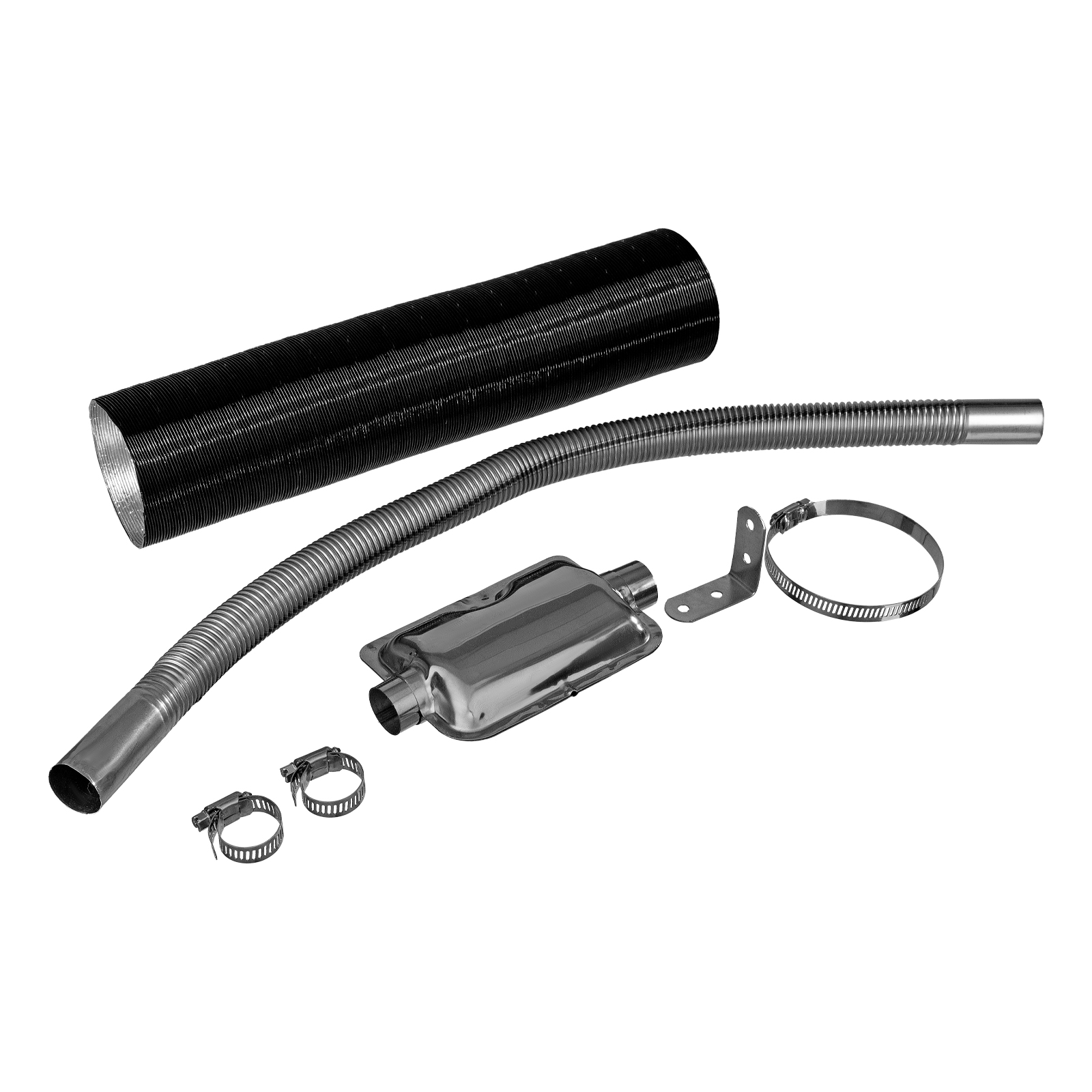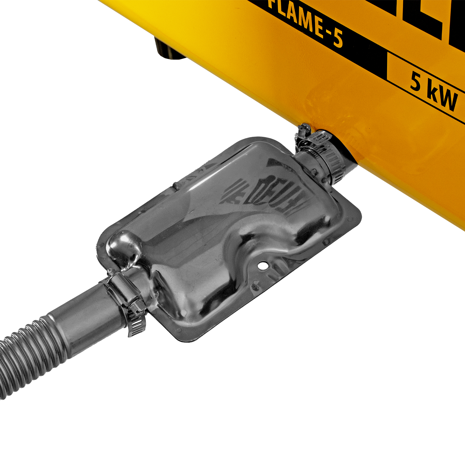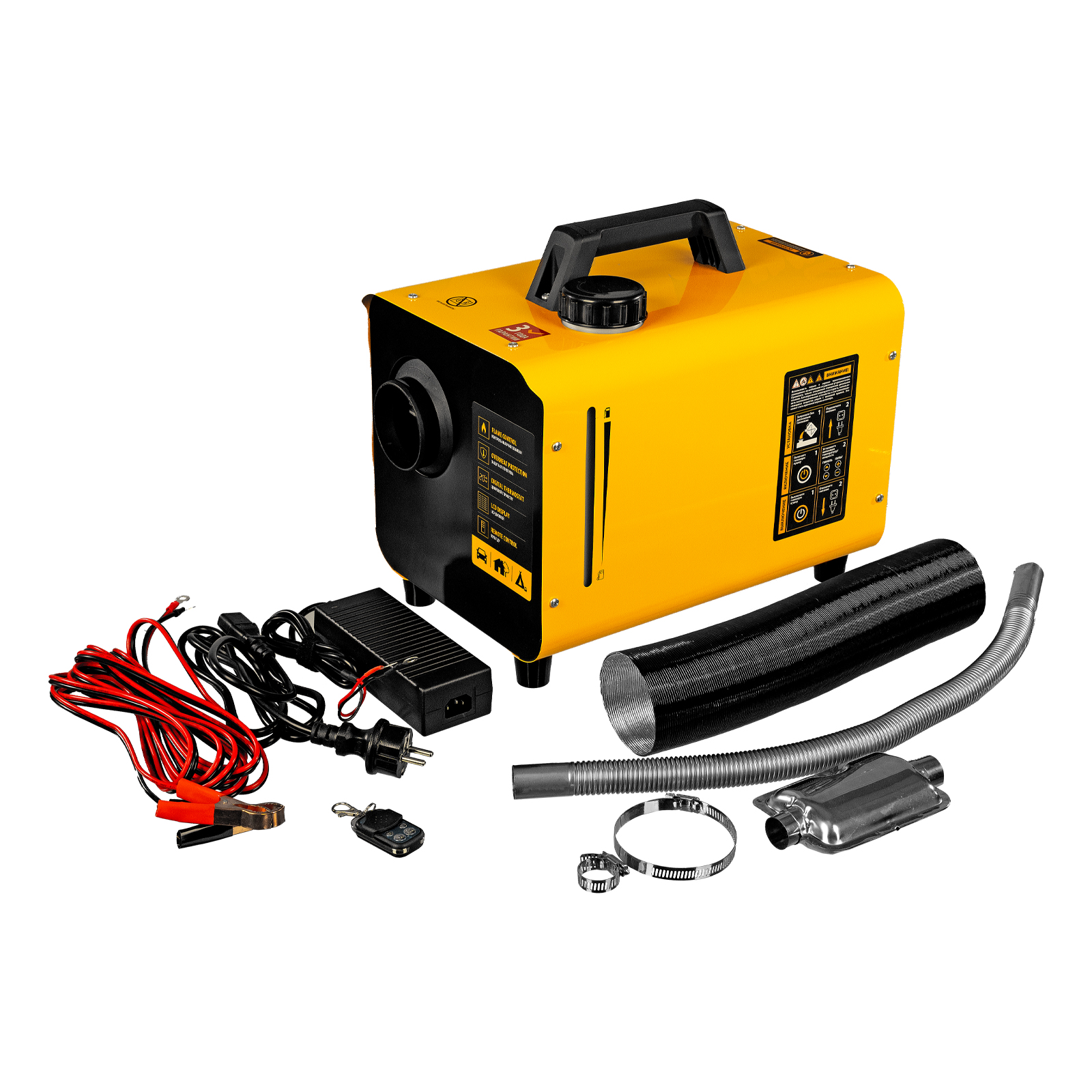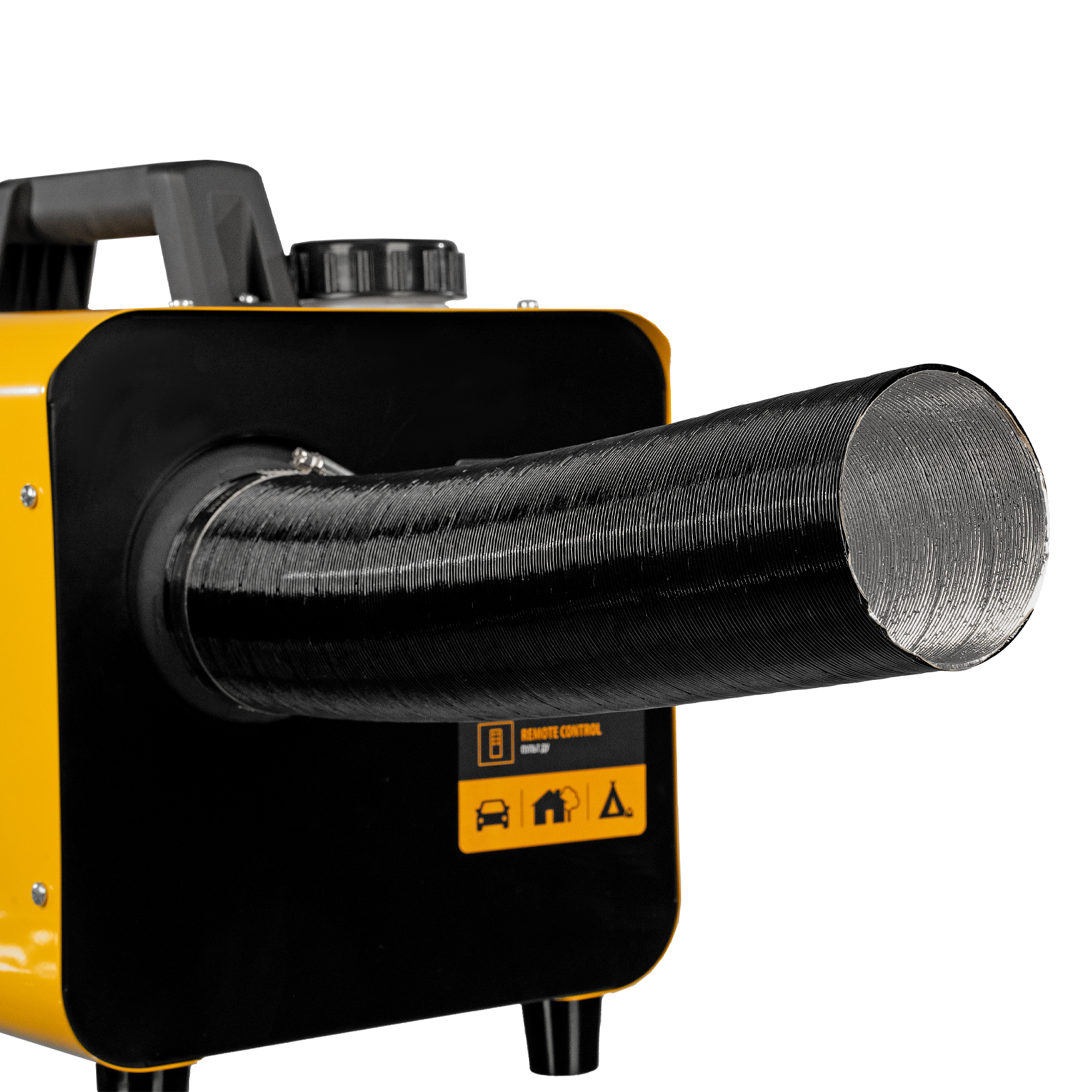 - Полная комплектация — к пушке прилагаются гофротруба и труба для отвода выхлопных газов, кабель питания от аккумулятора с клеммами 5 м, блок питания от сети 230 В (длина шнура 3 м), хомуты и глушитель.