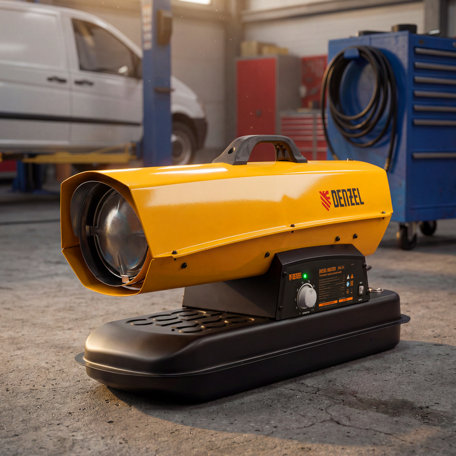 Дизельная тепловая пушка Denzel DHG-25i 96483 номинальной тепловой мощностью 25 кВт и производительностью 600 куб. м/ч, с прямым типом нагрева, с электронным термостатом, предназначена для обогрева цехов, складов, теплиц и других нежилых помещений. Используется в строительстве и на производстве. Пушка характеризуется низким расходом топлива: полного бака хватает на 10 часов работы. Важно: в обогреваемом помещении необходимо обеспечить хорошую вентиляцию.
