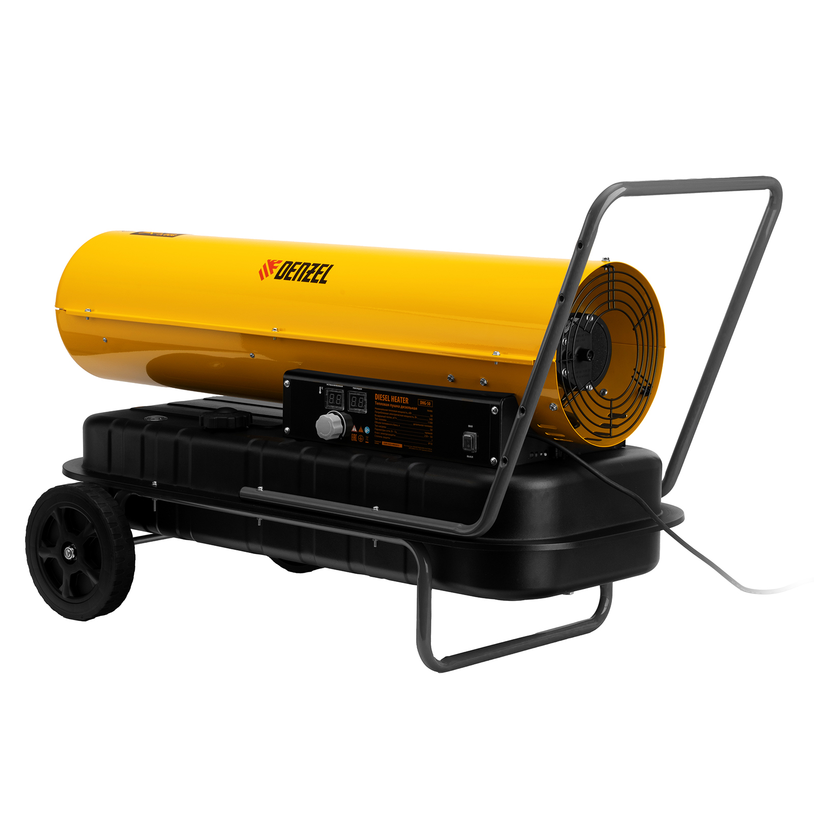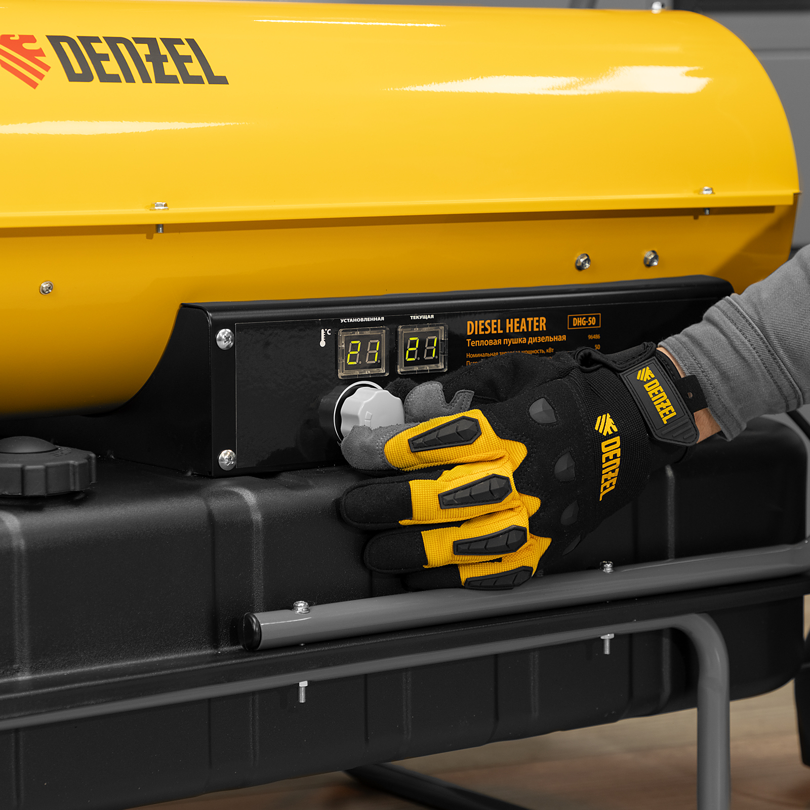 Дизельная тепловая пушка Denzel DHG-50 96486 мощностью 50 кВт и производительностью 1100 куб. м/ч предназначена для прямого нагрева воздуха в цехах, ангарах, хранилищах и других нежилых помещениях с хорошей вентиляцией. Максимальная площадь обогрева составляет 500 кв. м. Пушка служит эффективным источником тепла в полярных экспедициях. Пригодится также на строительной площадке для прогрева бетона, просушки стен и разморозки траншей. Для заправки может использоваться любое дизельное топливо: летнее, зимнее и арктическое.