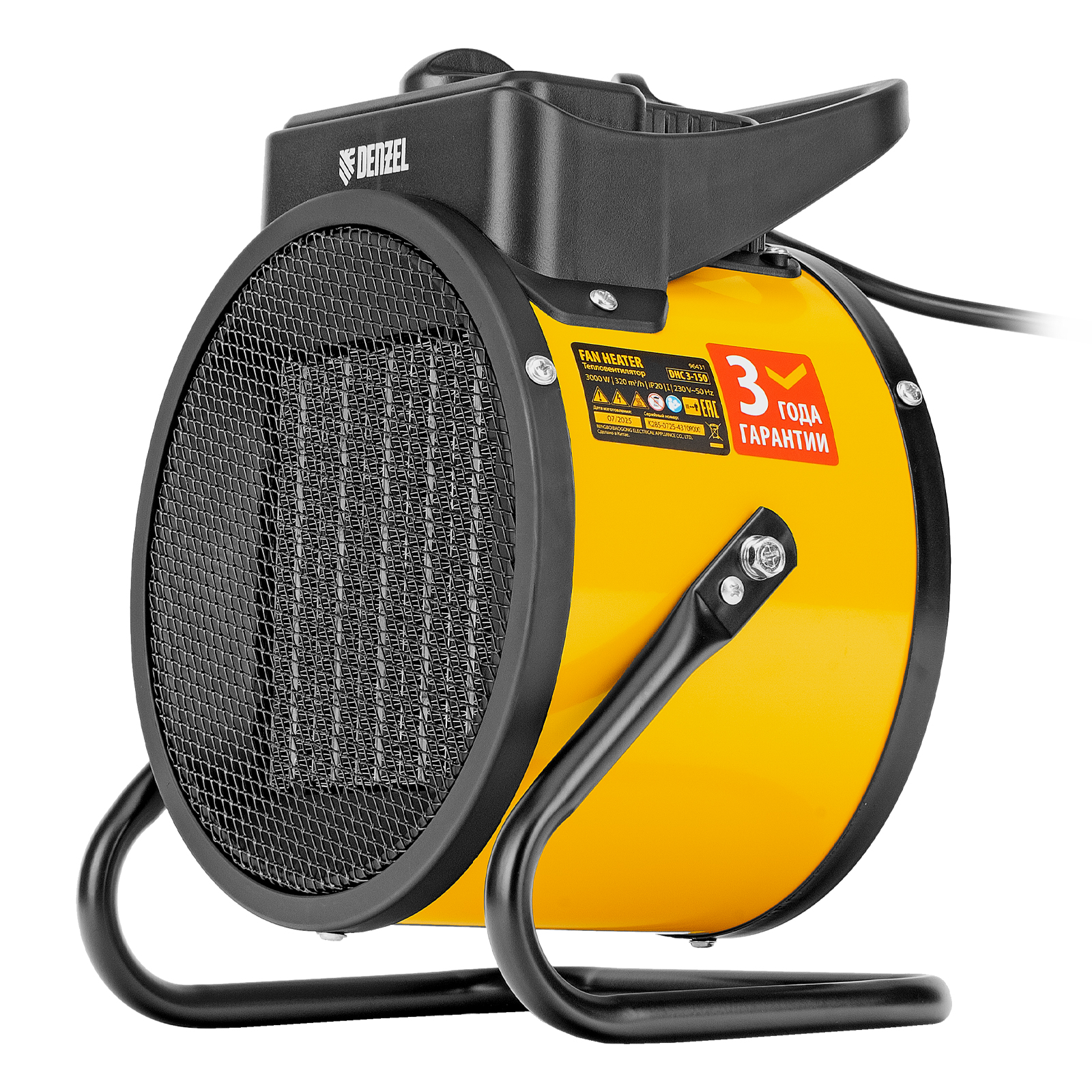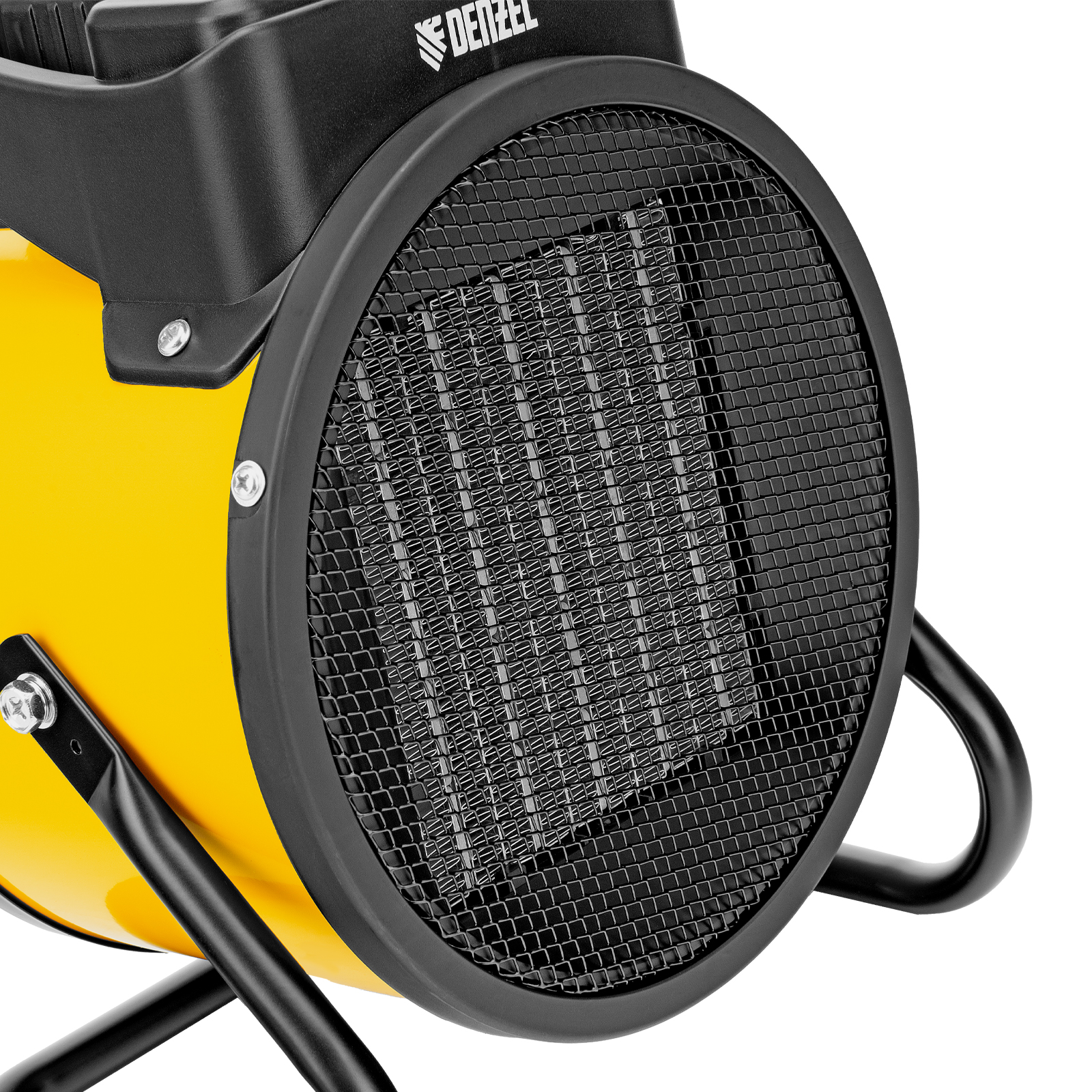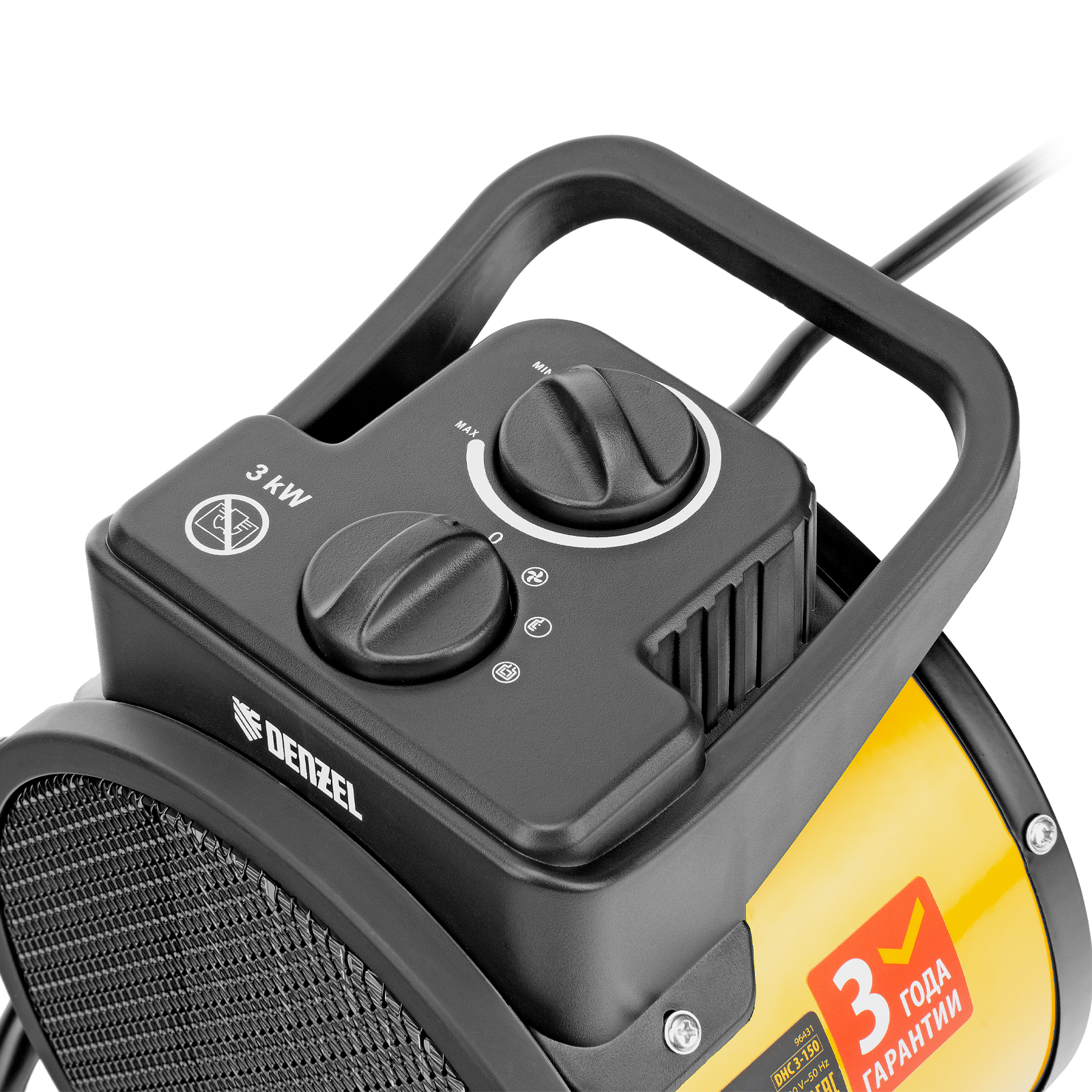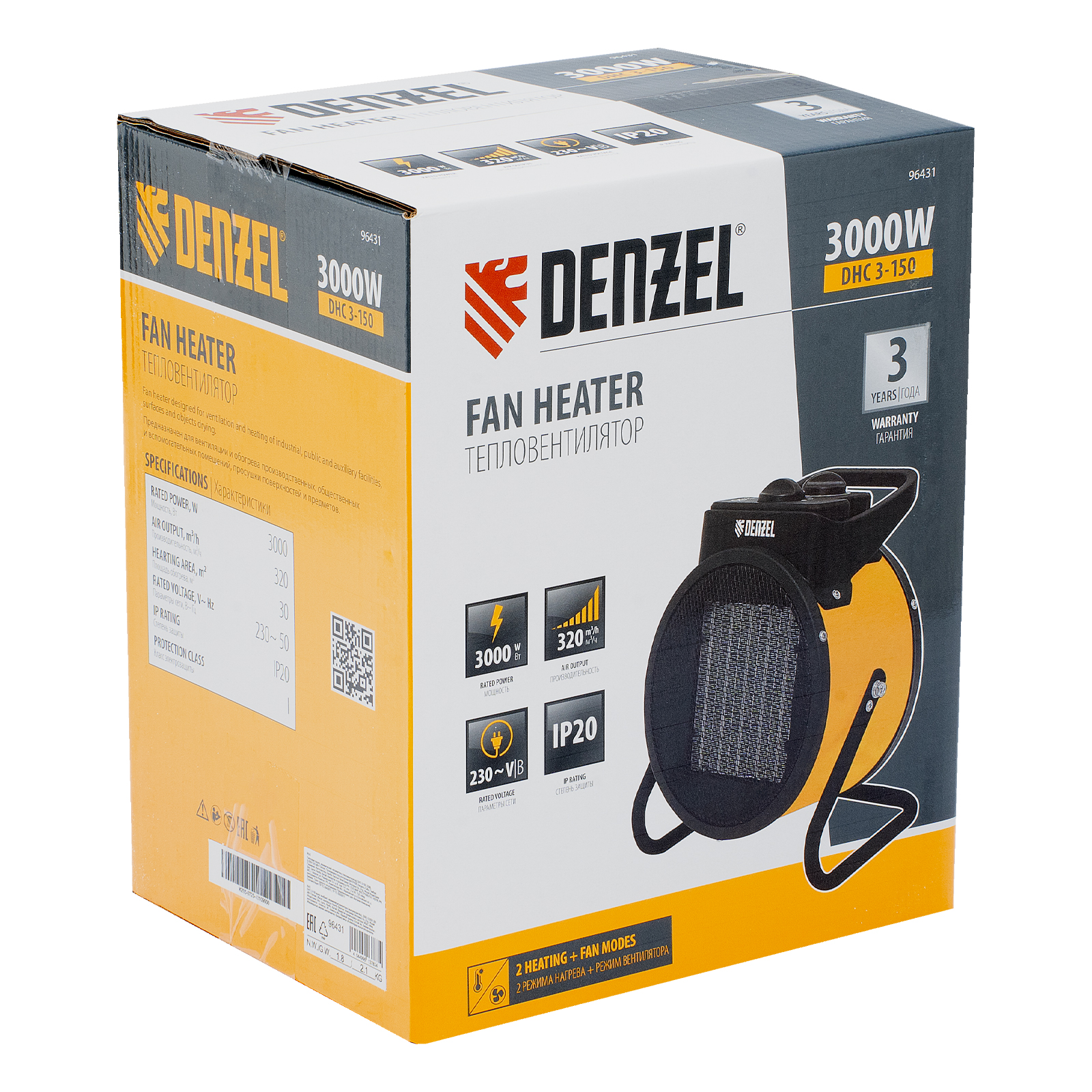 Тепловая пушка Denzel DHC 3-150 96431 работает на мощности 0,025, 1,5 или 3 кВт в зависимости от установленного режима. Подходит для бытового и полупрофессионального применения. С ее помощью можно обогреть помещение площадью до 40 м² или дистанционно просушить поверхность после отделки (оштукатуренные и окрашенные стены, стяжки). Также устройство можно использовать как вентилятор в жару. Керамический нагревательный элемент не сушит воздух и не выделяет вредных веществ, поэтому тепловентилятор безопасен для людей и животных.