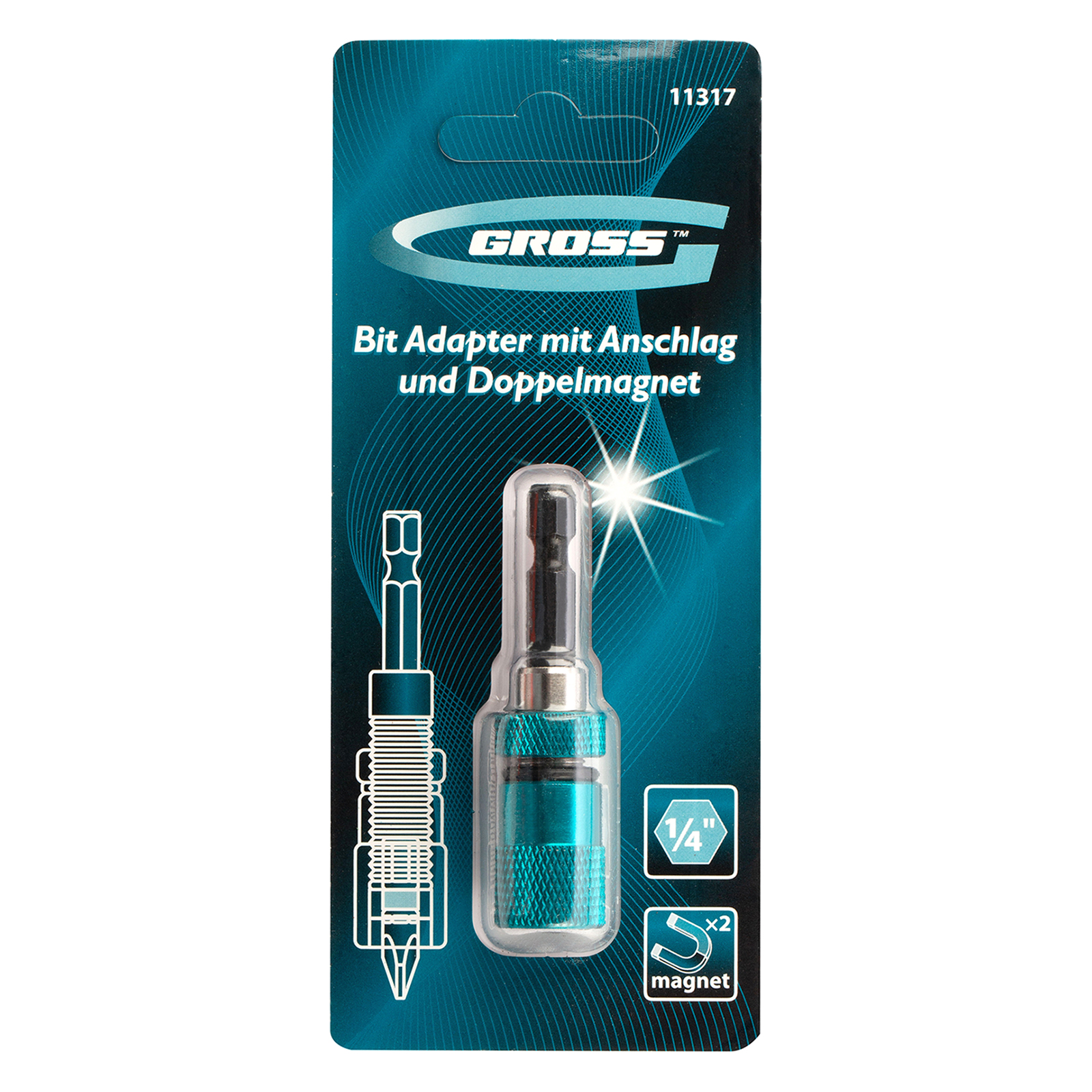 Адаптер для бит Gross 11317 с ограничителем и двойным магнитом, с присоединительным размером 1/4″, обеспечивает уверенную фиксацию сменных насадок при работе с шуруповертами. Вставляется в патрон шуруповерта и позволяет быстро менять биты. Настраиваемый ограничитель глубины вкручивания предотвращает чрезмерное заглубление крепежа в гипсокартон и другие мягкие материалы, защищая их от повреждения.