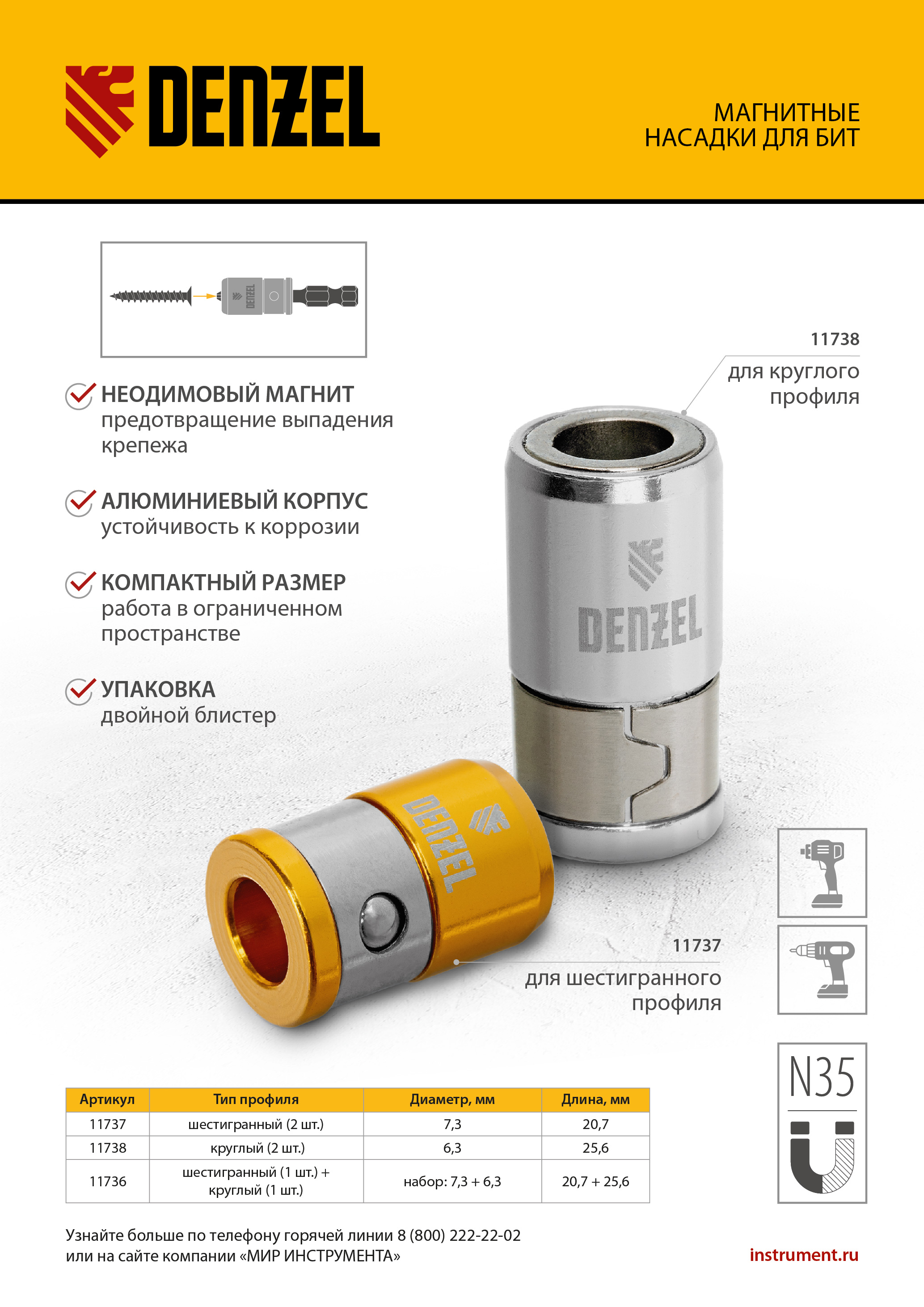 Магнитные насадки для бит Denzel 11738 предназначена для работы с битами с круглым профилем. Диаметр составляет 6,35 мм, длина — 25,6 мм. Магниты типа N35 позволяют быстро установить и надежно зафиксировать крепеж. Насадки упрощают работу с резьбовым крепежом при помощи ручного и электрического инструмента, совместимого с хвостовиками 1/4″.
