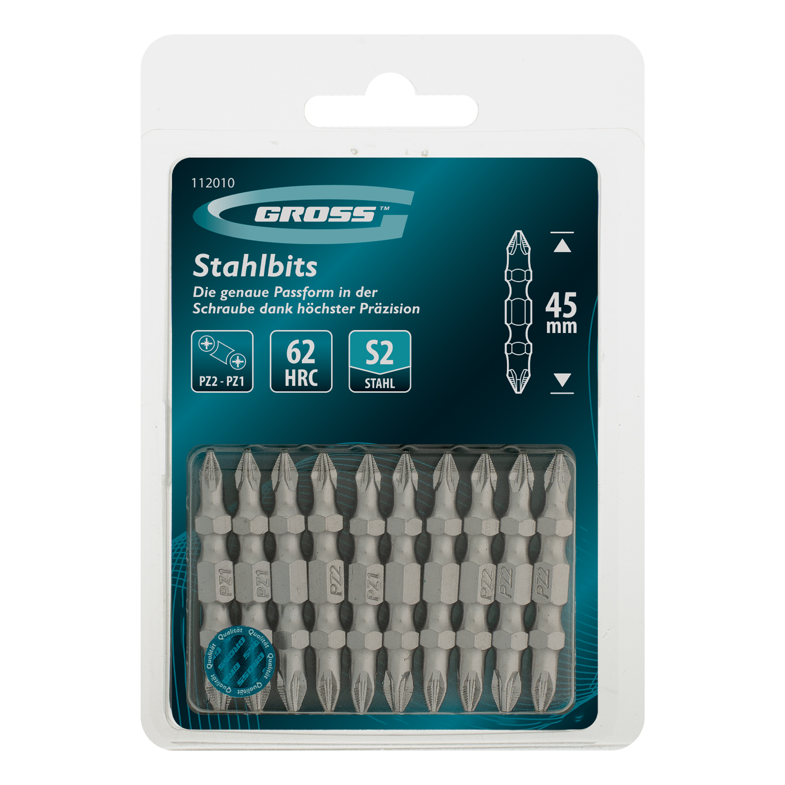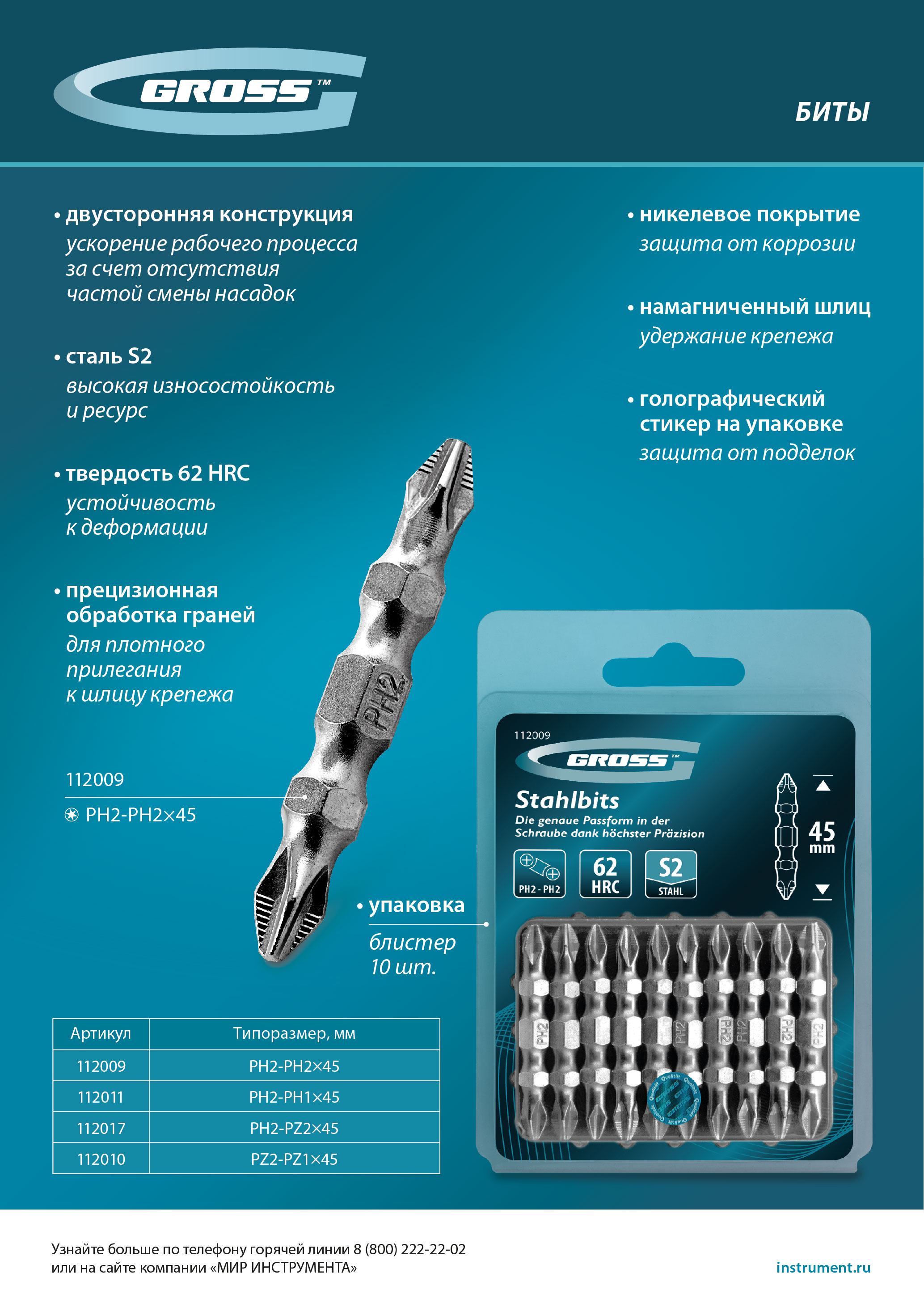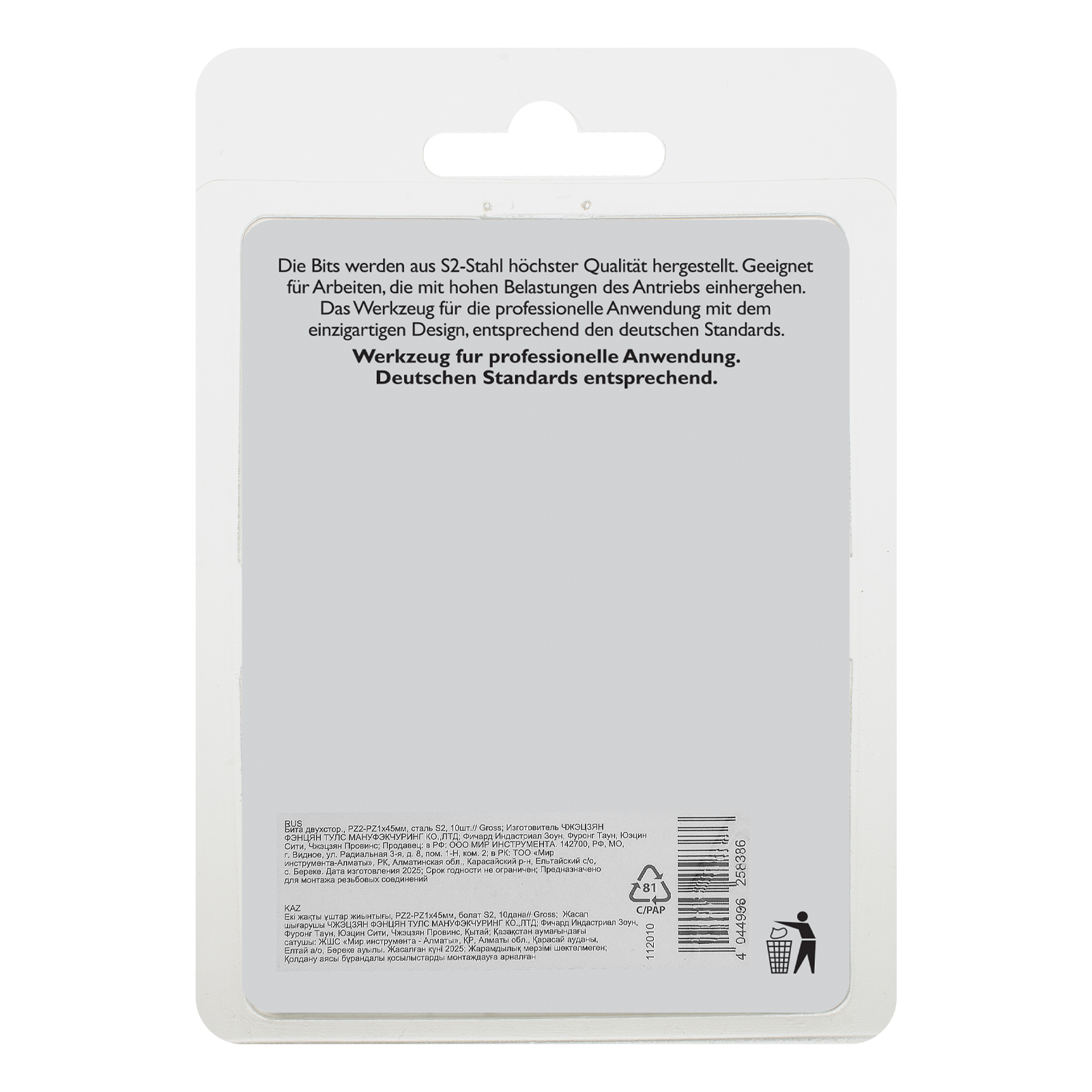 Двухсторонняя бита Gross 112010 входит в набор из 10 насадок PZ2-PZ1 х 45 мм, изготовленных из стали S2 и предназначенных для закручивания/откручивания саморезов по дереву и другого резьбового крепежа с помощью шуруповерта. Насадки с двумя рабочими профилями Pozidriv подходят как для бытового, так и для профессионального использования. Дополнительные ребра в шлице обеспечивают максимально плотное прилегание биты к шляпке метиза.