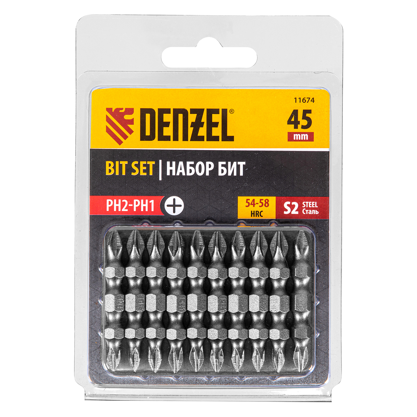 Набор двусторонних бит PH2-PH1 х 45 мм Denzel 11674 из стали S2 предназначен для монтажа/демонтажа саморезов по дереву и других резьбовых соединений с помощью шуруповерта. Насадки с двумя рабочими профилями самого востребованного типа Phillips подходят как для бытового, так и для профессионального использования.