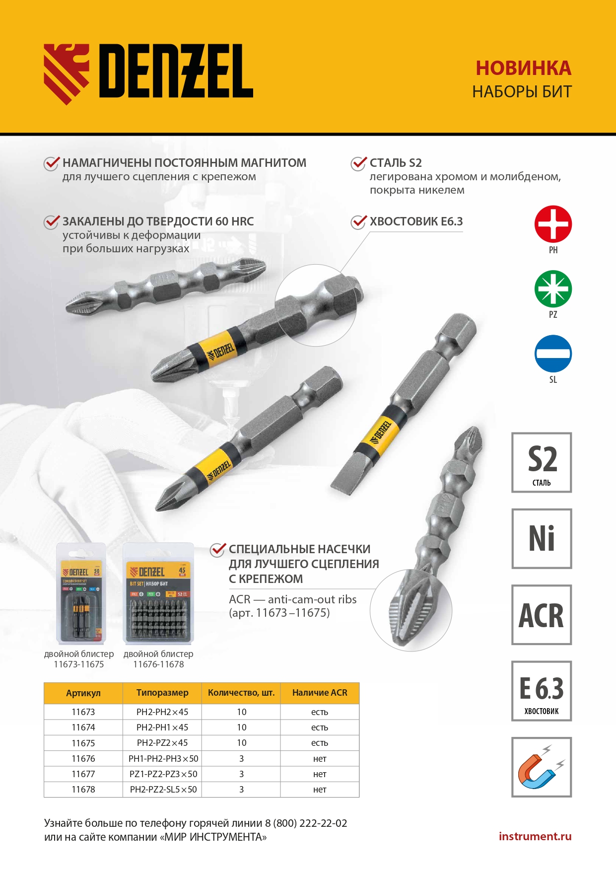 Набор двусторонних бит PH2-PZ2 х 45 мм Denzel 11675 из стали S2 предназначен для монтажа/демонтажа саморезов по дереву и других резьбовых соединений с помощью шуруповерта. Насадки с самыми востребованными на рынке рабочими профилями Phillips и Pozidriv подходят как для бытового, так и для профессионального использования. Дополнительные ребра в шлице Позидрайв обеспечивают максимально плотное прилегание биты к шляпке метиза соответствующего типоразмера.