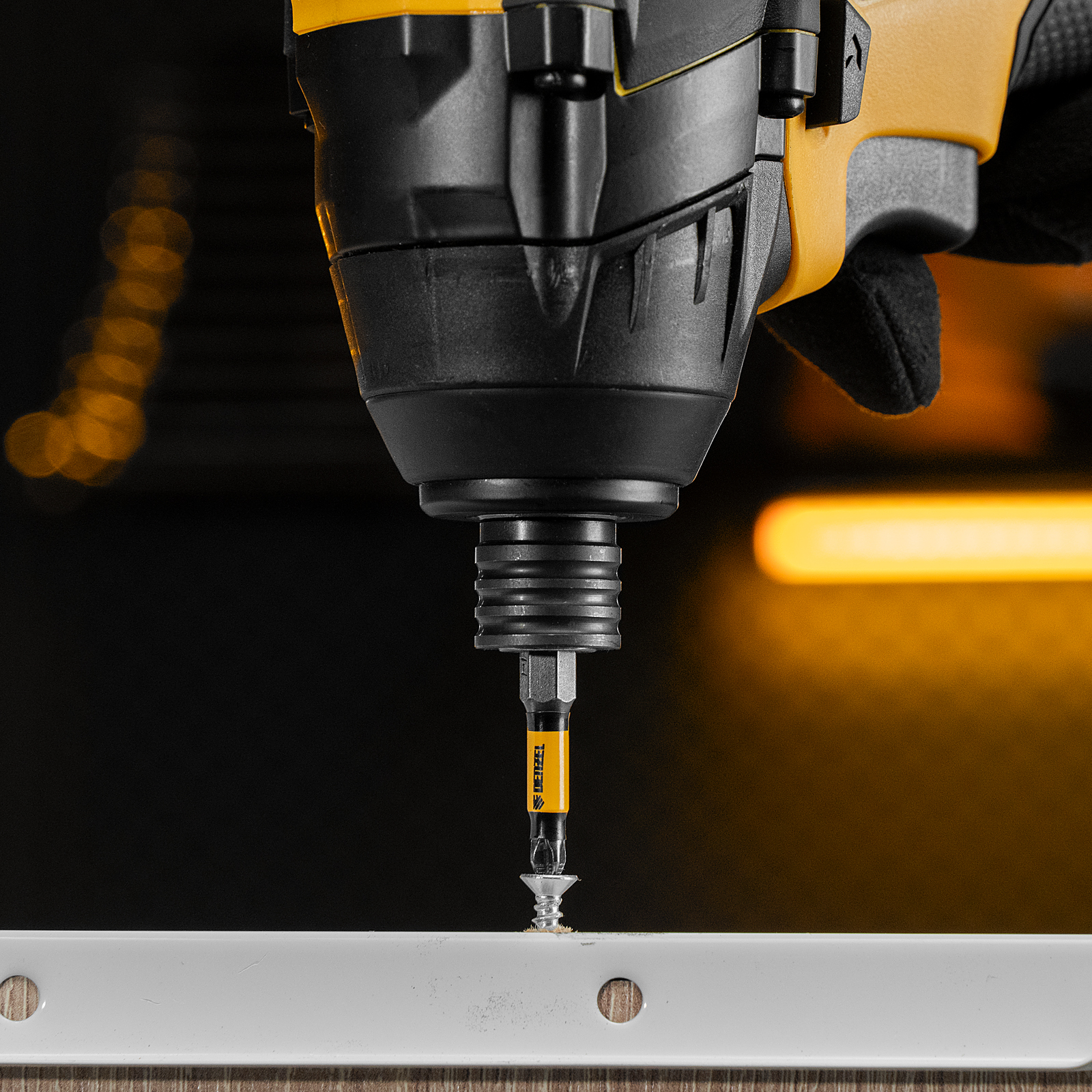 - Защита от подделок — цветное кольцо с логотипом ТМ Denzel на каждой бите подтверждает оригинальность товара.