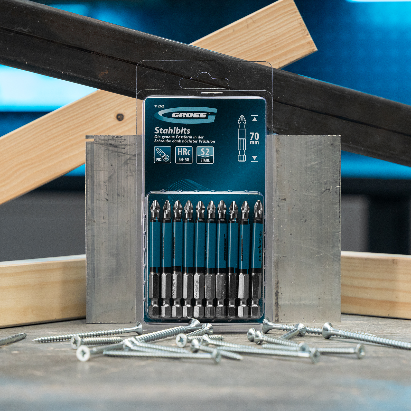 Набор односторонних бит с круглым профилем PH2 x 70 мм Gross 11262 — это 10 сменных насадок из стали S2 с крестообразными шлицами и шестигранными хвостовиками 1/4 дюйма, рассчитанные на работу с шуруповертом. Профессиональная оснастка обеспечивает быстрый монтаж и демонтаж резьбовых соединений с углублением PH2.