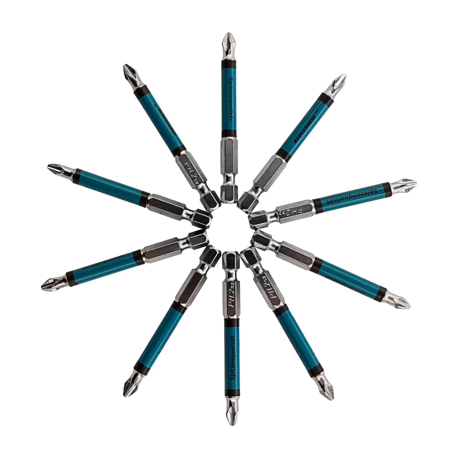 - Износоустойчивость — биты изготовлены из японской легированной стали S2 повышенной прочности и закалены до твердости 54-58 HRC.