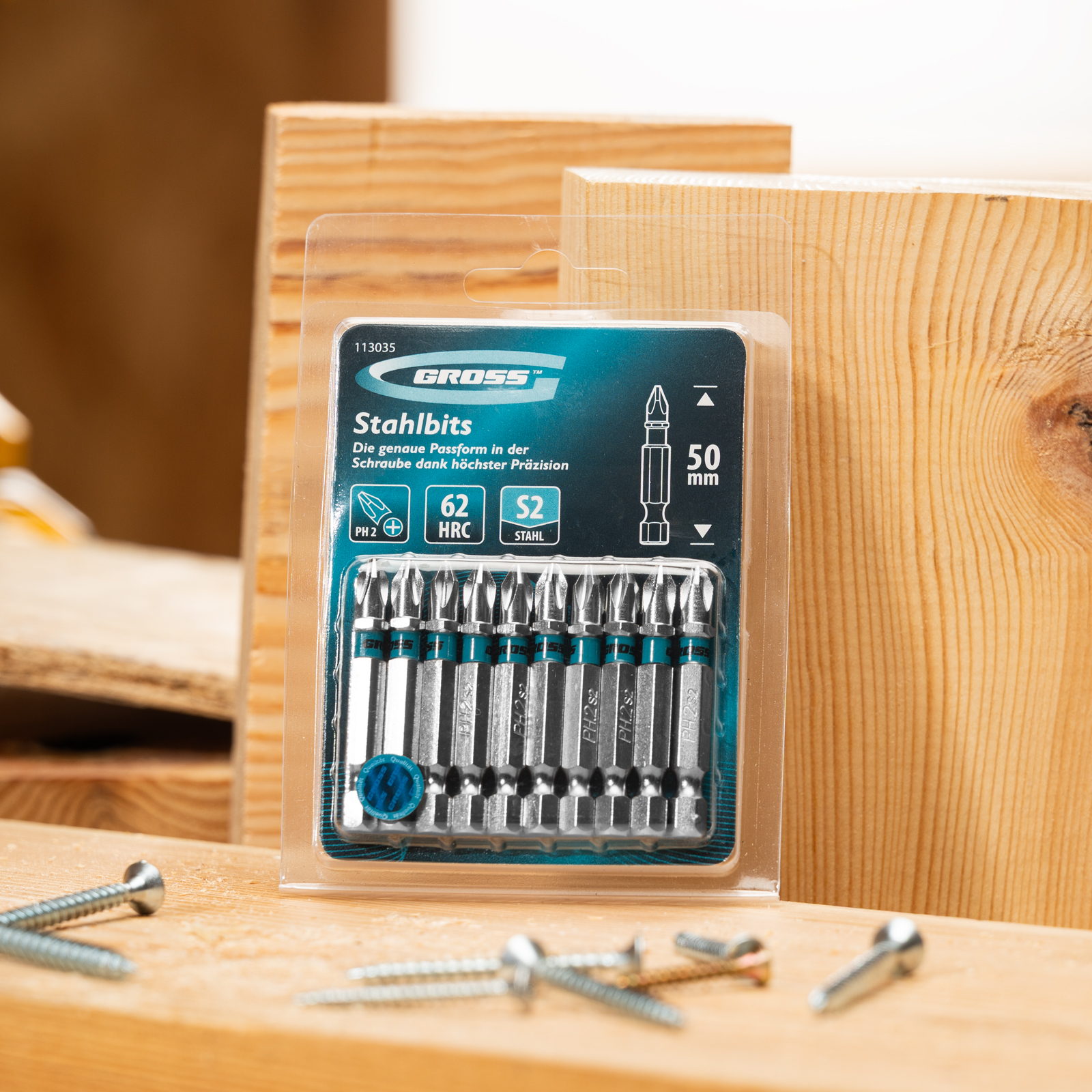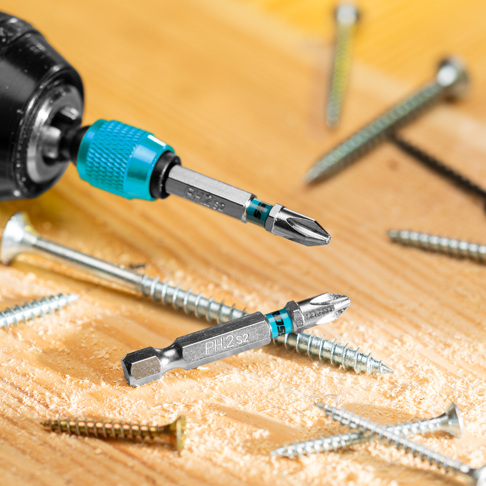 - Износостойкость — биты выполнены из японской легированной стали S2 повышенной прочности, рабочие части закалены до твердости 62 HRC.