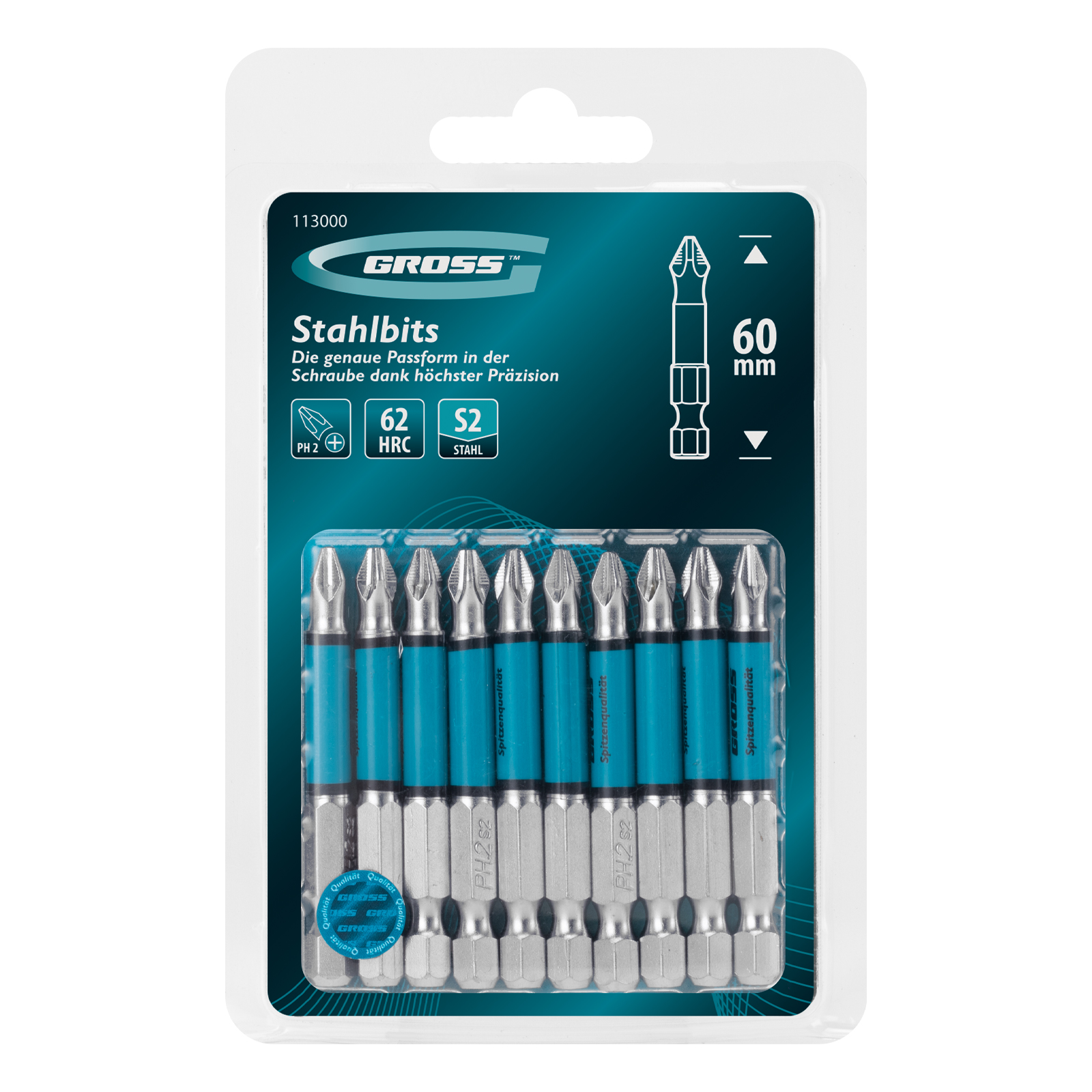 Набор односторонних бит Gross 113000 состоит из 10 сменных насадок PH2 x 60 из стали S2, с круглым профилем, крестообразными шлицами и шестигранными хвостовиками 1/4″, предназначенных для работы с шуруповертом. Профессиональная оснастка обеспечивает быстрый монтаж и демонтаж резьбовых соединений с профилем PH2.