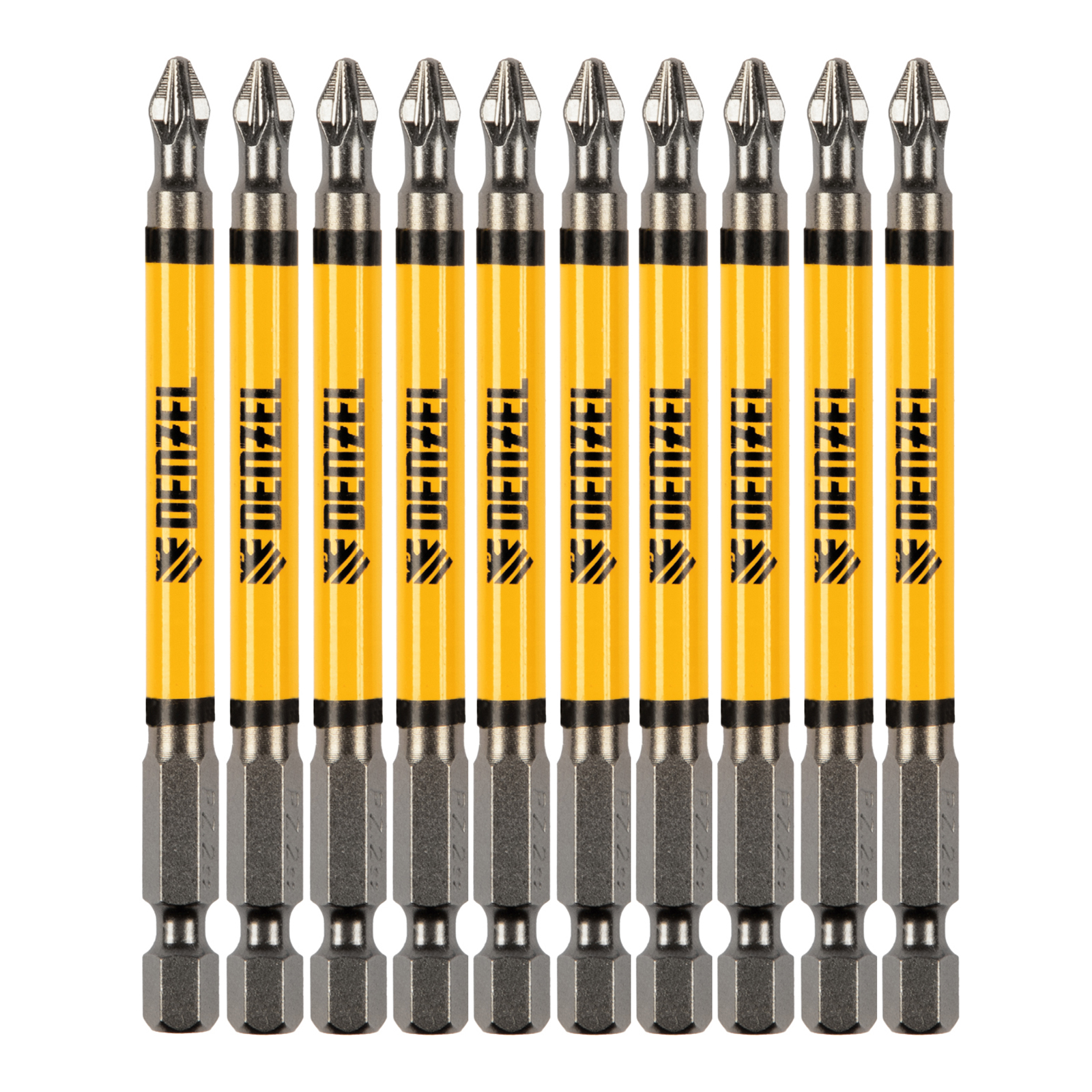 Набор односторонних бит PZ x 90 мм Denzel 11645 включает в себя 10 сменных насадок из стали S2 с крестообразными шлицами Pozidriv и шестигранными хвостовиками 1/4". Профессиональная оснастка рассчитана на работу с шуруповертом, обеспечивает быстрый монтаж и демонтаж резьбовых соединений с углублением PZ2. Устойчивое сцепление с крепежом благодаря дополнительным ребрам на шлице Позидрайв позволяет увеличить крутящий момент и снизить риск соскакивания биты.