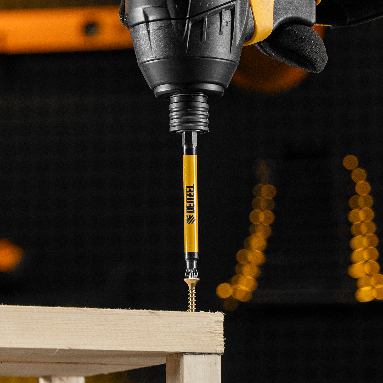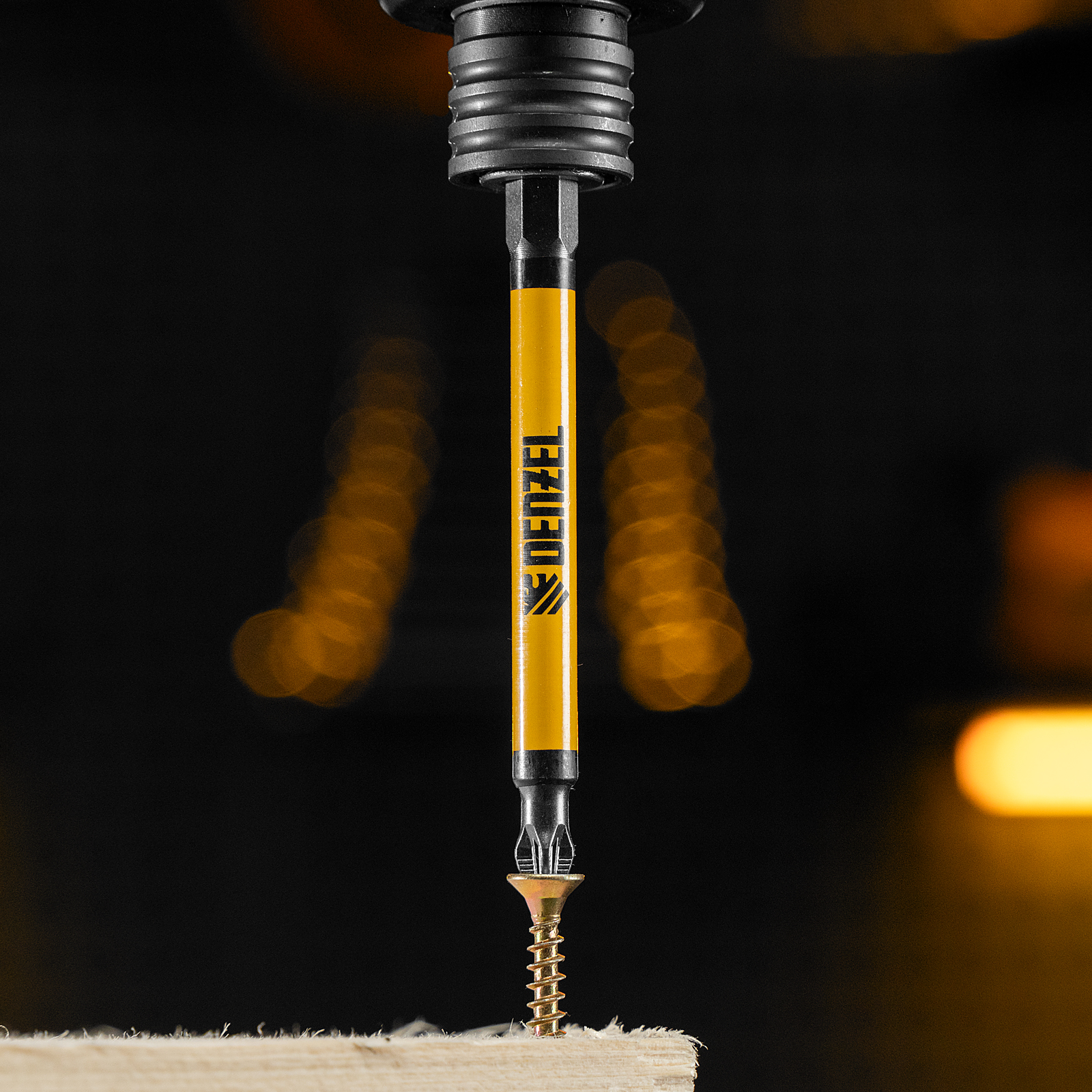 - Высокая результативность даже в ограниченном пространстве — благодаря удлиненному до 90 мм профилю битами удобно работать в труднодоступных местах.