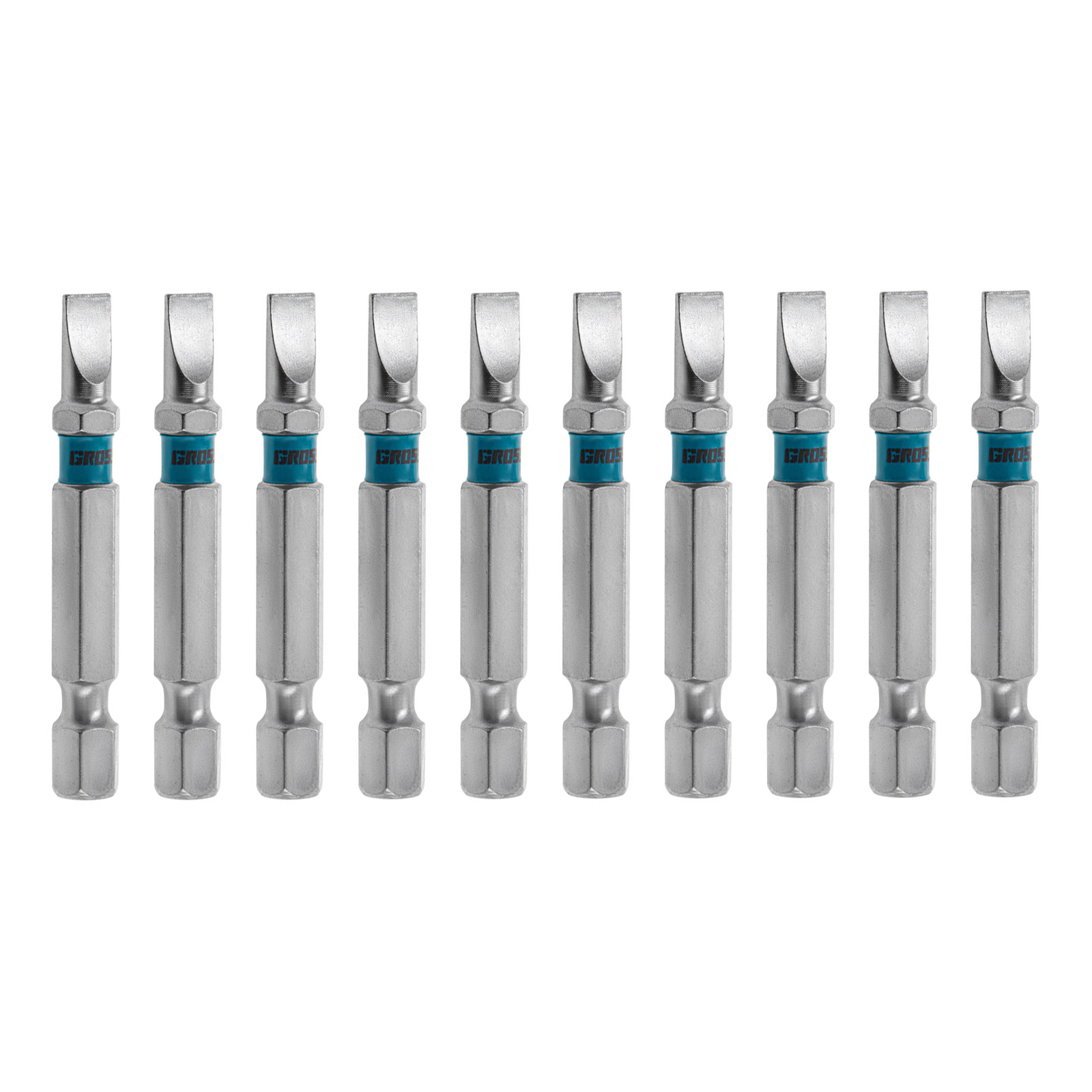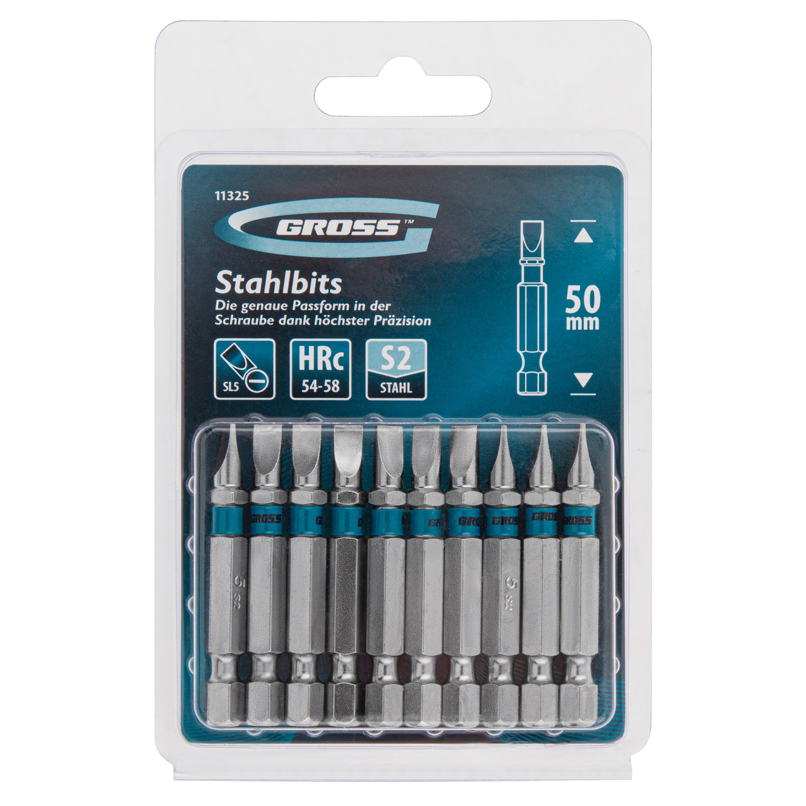 Набор бит Gross 11325 типоразмера SL5,0 х 50 включает в себя 10 сменных насадок из стали S2 для шуруповертов и отверток-адаптеров с присоединительным шестигранником 1/4 дюйма. Биты со шлицами «минус» размером 5 мм применяются для монтажа и демонтажа винтов, саморезов и других резьбовых соединений.