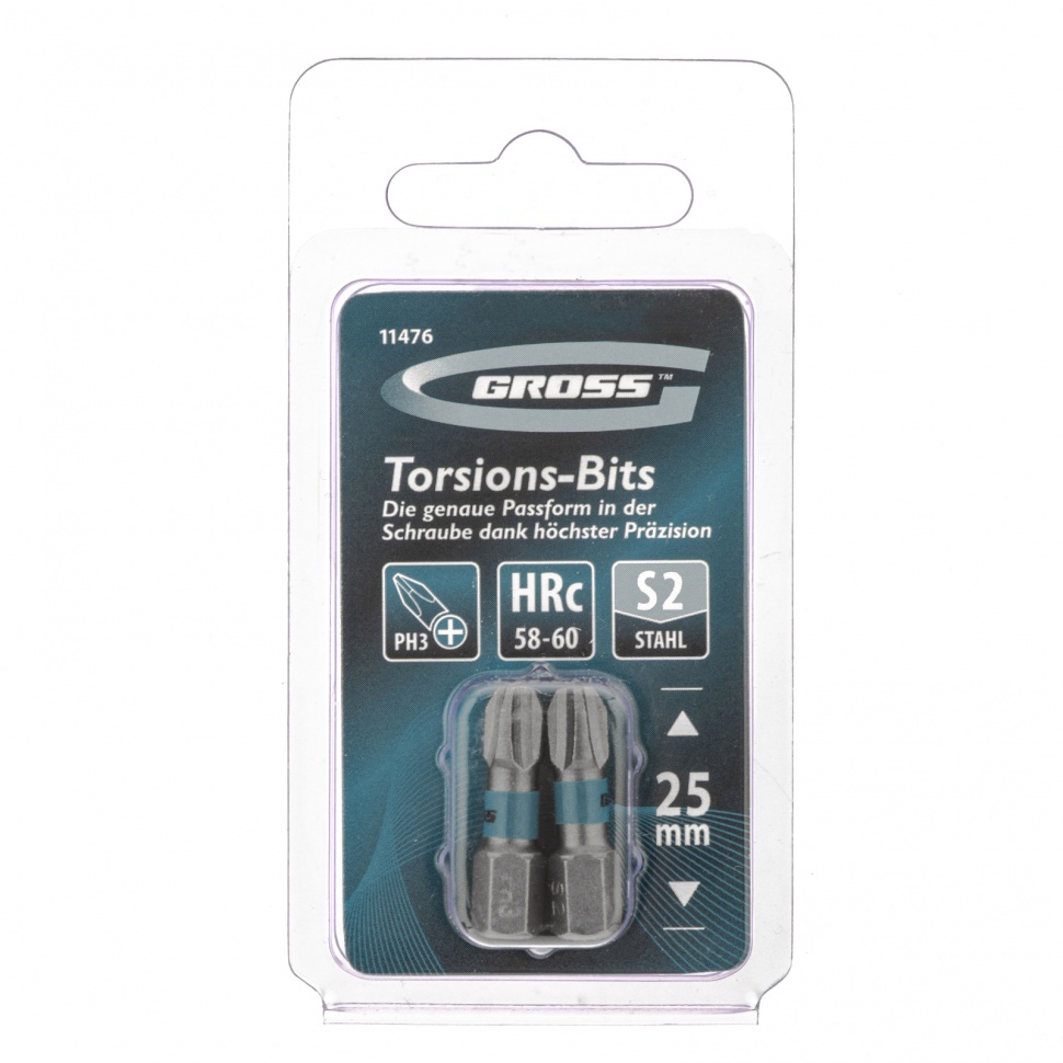 Набор торсионных бит PH3 x 25 мм Gross 11476, 2 шт., предназначен для монтажа и демонтажа резьбовых соединений с помощью ударного шуруповерта. Он незаменим в строительных, слесарных и монтажных работах, в автосервисах, при проведении ремонта в доме. Торсионная зона способна пружинить, за счет чего она частично амортизирует тангенциальный удар от шуруповерта. Такое решение позволяет равномерно распределить нагрузку по бите и избежать поломки шлица.