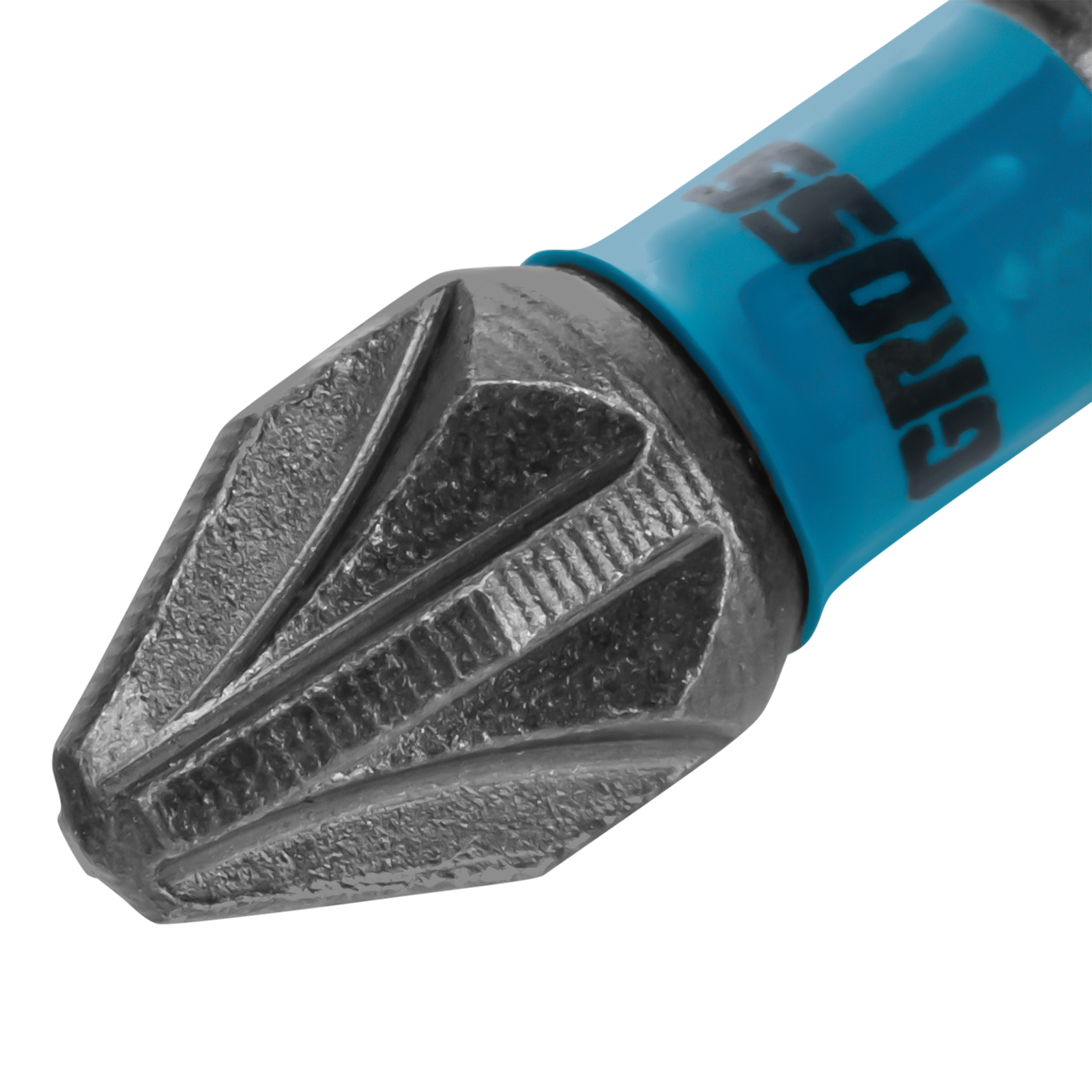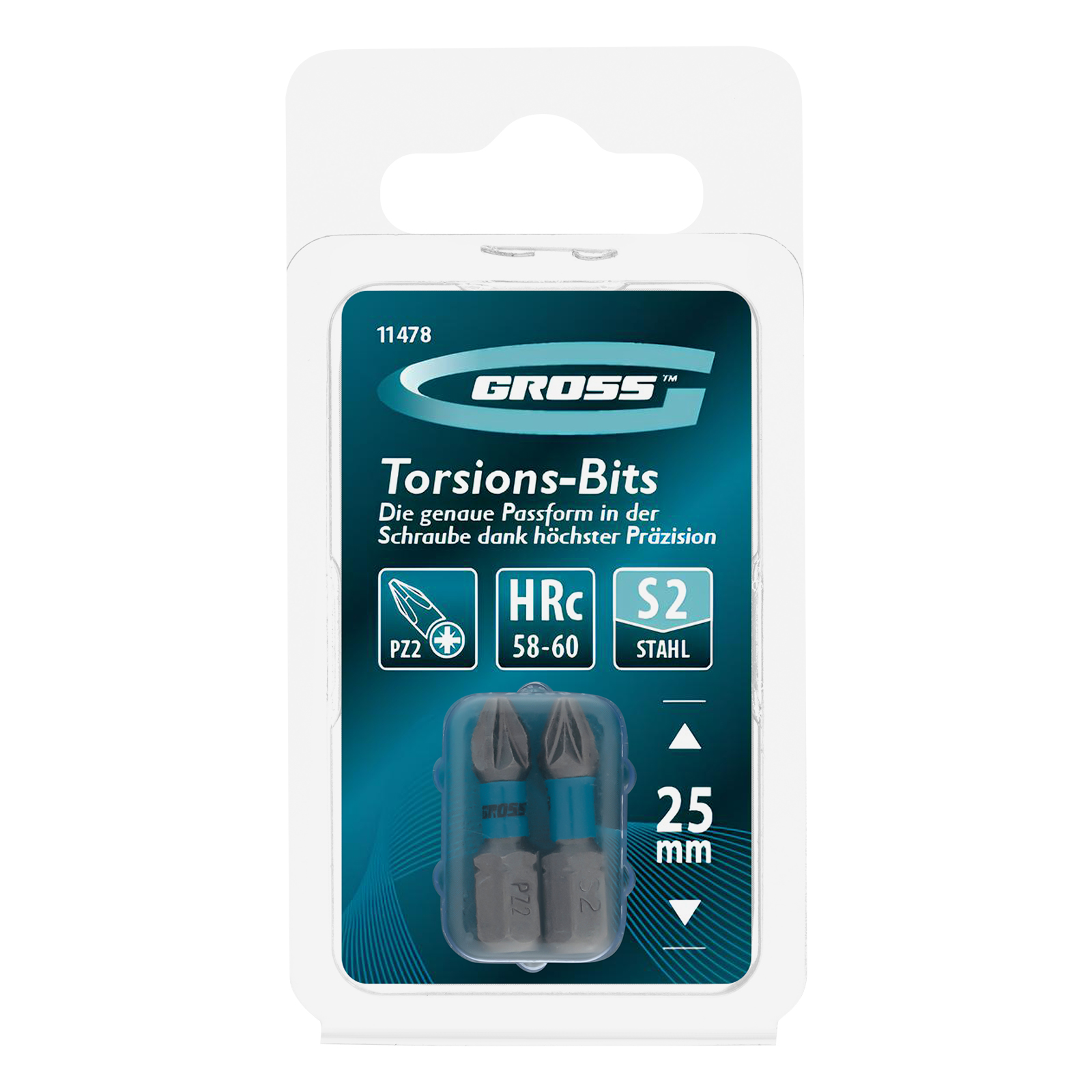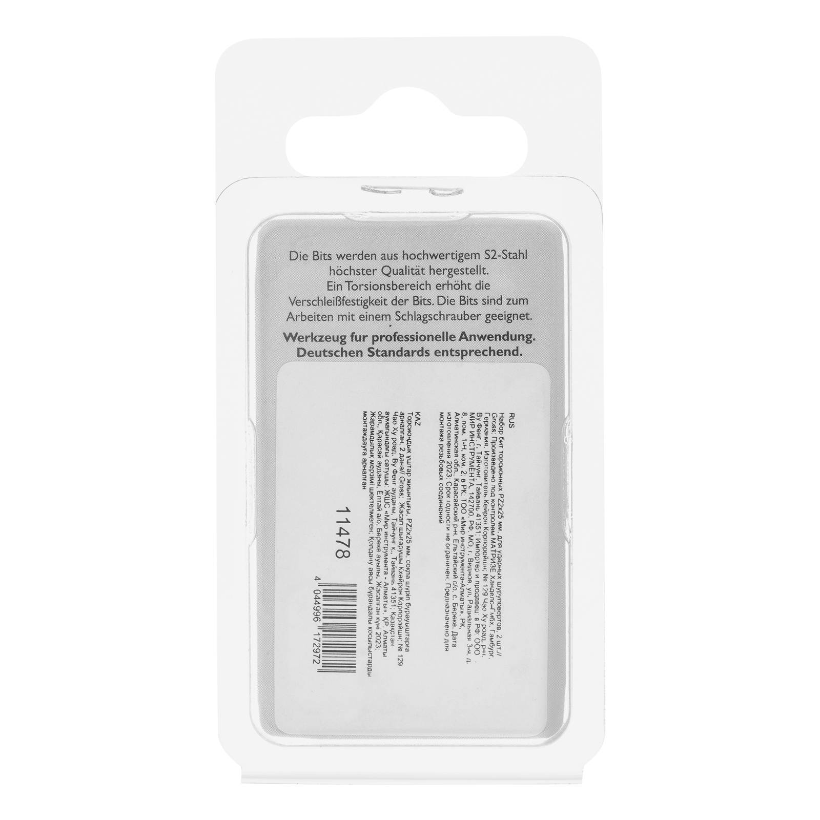 Набор торсионных бит PZ2 x 25 мм Gross 11478, 2 шт., предназначен для монтажа и демонтажа резьбовых соединений с помощью ударного шуруповерта. Он незаменим в строительных, слесарных и монтажных работах, в автосервисах, при проведении ремонта в доме. Торсионная зона способна пружинить, за счет чего она частично амортизирует тангенциальный удар от шуруповерта. Такое решение позволяет равномерно распределить нагрузку по бите и избежать поломки шлица.